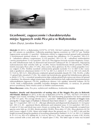 Ornis Polonica 2014, 55: 105–114 Liczebność, zagęszczenie i charakterystyka miejsc lęgowych sroki Pica pica w Białymstoku Adam Zbyryt, Jarosław Banach Abstrakt: W 2013 r. w Białymstoku (53°07’N; 23°10’E, 102 km2) wykryto 219 gniazd sroki, z czego 149 uznano za zasiedlone. Całkowitą populację lęgową oceniono na 149–157 par. Średnie zagęszczenie wyniosło 1,5 pary/km2. Wykazano różnice w zagęszczeniach gniazd sroki pomiędzy 3 wyróżnionymi strefami miasta (I – obszary otwarte bez zabudowy: x=1,4 pary/km2, SD=2,2; II – zabudowa willowa i rozproszona: x=4,0 pary/km2, SD=2,5; III – zabudowa wielorodzinna i tereny przemysłowe: x=0,4 pary/km2, SD=0,4). Pary lęgowe tworzyły wyraźne skupienia. Gniazda sroki zlokalizowane były na drzewach lub krzewach należących do 21 taksonów. Najczęściej wykorzystywana była wierzba Salix sp. (22,8%), brzoza brodawkowata Betula pendula (18,8%), świerk zwyczajny Picea abies (17,4%), olsza czarna Alnus glutinosa (8,1%) i wiśnia pospolita Cerasus vulgaris (5,4%). Średnia wysokość umieszczenia gniazda wyniosła 11,1 m (SD=5,46) i wzrastała w gradiencie urbanizacji (strefa I: x=9,7 m, SD=5,2; strefa II: x=11,5 m, SD=4,9; strefa III: x=14,0 m, SD=6,1). Zdecydowana większość gniazd posiadała daszek (N=138, 92,6%), a tylko 11 gniazd było otwartych (7,4%). Ten ostatni typ konstrukcyjny gniazd był zlokalizowany głównie w strefie I (72,7%), a wysokość posadowienia tego rodzaju gniazd była zazwyczaj niższa niż gniazd z daszkiem. Na obszarze całego miasta kępy drzew lub krzewów były najliczniej reprezentowanym mikrosiedliskiem lęgowym (70,5%), pojedyncze drzewa i ich szpalery stanowiły kolejno 20,1% i 9,4%. Sroki w Białymstoku zasiedliły wszystkie dostępne środowiska, co oznacza, że przeszły proces synurbizacji, który można uznać za średnio zaawansowany. Słowa kluczowe: sroka, Pica pica, wybiórczość siedliskowa, środowiska miejskie Numbers, density and characteristics of nesting sites of the Magpie Pica pica in Białystok (NE Poland). Abstract: In 2013, in the city of Białystok (53°07’N; 23°10’E, 102 km2) 219 nests of Magpie were found, including 149 inhabited. The total breeding population has been estimated at 149–157 pairs. The average density was 1.5 pairs/km2. Differences in densities of Magpie nests among the 3 major types of habitats in Białystok have been shown (I – open areas without buildings: x=1.4 pairs/km2, SD=2.2; II – villa type allotments and dispersed development: x=4.0 pairs/ km2, SD=2.5; III – apartment blocks allotments and industrial areas: x=0.4 pairs/km2, SD=0.4). A total of 21 tree and shrub taxa were chosen as nesting sites. The most frequently occupied tree species were Salix sp. (22.8%), Betula pendula (18.8%), Picea abies (17.4%), Alnus glutinosa (8.1%) and Cerasus vulgaris (5.4%). Mean nest height above the ground was 11.1 m (SD=5.46) and the height increased along the gradient of increasing urbanisation (habitat I: x=9.7 m, SD=5.2; habitat II: x=11.5 m, SD=4.9; habitat III: x=14.0 m, SD=6.1). The vast majority of nests (138, 92.6%) were covered with a roof, and only 11 stayed open (7.4%). The latter type of nests was located 105 mainly in the first habitat (72.7%), and they were placed usually lower than nests with a roof. Nests were located the most often among groups of trees (92.6% of nests), while single trees and tree avenues were occupied less frequently – 20.1% and 9.4%, respectively. The Magpie in Białystok colonized all the available urban habitats, suggesting that it can be considered as an urban species at an intermediate level of urbanisation process. Key words: Magpie, Pica pica, habitat selection, urban habitats Sroka występuje w całej Polsce, preferując obszary silnie zabudowane i gęsto zaludnione, unika natomiast zwartych i rozległych drzewostanów (Kuczyński & Chylarecki 2012, Tomiałojć & Stawarczyk 2003). W ciągu ostatnich kilku dziesięcioleci na terenie całego kraju odnotowuje się wyraźny wzrost jej liczebności na obszarach zurbanizowanych (Jerzak 2001, Luniak et al. 2001, Ptaszyk 2004). Na terenach tych zagęszczenia sroki są zdecydowanie wyższe niż w krajobrazie rolniczym (np. Bocheński et al. 2001, Wojciechowski et al. 2007, Kasprzykowski & Olton 2008, Jerzak et al. 2009). W centrach największych aglomeracji sroka pojawiła się już w latach 60. XX wieku (Luniak et al. 2001, Jerzak 2001, Tomiałojć & Stawarczyk 2003). Najliczniejsza jest na Wyżynie Śląskiej i Podkarpaciu, a mniej licznie zasiedla północną i północno-wschodnią Polskę. Krajową populację tego gatunku szacuje się na około 350 000 par (Kuczyński & Chylarecki 2012). Występowanie sroki w środowiskach miejskich w Polsce, szczególnie w zachodniej i centralnej części kraju jest dość dobrze poznane (np. Lesiński 1997, Luniak et al. 1997, Bocheński et al. 2001, Indykiewicz 2001, Ptaszyk 2004, Meissner & Duś 2005, Pakuła et al. 2005, Jerzak et al. 2009), ale znacznie mniej badań dotyczy wschodniej części kraju (Mitrus & Woźniak 2002, Biaduń 2005, Kasprzykowski & Olton 2008). Dotychczas brak było danych na temat tego gatunku z obszarów zurbanizowanych położonych w północno-wschodniej Polsce. Celem niniejszej pracy była ocena liczebności populacji lęgowej sroki w Białymstoku, jej preferencji siedliskowych oraz stopnia synurbizacji. Teren badań Badaniami objęto obszar o powierzchni 102 km2 położony w granicach administracyjnych Białegostoku (53°07’N; 23°10’E). Miasto liczy ok. 295 000 mieszkańców i po Warszawie cechuje się największą gęstością zaludnienia w Polsce (GUS 2011). Jego obszar leży w zasięgu makroregionu Niziny Północnopodlaskiej i w całości należy do zachodniej części mezoregionu Wysoczyzny Białostockiej (Kondracki 2013). Zgodnie z regionalizacją klimatologiczną Białystok znajduje się w podlaskim regionie klimatycznym, w subregionie białostockim. Region ten charakt