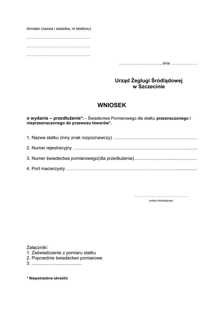 Armator (nazwa i siedziba, nr telefonu) …………………………………………… …………………………………………... …………………………………………... ……………………………, dnia ………………… Urząd Żeglugi Śródlądowej w Szczecinie WNIOSEK o wydanie – przedłużenie*: - Świadectwa Pomiarowego dla statku przeznaczonego / nieprzeznaczonego do przewozu towarów*. 1. Nazwa statku (inny znak rozpoznawczy) ……………………………………………….. 2. Numer rejestracyjny …………………………………………………………………......... 3. Numer świadectwa pomiarowego(dla przedłużenia).................................................. 4. Port macierzysty ……………………………………………………………….................. …………………………………………………….. podpis składającego Załączniki: 1. Zaświadczenie z pomiaru statku 2. Poprzednie świadectwo pomiarowe 3. ........................................ * Niepotrzebne skreślić