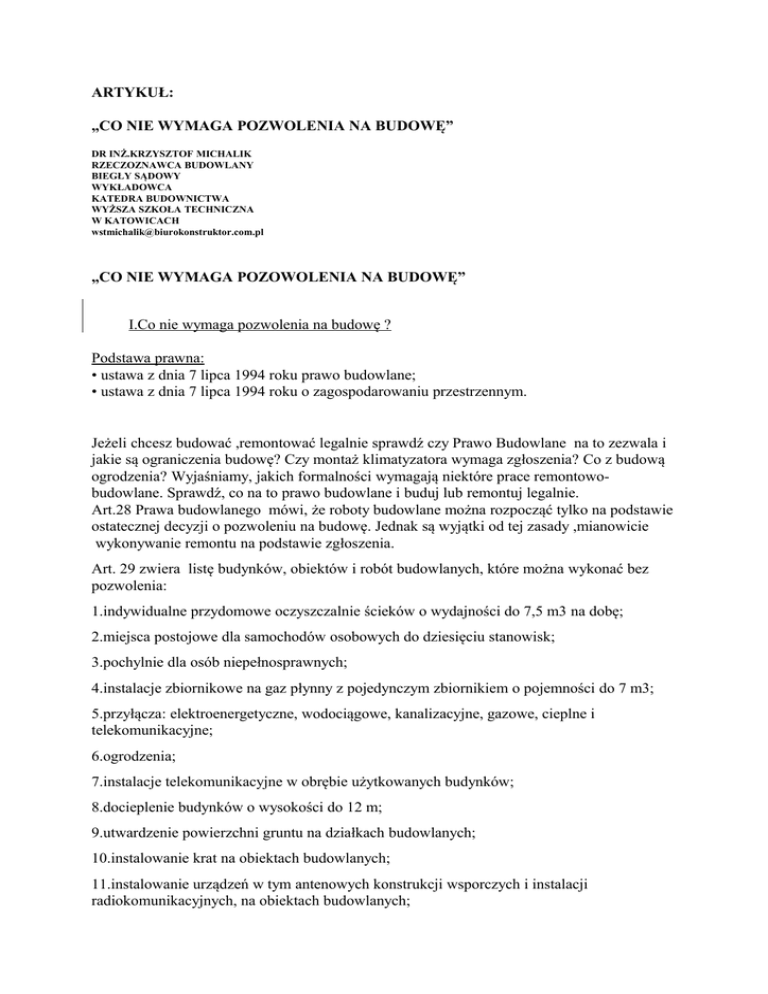 ARTYKUŁ: „CO NIE WYMAGA POZWOLENIA NA BUDOWĘ” DR INŻ.KRZYSZTOF MICHALIK RZECZOZNAWCA BUDOWLANY BIEGŁY SĄDOWY WYKŁADOWCA KATEDRA BUDOWNICTWA WYŻSZA SZKOŁA TECHNICZNA W KATOWICACH [email protected] „CO NIE WYMAGA POZOWOLENIA NA BUDOWĘ” I.Co nie wymaga pozwolenia na budowę ? Podstawa prawna: • ustawa z dnia 7 lipca 1994 roku prawo budowlane; • ustawa z dnia 7 lipca 1994 roku o zagospodarowaniu przestrzennym. Jeżeli chcesz budować ,remontować legalnie sprawdź czy Prawo Budowlane na to zezwala i jakie są ograniczenia budowę? Czy montaż klimatyzatora wymaga zgłoszenia? Co z budową ogrodzenia? Wyjaśniamy, jakich formalności wymagają niektóre prace remontowobudowlane. Sprawdź, co na to prawo budowlane i buduj lub remontuj legalnie. Art.28 Prawa budowlanego mówi, że roboty budowlane można rozpocząć tylko na podstawie ostatecznej decyzji o pozwoleniu na budowę. Jednak są wyjątki od tej zasady ,mianowicie wykonywanie remontu na podstawie zgłoszenia. Art. 29 zwiera listę budynków, obiektów i robót budowlanych, które można wykonać bez pozwolenia: 1.indywidualne przydomowe oczyszczalnie ścieków o wydajności do 7,5 m3 na dobę; 2.miejsca postojowe dla samochodów osobowych do dziesięciu stanowisk; 3.pochylnie dla osób niepełnosprawnych; 4.instalacje zbiornikowe na gaz płynny z pojedynczym zbiornikiem o pojemności do 7 m3; 5.przyłącza: elektroenergetyczne, wodociągowe, kanalizacyjne, gazowe, cieplne i telekomunikacyjne; 6.ogrodzenia; 7.instalacje telekomunikacyjne w obrębie użytkowanych budynków; 8.docieplenie budynków o wysokości do 12 m; 9.utwardzenie powierzchni gruntu na działkach budowlanych; 10.instalowanie krat na obiektach budowlanych; 11.instalowanie urządzeń w tym antenowych konstrukcji wsporczych i instalacji radiokomunikacyjnych, na obiektach budowlanych; 12.montaż wolno stojących kolektorów słonecznych. Art. 30 zawiera które z tych robót wymagają zgłoszenia. A Zatem pozwolenie czy zgłoszenie ????? 1.Adaptacja poddasza na pomieszczenia mieszkalne ,przebudowa poddasza - pozwolenie na budowę 2.Zmiana,wymiana i naprawa pokrycia dachu, więźby, rynien i rur spustowych zgłoszenie 3.Okna połaciowe, dachowe wstawienie bez zmiany konstrukcji dachu - zgłoszenie 4.Wykonanie lukarny na poddaszu w połaci dachu - pozwolenie na budowę 5.Zmiana konstrukcji dachu-pozwolenie 6.Montaż na budynku kolektorów słonecznych,anteny satelitarnej ,TV,klimatyzatora bez formalności 7.Wymiana stolarki okiennej lub drzwiowej bez ingerencji w ściany (bez powiększenia lub zmniejszenia otworów) - bez formalności 8.Zmiana wielkości lub wybicie nowych otworów okiennych albo drzwiowych pozwolenie na budowę 9.Zmiana układu funkcjonalnego budynku połączona z przebudową ścian konstrukcyjnych - pozwolenie na budowę 10.Likwidacja/wstawienie ścian działowych - zgłoszenie 11.Przebudowa stropu, schodów, wykonanie otworów w ścianach - pozwolenie na budowę 12.Dobudowa schodów zewnętrznych - pozwolenie na budowę 13.Malowanie ścian wewnątrz budynku - bez formalności 14.Tynkowanie ścian zewnętrznych, malowanie elewacji - zgłoszenie 15.Docieplenie budynków o wysokości do 12 m - zgłoszenie 16.Docieplenie budynków o wysokości ponad 12 m - pozwolenie na budowę 17.Wymiana posadzki w pomieszczeniach - bez formalności 18.Naprawa/wymiana instalacji elektrycznej, wodno-kanalizacyjnej, gazowej zgłoszenie 19.Poprowadzenie nowej instalacji gazowej - pozwolenie na budowę 20.Zainstalowanie systemu alarmowego w domu - bez formalności 21.Rozprowadzenie instalacji telekomunikacyjnych albo wewnętrznej sieci komputerowej - bez formalności 22.Wymiana kotła C.O. podgrzewacza ciepłej wody - zgłoszenie 22.Wymiana kominka - zgłoszenie 23.Budowa kominka i nowych przewodów dymowych,wentylacyjnych wewnątrz lub na zewnątrz domu - pozwolenie na budowę 24.Urządzenie sauny w domu - bez formalności 25.Wymiana grzejników - bez formalności 26.Naprawa izolacji ścian fundamentowych - zgłoszenie 27.Budowa pochylni dla osób niepełnosprawnych zgłoszenie 28.Utwardzenie powierzchni gruntu na działce budowlanej (na przykład ułożenie kostki brukowej) - zgłoszenie 29.Budowa miejsc postojowych dla samochodów osobowych (do dziesięciu stanowisk) zgłoszenie 30.Budowa ogrodzenia od strony ulicy lub ogrodzenia o wysokości powyżej 2,2 m zgłoszenie 31.Budowa ogrodzenia o wysokości do 2,2 m pomiędzy sąsiednimi działkami - bez formalności 32.Naprawa ogrodzenia - zgłoszenie 33.Wykonanie przyłącza do sieci kanalizacyjnej - zgłoszenie 34.Budowa szamba - pozwolenie na budowę 35.Budowa indywidualnej przydomowej oczyszczalni ścieków o wydajności do 7,5 m3 na dobę – zgłoszenie II.Jak ustrzec się przed skutkami samowoli budowlanej ? Wszelkie prace i roboty budowlane można rozpocząć jedynie na podstawie ostatecznej decyzji o pozwoleniu na budowę i zgłoszeniu tego faktu w Powiatowym Nadzorze Budowlanym. Wcześniejsze rozpoczęcie robót,lub prowadzenie robót bez decyzji niezgodne z prawem powoduje drastyczne konsekwencje . Zmiana zagospodarowania terenu polegająca w szczególności na wykonaniu, odbudowie, rozbudowie i nadbudowie obiektu budowlanego wymaga ustalenia warunków zabudowy i zagospodarowania terenu. Nie wymagane jest ustalenie warunków zabudowy w przypadku obowiązującego Miejscowego Planu Zagospodarowania Przestrzennego dla miejsca inwestycji. Nie wymagają ustalenia warunków zabudowy i zagospodarowania terenu: 1) roboty budowlane polegające na remoncie, montażu, przebudowie,zmianie przeznaczenia budynku lub jego części, jeżeli nie powodują zmiany sposobu zagospodarowania terenu, 2) roboty budowlane niewymagające pozwolenia na budowę. Rozpoczęcie robót budowlanych bez ostatecznej decyzji o pozwoleniu na budowę, określane jest jako samowola budowlana. W szczególnych przypadkach pozwolenie nie jest wymagane, wymagane jest zgłoszenie rozpoczęcia robót: 1.obiektów gospodarczych związanych z p