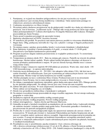 INFORMACJE DLA PIELGRZYMÓW DO ZIEMI ŚWIĘTEJ Z PARAFII OO. BERNARDYNÓW W LUBLINIE 25.09 – 02.10.2013 1. Pamiętamy, ze wyjazd ma charakter pielgrzymkowy (to nie jest wycieczka czy wyjazd wypoczynkowy) i jest swoistą formą modlitewny i rekolekcji. Takie nastawienie pomaga we właściwym przeżyciu odwiedzanych miejsc. 2. Codzienne uczestnictwo we Mszy świętej 3. Wcześniej należy duchowo przygotować się do pielgrzymki i modlić się o łaskę jej właściwego przeżycia. Jest to bowiem „wydarzenie życia”. Dlatego nikt swoją postawą nie może tego zepsuć. Zakaz pretensjonalności!!! Lektura obowiązkowa: Ewangelia Mateusza albo Łukasza. Dostępne przewodniki po Ziemi Świętej . 4. Warto przed wyjazdem przystąpić do spowiedzi świętej 5. Będziemy ubezpieczeni od NNW i kosztów leczenia 6. W samolocie jest posiłek. Po przylocie nad ranem pierwszy posiłek to wieczorna obiadokolacja. 7. Bagaż duży: 20kg, podręczny niewielki do 5 kg i nic z płynów i ostrego w bagażu podręcznym – wyrzucają. 8. Na miejscu mamy: autokar, przewodnika, hotele i wyżywienie (śniadanie i obiadokolację) 9. Rano będziemy wyjeżdżać z hotelu pomiędzy 6-8 godz., a wracać około 17-18:00 godz. Decydował o tym będzie każdorazowo przewodnik. 10. Program na pewno ulegnie małemu przestawieniu ze względów praktycznych. To zostawiamy przewodnikowi. 11. Temperatura na miejscu około 20 C. Buty na zmianę gdy zmoczy. Pantofle na wieczór do pokoju hotelowego. Można zabrać sandały. Warto zabrać kurtkę lub płaszcz chroniący od deszczu w sezonie pomiędzy październikiem a majem. W tym też okresie bywają chłodne noce i czasem wieją zimne wiatry. 12. Niektóre wstępy i miejscowe napiwki 80 USD płatne po przylocie. Warto min. mieć około 150 USD kieszonkowego – to sprawa indywidualna. 13. Gotówkę raczej drobniejszą po 10 – 20 USD. I do zakupów tylko dolary USA. Jak ktoś ma to szekle Izraelskie, ale niekoniecznie. Euro jest wymieniane po niekorzystnym kursie i nie wszędzie akceptowane. Można wziąć też kartę kredytową na wszelki wypadek. 14. Drobne pieniądze na tace z codziennej Mszy świętej. Przekazywane jest to na utrzymanie budynków Ziemi Świętej. Jest to stary pielgrzymkowy zwyczaj w Ziemi świętej 15. Do sklepu z pamiątkami zajedziemy specjalnie, gdzie dadzą nam upust około 20%. Dlatego prośba by nie spóźniać pielgrzymki. Na zakupy zawsze jest czas i towar ten sam wszędzie. 16. Zabrać leki jakie używamy. W razie niepewności skonsultować się wcześniej z własnym lekarzem. Warto zabrać coś na biegunkę czy od żołądka. 17. Hotele trzy gwiazdkowe dobrej klasy z łazienkami w pokojach. 18. Na miejscu wszystkim kieruje przewodnik do niego wszelkie zapytania. On też steruje realizacją programu w czasie dnia. 19. Dodatkowo napiwek dla przewodnika według uznania grupy 20. Wyjazd na lotnisko według programu. Powrót według programu 21. Zabrać strój kąpielowy – będzie chwila nad Morzem Martwym. 22. Gniazdka na prąd w hotelach izraelskich są standardowe ale na cienkie bolce. Ładowarki działają ale niektóre suszarki i żelazka polskie mają grube bolce. Przeważnie gniazdka w hotelach są przystosowane do potrzeb europejskich urządzeń. 23. Prośba aby w czasie trwania pielgrzymki nigdy nie spacerować samemu ale zawsze z kimś w towarzystwie. W Izraelu jak również w Autonomii Palestyńskiej jest bardzo bezpiecznie ale jak zawsze i wszędzie należy zachować zdrowy rozsądek. Zagrożenie przestępczością kryminalną nie jest wysokie. Z uwagi na zdarzające się kradzieże kieszonkowe szczególną ostrożność należy zachować w miejscach zatłoczonych i często odwiedzanych przez turystów (na plażach, bazarach, w środkach komunikacji). 24. Przykładowe ceny w przybliżeniu: paczka różańców 12szt z drzewa oliwnego ok 10$, z drzewa cytrynowego (chińszczyzna) 12 szt ok 4-5$, albumy o Ziemi Swietej po polsku niekiedy u kierowców ok 15$ a 2 filmy DVD - 25$. Falafel (miejscowy hamburger) z colą ok 8$. INFORMACJE DLA PIELGRZYMÓW DO ZIEMI ŚWIĘTEJ Z PARAFII OO. BERNARDYNÓW W LUBLINIE 25.09 – 02.10.2013 25. Stempel izraelski w paszporcie oznacza automatycznie brak możliwości wjazdu do Emiratów Arabskich, Libanu, Libii, Arabii Saudyjskiej i Syrii. Dlatego jeśli ktoś planuje wizytę w tych krajach, należy poprosić urzędnika w Izraelu o niestemplowanie paszportu zarówno przy przylocie jak i przy wylocie (na osobnej kartce wydawanej przez służby graniczne jest stemplowana tzw. flying visa). Nie ma natomiast problemu z wjazdem do Izraela przy uprzedniej bytności w krajach arabskich. 26. Należy pamiętać o odpowiednim stroju do wchodzenia do kościołów (wymagane jest zakrycie ramion i kolan). Przed niektórymi kościołami stoi specjalna policja obyczajowa! 27. Żadne specjalne szczepienia nie są wymagane. Jednak dla co wrażliwszych żołądków zalecana jest ostrożność jeśli chodzi o wodę z kranu. 28. Przepisy celne: Do Izraela turysta może wwieźć w gotówce środki finansowe w dowolnej walucie. Wartość dopuszczalnej do wwozu i wywozu kwoty w gotówce nie może przekroczyć 80 tys. ILS (obecnie ok. 21 tys. USD). Wwóz i wywóz większych kwot wymaga zezwolenia. Restrykcyjne przepisy fitosanitarne nie pozwalają wwozić otwartej żywności, roślin i chemikaliów. Ograniczeniom podlega również wwóz żywych zwierząt – zarówno domowych, jak i użytkowych. Wwóz i wywóz zwierząt domowych (np. psów, kotów) podlega przepisom międzynarodowym. Ponadto zakazuje się wwozu i wywozu stylizowanych monet, matryc do ich produkcji oraz urządzeń i automatów do gier hazardowych. Ograniczeniami objęty jest również wwóz napojów alkoholowych (o zawartości alkoholu poniżej 40% – do 2 l, powyżej 40% – 1 l), papierosów (400 szt.) i perfum (250 ml). Zakazany jest wwóz substancji narkotycznych. Nie wolno wywozić soli oraz błota z Morza Martwego (dopuszczalne są tylko te wytworzone