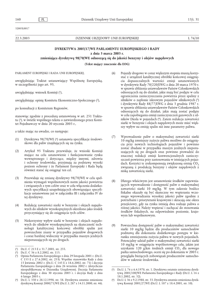 160 PL Dziennik Urzędowy Unii Europejskiej 13/t. 31 DZIENNIK URZĘDOWY UNII EUROPEJSKIEJ L 76/10 32003L0017 22.3.2003 DYREKTYWA 2003/17/WE PARLAMENTU EUROPEJSKIEGO I RADY z dnia 3 marca 2003 r. zmieniająca dyrektywę 98/70/WE odnoszącą się do jakości benzyny i olejów napędowych (Tekst mający znaczenie dla EOG) PARLAMENT EUROPEJSKI I RADA UNII EUROPEJSKIEJ, (6) Pojazdy drogowe w coraz większym stopniu muszą korzystać z urządzeń katalitycznej obróbki końcowej osiągnięcia dopuszczalnych wartości emisji ustanowionych w dyrektywie Rady 70/220/EWG z dnia 20 marca 1970 r. w sprawie zbliżenia ustawodawstw Państw Członkowskich odnoszących się do działań, jakie mają być podjęte w celu ograniczenia zanieczyszczania powietrza przez spaliny z silników o zapłonie iskrowym pojazdów silnikowych (5) i dyrektywie Rady 88/77/EWG z dnia 3 grudnia 1987 r. w sprawie zbliżenia ustawodawstw Państw Członkowskich odnoszących się do działań, jakie mają zostać podjęte w celu zapobiegania emisji zanieczyszczeń gazowych z silników Diesla w pojazdach (6). Zatem redukcja zawartości siarki w benzynie i olejach napędowych może mieć większy wpływ na emisję spalin niż inne parametry paliwa. (7) Wprowadzenie paliw o maksymalnej zawartości siarki 10 mg/kg zmniejszy zużycie paliwa możliwe do osiągnięcia przy nowych technologiach pojazdów i powinno zostać zbadane w przypadku maszyn jezdnych nieporuszających się po drogach oraz powinno prowadzić do znacznej redukcji emisji konwencjonalnych zanieczyszczeń powietrza przy zastosowaniu w istniejących pojazdach. Korzyści te zrekompensują zwiększoną emisję CO2 związaną z produkcją benzyny i olejów napędowych z niską zawartością siarki. (8) Dlatego właściwym jest ustanowienie środków zapewniających wprowadzenie i dostępność paliw o maksymalnej zawartości siarki 10 mg/kg. W tym zakresie bodźce fiskalne okazały się być skuteczne we wspieraniu wczesnego wprowadzania wysokiej jakości paliw zgodnie z potrzebami i priorytetami krajowymi i skracają one okres przejściowy, gdy na rynku istnieją dwa rodzaje paliwa o różnej jakości. Należy wspierać i zachęcać do stosowania środków fiskalnych, na odpowiednim poziomie, krajowym lub wspólnotowym. (9) Powszechna dostępność paliw o maksymalnej zawartości siarki 10 mg/kg będzie dla producentów samochodów podstawą dla dokonania dodatkowego postępu w kierunku zmniejszenia zużycia paliwa w nowych pojazdach. Potencjalny udział paliw o maksymalnej zawartości siarki 10 mg/kg w osiągnięciu wspólnotowego celu, jakim jest uzyskanie 120 g/km średnich emisji CO2 dla nowego parku samochodowego, oceni się po dokonaniu w 2003 r. przeglądu bieżących zobowiązań producentów samochodów w zakresie środowiska. uwzględniając Traktat ustanawiający Wspólnotę Europejską, w szczególności jego art. 95, uwzględniając wniosek Komisji (1), uwzględniając opinię Komitetu Ekonomiczno-Społecznego (2), po konsultacji z Komitetem Regionów, stanowiąc zgodnie z procedurą ustanowioną w art. 251 Traktatu (3), w świetle wspólnego tekstu o zatwierdzonego przez Komitet Pojednawczy w dniu 20 stycznia 2003 r., a także mając na uwadze, co następuje: (1) Dyrektywa 98/70/WE (4) ustanawia specyfikacje środowiskowe dla paliw znajdujących się na rynku. (2) Artykuł 95 Traktatu przewiduje, że wnioski Komisji mające na celu ustanowienie i funkcjonowanie rynku wewnętrznego i dotyczące, między innymi, zdrowia i ochrony środowiska, przyjmują za podstawę wysoki poziom ochrony i że Parlament Europejski i Rada będą również starać się osiągnąć ten cel. (3) Przewiduje się zmianę dyrektywy 98/70/WE w celu spełnienia wymagań wspólnotowych norm jakości powietrza i związanych z tym celów oraz w celu włączenia dodatkowych specyfikacji uzupełniających obowiązujące specyfikacje ustanowione już w załączniku III i załączniku IV do tej dyrektywy. (4) Redukcję zawartości siarki w benzynie i olejach napędowych do silników wysokoprężnych określono jako środek przyczyniający się do osiągnięcia tych celów. (5) Niekorzystny wpływ siarki w benzynie i olejach napędowych do silników wysokoprężnych na skuteczność technologii katalitycznej końcowej obróbki spalin jest powszechnie znany w przypadku pojazdów drogowych i coraz bardziej widoczny w przypadku maszyn jezdnych nieporuszających się po drogach. (1) Dz.U. C 213 E z 31.7.2001, str. 255. (2) Dz.U. C 36 z 8.2.2002, str. 115. (3) Opinia Parlamentu Europejskiego z dnia 29 listopada 2001 r. (Dz.U. C 153 E z 27.6.2002, str. 253). Wspólne stanowisko Rady z dnia 15 kwietnia 2002 r. (Dz.U. C 145 E z 18.6.2002, str. 71) i decyzja Parlamentu Europejskiego z dnia 26 września 2002 r. (dotychczas nieopublikowana w Dzienniku Urzędowym). Decyzja Parlamentu Europejskiego z dnia 30 stycznia 2003 r. i decyzja Rady z dnia 6 lutego 2003 r. (4) Dz.U. L 350 z 28.12.1998, str. 58. Dyrektywa ostatnio zmieniona dyrektywą Komisji 2000/71/WE (Dz.U. L 287 z 14.11.2000, str. 46). (5) Dz.U. L 76 z 6.4.1970, str. 1. Dyrektywa ostatnio zmieniona dyrektywą 2001/100/WE Parlamentu Europejskiego i Rady (Dz.U. L 16 z 18.1.2002, str. 32). (6) Dz.U. L 36 z 9.2.1988, str. 33. Dyrektywa ostatnio zmieniona dyrektywą Komisji 2001/27/WE (Dz.U. L 107 z 18.4.2001, str. 10). 13/t. 31 (10) (11) (12) (13) PL Dziennik Urzędowy Unii Europejskiej 161 Należy zapewnić, aby od dnia 1 stycznia 2005 r. wystarczające ilości benzyny i olejów napędowych o maksymalnej zawartości siarki 10 mg/kg były dostępne z uwzględnieniem odpowiednich kryteriów geograficznych celem umożliwienia swobodnego obrotu nowych pojazdów wymagających tych paliw, jednocześnie zapewniając, żeby redukcje emisji CO2 z nowych pojazdów były większe od dodatkowych emisji tego gazu związaną z produkcją tych paliw. (14) Właściwym jest aby przewidzieć jednolity system kontroli jakości paliwa lub krajowy system, który zapew