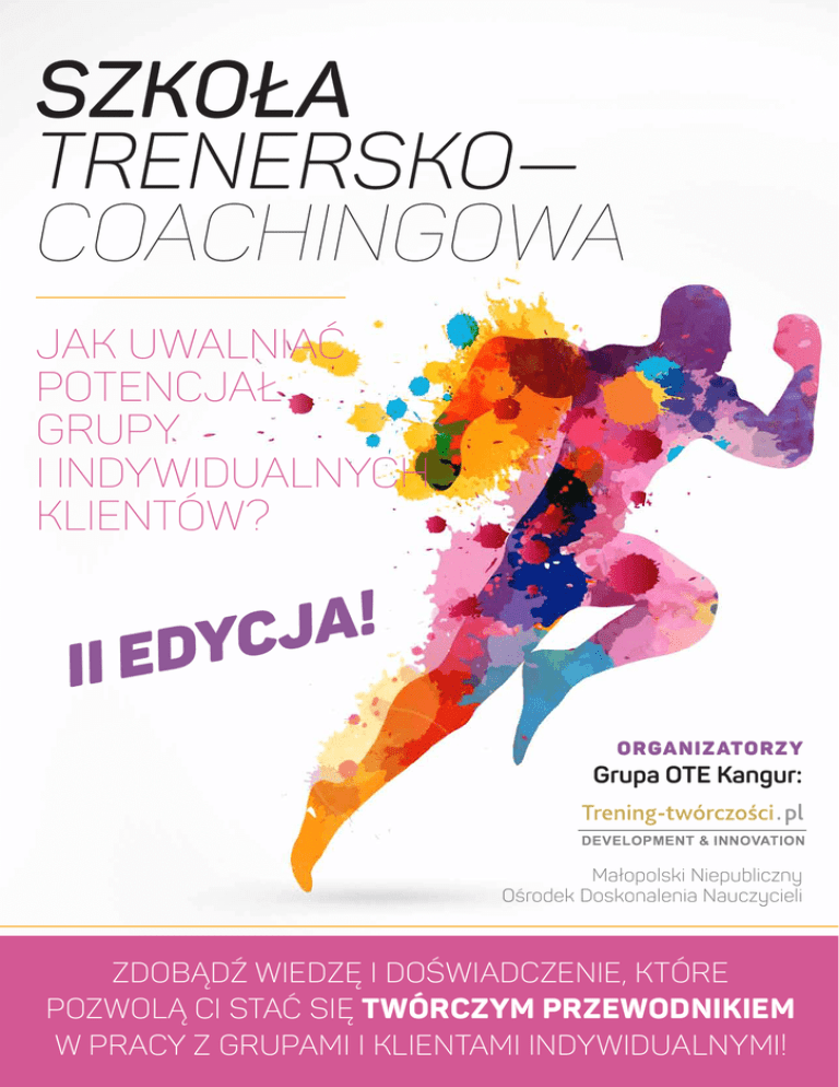 SZKOŁA TRENERSKO— COACHINGOWA JAK UWALNIAĆ POTENCJAŁ GRUPY I INDYWIDUALNYCH KLIENTÓW? II ! A J C Y D E ORGANIZATORZY Grupa OTE Kangur: Małopolski Niepubliczny Ośrodek Doskonalenia Nauczycieli ZDOBĄDŹ WIEDZĘ I DOŚWIADCZENIE, KTÓRE POZWOLĄ CI STAĆ SIĘ TWÓRCZYM PRZEWODNIKIEM W PRACY Z GRUPAMI I KLIENTAMI INDYWIDUALNYMI! Jestem bardzo zadowolona z wyboru OTE Kangur i ich oferty, będącej połączeniem szkoły trenerskiej i coachingowej – dwóch wzajemnie uzupełniających się obszarów. Zajęcia to przede wszystkim warsztaty praktyczne, które umożliwiają naukę przez własne doświadczenie, a przez to lepsze ugruntowanie zdobywanej wiedzy. Organizacja zajęć, program, doświadczenie prowadzących i dbałość o każdego uczestnika to tylko kilka z zalet tej szkoły. Niewielka grupa uczestników, profesjonalizm organizatorów/trenerów i przyjazna, wyjątkowa atmosfera sprzyjają nie tylko nauce, ale też lepszemu poznaniu samego siebie i nawiązaniu wartościowych relacji. Szczerze polecam! Regina – A J C Y D E I e i n i p w o ó k i n t s e z c u Szkoła Trenersko Coachingowa, na którą się zdecydowałem pozwala rozwinąć i udoskonalić swój warsztat pracy, jako psychologa. Dzięki zajęciom można poznać wiele cennych technik, do zastosowania w pracy z młodzieżą, grupami i poznać nowe techniki i metody szkoleniowe. Mimo obecności na wielu konferencjach, warsztatach to program szkoły daje konkretne narzędzia do wykorzystania w praktyce. Ze zjazdu na zjazd jest coraz ciekawiej i warto zdecydować się na taką formę doskonalenia własnego. Gorąco polecam. Mariusz Zajęcia w Szkole Trenersko-Coachingowej są super. Bardzo dobrze zorganizowane w kameralnej grupie, gdzie każdy ma możliwość brać w nich aktywny udział i razem pracować. Zjazdy wekendowe dają możliwość osobom pracującym na dobra frekwencję. Komfortowo rozłożony czas zajęć wraz z posiłkami daje poczucie zaopiekowania się grupą i jej potrzebami. Profesjonalnie przygotowane i prowadzone zajęcia bez nacisku i presji czasu. Bardzo mili i otwarci w relacjach trenerzy. Duża ilość materiałów do ręki a oprócz tego wymiana uwag i myśli meilowo. Przyjazna, fantastyczna atmosfera i komfortowe warunki nauki. Gorąco polecam wszystkim zainteresowanym. Iwona KANGUROWA SZKOŁA TRENERSKO— COACHINGOWA CO NAS WYRÓŻNIA? • W naszej szkole uczymy pracy trenerskiej i coachingowej z naciskiem na obszar uwalniania potencjału kreatywnego grupy i indywidualnych klientów. • Mamy 18-letnie doświadczenie w prowadzeniu szkoleń – wiemy jak robić to dobrze! W szkole otrzymasz rzetelną wiedzę, ale przede wszystkim nabędziesz praktyczne umiejętności przydatne w pracy trenera i coacha. • Rozwijamy twórczość i kreatywność! Prowadzimy szkolenia i treningi twórczości – dla nauczycieli i pracowników firm, oparte o autorskie programy. W szkole nauczysz się wykorzystywania technik twórczego myślenia i rozwiązywania problemów (w życiu osobistym i zawodowym). • Mamy wysoko wykwalifikowaną i doświadczoną kadrę. Prowadząc szkolenia nasi trenerzy kładą szczególny nacisk na praktyczne aspekty zdobywanej wiedzy i umiejętności oraz budowanie atmosfery sprzyjającej efektywnej pracy. • Posiadamy akredytację Małopolskiego Kuratora Oświaty. SZKOŁA DEDYKOWANA JEST WSZYSTKIM, KTÓRZY: • są zainteresowani praktycznym przygotowaniem do pracy w charakterze trenera i/lub coacha, • pracują już jako trenerzy i/lub coachowie i chcą rozwinąć swoje kompetencje w tym zakresie, • pracują z różnymi klientami i chcą wykorzystywać narzędzia trenerskie bądź coachingowe, w pracy zawodowej, • pracują z grupami i chcą zwiększyć swoje umiejętności związane z odkrywaniem i uwalnianiem ich kreatywnego potencjału, • chcą uwolnić własny, twórczy potencjał i są zainteresowani samorozwojem. SZKOŁA OBEJMUJE 11 ZJAZDÓW; ŁĄCZNIE 220 GODZIN ZEGAROWYCH (293 GODZINY DYDAKTYCZNE) . ZAKRES GODZINOWY SZKOŁY UMOŻLIWIA UBIEGANIE SIĘ O: • • • rekomendację Polskiego Towarzystwa Psychologicznego - trenera warsztatu umiejętności psychospołecznych, akredytację Izby Coachingu, akredytację International Coach Federation Polska (Associated Certified Coach ACC). KANGUROWA SZKOŁA TRENERSKO— COACHINGOWA W PROGRAMIE m.in.: 1. Zawód trener/zawód coach - modele kompetencji, analiza potencjału uczestników, rozwijanie indywidualnego stylu pracy trenera/coacha. 2. Praca z grupą: proces grupowy, komunikacja, zakłócenia. 3. Metodologia prowadzenia szkoleń, narzędzia pracy trenera. 4. Identyfikacja i analiza potrzeb szkoleniowych. 5. Projektowanie, prowadzenie i ewaluacja szkoleń. 6. Techniki uczenia dorosłych, kreatywność pracy z grupą. 7. Standardy etyczne w prowadzeniu szkoleń i coachingu. 8. Komunikacja i budowanie relacji w coachingu, radzenie sobie z zakłóceniami. 9. Różnorodne podejścia, metody i techniki coachingowe. 10.S truktura sesji coachingowych. 11.Proces coachingu i monitorowanie postępów osiągania celów. 12.Odkrywanie i rozwijanie zasobów klienta. 13.Narzędzia coachingowe służące zmianie perspektywy. TERMINY ZJAZDÓW: PLANOWANY HARMONOGRAM ZJAZDÓW W 2016 ROKU: luty–grudzień 2017 r. • 11-13 marca • 9-11 września • 1-3 kwietnia • 30-2 września/października • 22-24 kwietnia • 21-23 października KOSZT UDZIAŁU W SZKOLE TRENERSKO-COACHINGOWEJ WYNOSI: • 13-15 maja • 18-20 listopada 4900 ZŁ NETTO (ISTNIEJE MOŻLIWOŚĆ ROZŁOŻENIA PŁATNOŚCI NA RATY). • 3-5 czerwca • 9-11 grudnia • OBEJMUJE: 24-26 czerwca CENA • 220 godzin zegarowych kursu, • bogate materiały szkoleniowe, • obiad w soboty i niedziele. MOŻLIWOŚĆ UZYSKANIA DOFINANSOWANIA NA SZKOLENIE!* *Dofinansowanie zawarte jest w regulaminie określającym zasady udzielania dofinansowania do specjalistycznych szkoleń dla nauczycieli zatrudnionych w szkołach i placówkach prowadzonych przez Gminę Miejską Kraków. Zarządzeni