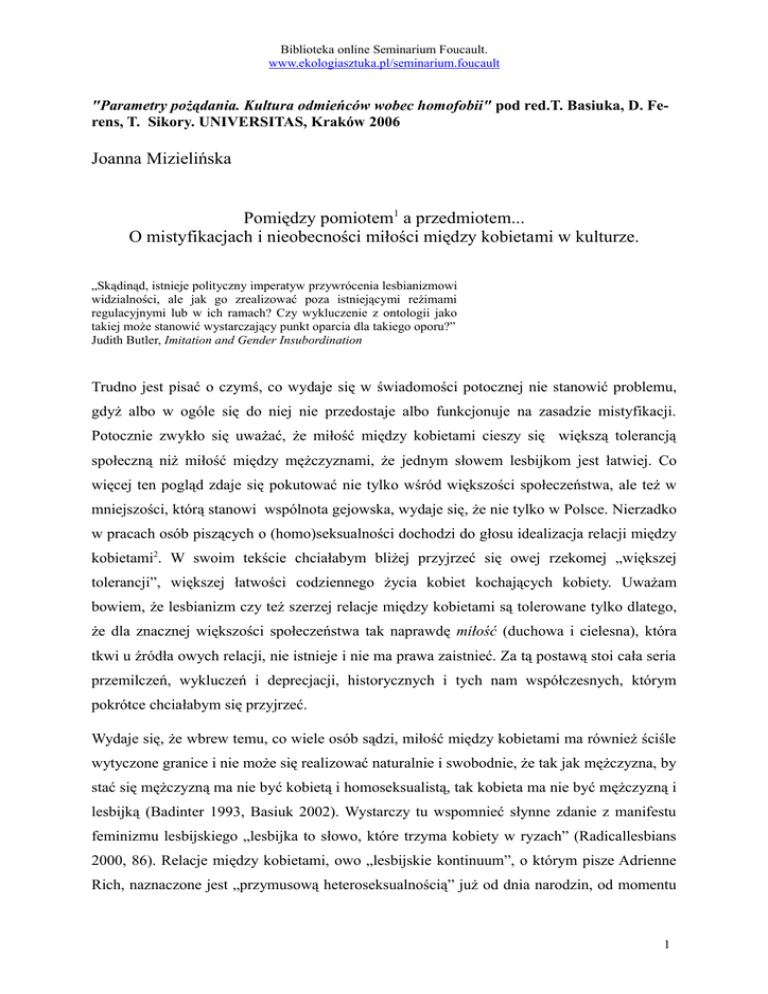 Biblioteka online Seminarium Foucault. www.ekologiasztuka.pl/seminarium.foucault "Parametry pożądania. Kultura odmieńców wobec homofobii" pod red.T. Basiuka, D. Ferens, T. Sikory. UNIVERSITAS, Kraków 2006 Joanna Mizielińska Pomiędzy pomiotem1 a przedmiotem... O mistyfikacjach i nieobecności miłości między kobietami w kulturze. „Skądinąd, istnieje polityczny imperatyw przywrócenia lesbianizmowi widzialności, ale jak go zrealizować poza istniejącymi reżimami regulacyjnymi lub w ich ramach? Czy wykluczenie z ontologii jako takiej może stanowić wystarczający punkt oparcia dla takiego oporu?” Judith Butler, Imitation and Gender Insubordination Trudno jest pisać o czymś, co wydaje się w świadomości potocznej nie stanowić problemu, gdyż albo w ogóle się do niej nie przedostaje albo funkcjonuje na zasadzie mistyfikacji. Potocznie zwykło się uważać, że miłość między kobietami cieszy się większą tolerancją społeczną niż miłość między mężczyznami, że jednym słowem lesbijkom jest łatwiej. Co więcej ten pogląd zdaje się pokutować nie tylko wśród większości społeczeństwa, ale też w mniejszości, którą stanowi wspólnota gejowska, wydaje się, że nie tylko w Polsce. Nierzadko w pracach osób piszących o (homo)seksualności dochodzi do głosu idealizacja relacji między kobietami2. W swoim tekście chciałabym bliżej przyjrzeć się owej rzekomej „większej tolerancji”, większej łatwości codziennego życia kobiet kochających kobiety. Uważam bowiem, że lesbianizm czy też szerzej relacje między kobietami są tolerowane tylko dlatego, że dla znacznej większości społeczeństwa tak naprawdę miłość (duchowa i cielesna), która tkwi u źródła owych relacji, nie istnieje i nie ma prawa zaistnieć. Za tą postawą stoi cała seria przemilczeń, wykluczeń i deprecjacji, historycznych i tych nam współczesnych, którym pokrótce chciałabym się przyjrzeć. Wydaje się, że wbrew temu, co wiele osób sądzi, miłość między kobietami ma również ściśle wytyczone granice i nie może się realizować naturalnie i swobodnie, że tak jak mężczyzna, by stać się mężczyzną ma nie być kobietą i homoseksualistą, tak kobieta ma nie być mężczyzną i lesbijką (Badinter 1993, Basiuk 2002). Wystarczy tu wspomnieć słynne zdanie z manifestu feminizmu lesbijskiego „lesbijka to słowo, które trzyma kobiety w ryzach” (Radicallesbians 2000, 86). Relacje między kobietami, owo „lesbijskie kontinuum”, o którym pisze Adrienne Rich, naznaczone jest „przymusową heteroseksualnością” już od dnia narodzin, od momentu 1 Biblioteka online Seminarium Foucault. www.ekologiasztuka.pl/seminarium.foucault kiedy dziewczynkę nazwie się dziewczynką a chłopca chłopcem. Już w tym momencie obydwie płcie wchodzą w ramy heteroseksualnego kontraktu i obydwu za jago złamanie grożą poważne sankcje3. Czy fakt, że dziewczynki mogą się obejmować, całować, przytulać czy też w inny sposób okazywać sobie przywiązanie oznacza, że tolerancja w stosunku do lesbijek jest większa? Czy nie jest to czasami tolerancja wobec czułostkowości kobiecej, wzmacniana w procesie socjalizacji? Czy nie jest też tak, że owo zachowanie jest tolerowane u kobiet, które swym wyglądem, zachowaniem, stylem nie wzbudzają podejrzeń co do heteroseksualności własnej orientacji? Przecież w pewnym momencie ta tolerancja wygasa. Oczywiście dwie kobiety mogą mieszkać razem, a w przypadku dwu mężczyzn budzi to jednoznaczne podejrzenie, co też oznacza, że ich mieszkanie razem niesie za sobą pojawienie się w świadomości społecznej właściwej rangi owej relacji, podczas gdy w przypadku kobiet, taka świadomość prawie nigdy nie istnieje. Ale czy fakt, że można mieszkać „spokojnie” (a na ile i gdzie spokojnie to też sprawa do dyskusji) oznacza, że społeczeństwo toleruje, że się ze sobą śpi, że się kocha? Czy owa „tolerancja” wie, co toleruje? Czy traktuje poważnie przedmiot własnych postaw? Czy fakt, że nikt nas nie zaczepia i nie dostrzega (oczywiście jeśli się nie „afiszujemy”), równoznaczny jest z akceptacją? Czy nie oznacza bycia tolerowaną za cenę nie-bycia sobą, nawet jeśli owo niebycie sobą miałoby jedynie oznaczać nie bycie lesbijką w czyjejś świadomości?4 W moim przekonaniu, owa tolerancja wzmacnia niewidoczność, nie-istnienie. Stanowi narzędzie wymazywania, jedną z wielu strategii przemilczeń, którą należy przestać mitologizować, a warto przyjrzeć się jej z bliska i zastanowić, jak można ją przełamać. „Miłość (podkreślenie moje –j.m.) między kobietami ma zapach piekła” Marie–Jo Bonnet rozpoczynając od tych słów swoją książkę, nie przez przypadek pisze o miłości. Samowystarczalność kobiet żyjących w relacjach lesbijskich wydaje się nie dawać spokoju mężczyznom od wieków. Bonnet pokazuje tę ich obsesję na przykładzie kompulsywnego powracania do mitu Safony i tworzenia jego kolejnych wersji, w której jej trybadyzm/lesbijskość stopniowo zanikają. Wydaje się, że najlepszą, podtrzymywaną przez wieki, strategią negowania miłości między kobietami jest przemilczanie i zacieranie jej śladów (na marginesie należy dodać, że dzieła Safony w większości nie ocalały). Jak zauważa autorka, od Gomory nie wywodzi się nazwa żadnego grzechu, co związane jest z tym, że dla Kościoła zagrożenie ze strony kobiet ma charakter społeczny a nie seksualny. Brak też 2 Biblioteka online Seminarium Foucault. www.ekologiasztuka.pl/seminarium.foucault wzmianek na temat „lubieżności” między kobietami w dziełach katolickich powstających w początkach dwudziestego wieku, ponieważ „nie można mówić o rozkoszy, gdy brakuje podstawowego narzędzia” (Bonnet 1997, 32). Żadne szczególne ustawodawstwo nie zakazywało miłości między kobietami. I można się spierać, czy to lepiej czy gorzej? Czy lepiej stano