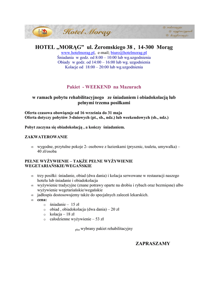 HOTEL „MORĄG” ul. Żeromskiego 38 , 14-300 Morąg www.hotelmorag.pl, e-mail; [email protected] Śniadania w godz. od 8:00 – 10:00 lub wg.uzgodnienia Obiady w godz. od 14:00 – 16:00 lub wg. uzgodnienia Kolacje od 18:00 – 20:00 lub wg.uzgodnienia Pakiet - WEEKEND na Mazurach w ramach pobytu rehabilitacyjnego ze śniadaniem i obiadokolacją lub pełnymi trzema posiłkami Oferta czasowa obowiązuje od 16 września do 31 maja Oferta dotyczy pobytów 3-dniowych (pt., sb., ndz.) lub weekendowych (sb., ndz.) Pobyt zaczyna się obiadokolacją , a kończy śniadaniem. ZAKWATEROWANIE • wygodne, przytulne pokoje 2- osobowe z łazienkami (prysznic, toaleta, umywalka) – 40 zł/osoba PEŁNE WYŻYWIENIE – TAKŻE PEŁNE WYŻYWIENIE WEGETARIAŃSKIE/WEGAŃSKIE • • • • trzy posiłki: śniadanie, obiad (dwa dania) i kolacja serwowane w restauracji naszego hotelu lub śniadanie i obiadokolacja wyżywienie tradycyjne (znane potrawy oparte na drobiu i rybach oraz bezmięsne) albo wyżywienie wegetariańskie/wegańskie jadłospis dostosowujemy także do specjalnych zaleceń lekarskich. cena: o śniadanie – 15 zł o obiad , obiadokolacja (dwa dania) – 20 zł o kolacja – 18 zł o całodzienne wyżywienie – 53 zł plus wybrany pakiet rehabilitacyjny ZAPRASZAMY