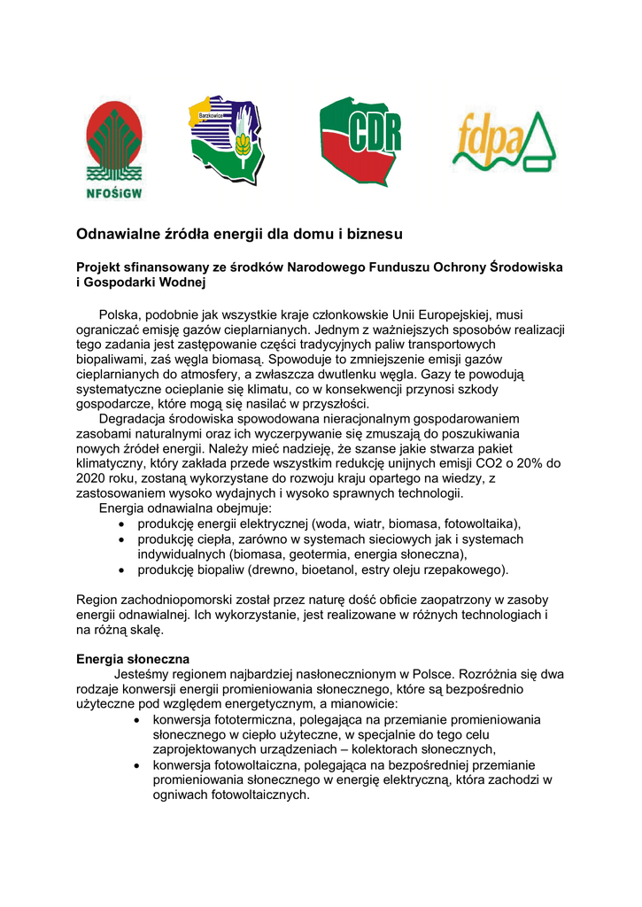 Odnawialne ród a energii dla domu i biznesu Projekt sfinansowany ze rodków Narodowego Funduszu Ochrony rodowiska i Gospodarki Wodnej Polska, podobnie jak wszystkie kraje cz onkowskie Unii Europejskiej, musi ogranicza emisj gazów cieplarnianych. Jednym z wa niejszych sposobów realizacji tego zadania jest zast powanie cz ci tradycyjnych paliw transportowych biopaliwami, za w gla biomas . Spowoduje to zmniejszenie emisji gazów cieplarnianych do atmosfery, a zw aszcza dwutlenku w gla. Gazy te powoduj systematyczne ocieplanie si klimatu, co w konsekwencji przynosi szkody gospodarcze, które mog si nasila w przysz ci. Degradacja rodowiska spowodowana nieracjonalnym gospodarowaniem zasobami naturalnymi oraz ich wyczerpywanie si zmuszaj do poszukiwania nowych róde energii. Nale y mie nadziej , e szanse jakie stwarza pakiet klimatyczny, który zak ada przede wszystkim redukcj unijnych emisji CO2 o 20% do 2020 roku, zostan wykorzystane do rozwoju kraju opartego na wiedzy, z zastosowaniem wysoko wydajnych i wysoko sprawnych technologii. Energia odnawialna obejmuje: produkcj energii elektrycznej (woda, wiatr, biomasa, fotowoltaika), produkcj ciep a, zarówno w systemach sieciowych jak i systemach indywidualnych (biomasa, geotermia, energia s oneczna), produkcj biopaliw (drewno, bioetanol, estry oleju rzepakowego). Region zachodniopomorski zosta przez natur do obficie zaopatrzony w zasoby energii odnawialnej. Ich wykorzystanie, jest realizowane w ró nych technologiach i na ró skal . Energia s oneczna Jeste my regionem najbardziej nas onecznionym w Polsce. Rozró nia si dwa rodzaje konwersji energii promieniowania s onecznego, które s bezpo rednio yteczne pod wzgl dem energetycznym, a mianowicie: konwersja fototermiczna, polegaj ca na przemianie promieniowania onecznego w ciep o u yteczne, w specjalnie do tego celu zaprojektowanych urz dzeniach – kolektorach s onecznych, konwersja fotowoltaiczna, polegaj ca na bezpo redniej przemianie promieniowania s onecznego w energi elektryczn , która zachodzi w ogniwach fotowoltaicznych. Energia geotermalna Energia geotermalna jest wewn trznym ciep em Ziemi nagromadzonym w ska ach oraz w wodach wype niaj cych pory i szczeliny skalne. Zachodniopomorskie le y w rejonie zasobnym w energie geotermaln w tzw. pasie szczeci sko – ódzkim. Aktualnie zosta y uruchomione i dzia aj dwie geotermie: w Stargardzie Szczeci skim i Pyrzycach. Energia wodna Energia wodna ma najwi ksze tradycje w Polsce w zakresie wykorzystania odnawialnych róde energii, pomimo niewielkiego, w odniesieniu do powierzchni kraju, potencja u hydroenergetycznego. Najwi ksza koncentracja elektrowni du ych i rednich mocy wyst puje na zachodzie i po udniu kraju. W zachodniopomorskim s mo liwo ci rozwoju ma ej energetyki wodnej na niektórych rzekach np. na Pars cie, która ma charakter rzeki górskiej. Obecnie w województwie posiadamy 111 elektrowni wodnych, o cznej mocy zainstalowanej 13,11 MW i w planach jest budowa sze ciu elektrowni wodnych. Energia wiatru W naszym kraju potencja energetyczny wiatru jest znacz cy. Uwa a si , e na 1/3 powierzchni Polski istniej odpowiednie warunki do rozwoju energetyki wiatrowej. W pasie nadmorskim s szczególnie dobre warunki wietrzne, gdzie stawiane farmy wiatrowe. W rejonie Wolina i Dar owa dzia aj najwi ksze w Polsce farmy elektrowni wiatrowych. Energia biomasy Rolniczy charakter województwa oraz du e ilo ci obszarów le nych jednoznacznie pokazuj ogromne mo liwo ci regionu w dostarczaniu surowców energetycznych funkcjonuj cych pod nazw „biomasa”. ród ami biomasy wykorzystywanej jako paliwo sta e s : s oma i inne pozosta ci ro linne stanowi ce materia odpadowy przy produkcji rolniczej, plantacje ro lin energetycznych tzn. uprawianych dla uzyskania biomasy, drewno pochodz ce z lasów, przesiek i z przemys u drzewnego, sadów, itp., organiczne pozosta ci i odpady ulegaj ce biodegradacji. Pompy ciep a Pompa ciep a jest urz dzeniem umo liwiaj cym wykorzystanie ciep a z otaczaj cego nas rodowiska do celów grzewczych. ród em ciep a w otaczaj cym nas rodowisku jest powietrze, grunt, wody powierzchniowe i podziemne, a tak e ciep o odpadowe powstaj ce w procesach produkcyjnych lub podczas wentylacji pomieszcze . Te ród a s okre lane jako dolne ród o ciep a pomp ciep a. Pompa ciep a, pobieraj c z otoczenia ciep o niskotemperaturowe za pomoc energii elektrycznej nap dzaj cej spr ark , podnosi je na wy szy poziom energetyczny, do temperatur umo liwiaj cych ogrzewanie budynków oraz przygotowanie ciep ej wody u ytkowej. Instalacje grzewcze centralnego ogrzewania czy przygotowywania ciep ej wody u ytkowej s okre lane jako górne ród o ciep a. 2 Podsumowuj c stan istniej cy wykorzystania zasobów energii odnawialnej w województwie zachodniopomorskim, mo na dokona pozytywnej oceny, je li za kryterium przyjmiemy porównanie z innymi obszarami kraju. Wychodz c naprzeciw tym wyzwaniom Fundacja na rzez Rozwoju Polskiego Rolnictwa w partnerstwie z Centrum Doradztwa Rolniczego w Brwinowie realizuje projekt „Odnawilne ród a energii dla domu i biznesu.” Realizowany projekt wpisuje si w polityk energetyczn Polski jak te w projekt programu rz dowego dotycz cego odnawialnych róde energii, zak adaj cego wykorzystanie biomasy na cele energetyczne. Realizowany rz dowy program budowa biogazowi rolniczych przyniesie wsi dodatkowy dochód, umocni podstawy ekonomiczne rolnictwa, stworzy na obszarach wiejskich dodatkowe miejsca pracy, poprawi sytuacj ekonomiczn gmin, przyczyni si do rozwoju obszarów wiejskich. Celem realizowanego projektu jest kompleksowe i efektywne edukowanie i informowanie mieszka ców obszarów wiejskich z zakresu odnawialnych róde energii, zmian klimatu ich wp ywu na rolnictwo i obszary wiejskie. Dnia 2 lipca 2010 r. odby o si w Barzkowicach seminarium dla doradców rolnych tworz cych Powiatowe Punkty Konsultacyjne ds. OZE przy Terenowych Zespo ach Doradców Zachodniopomorskiego O rodka Doradztwa Rolniczego. Przeszkoleni doradcy b udzielali p