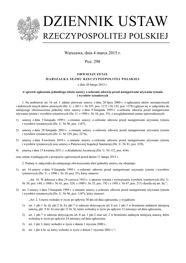 DZIENNIK USTAW RZECZYPOSPOLITEJ POLSKIEJ Warszawa, dnia 4 marca 2015 r. Poz. 298 O B W IE S ZC ZE N I E M ARS ZA ŁK A S EJ M U R ZE C ZY P O S PO LI T EJ PO L SK I EJ z dnia 20 lutego 2015 r. w sprawie ogłoszenia jednolitego tekstu ustawy o ochronie zdrowia przed następstwami używania tytoniu i wyrobów tytoniowych 1. Na podstawie art. 16 ust. 1 zdanie pierwsze ustawy z dnia 20 lipca 2000 r. o ogłaszaniu aktów normatywnych i niektórych innych aktów prawnych (Dz. U. z 2011 r. Nr 197, poz. 1172 i Nr 232, poz. 1378) ogłasza się w załączniku do niniejszego obwieszczenia jednolity tekst ustawy z dnia 9 listopada 1995 r. o ochronie zdrowia przed następstwami używania tytoniu i wyrobów tytoniowych (Dz. U. z 1996 r. Nr 10, poz. 55), z uwzględnieniem zmian wprowadzonych: 1) ustawą z dnia 5 listopada 1999 r. o zmianie ustawy o ochronie zdrowia przed następstwami używania tytoniu i wyrobów tytoniowych (Dz. U. Nr 96, poz. 1107), 2) ustawą z dnia 28 listopada 2003 r. o zmianie ustawy o ochronie zdrowia przed następstwami używania tytoniu i wyrobów tytoniowych (Dz. U. Nr 229, poz. 2274), 3) ustawą z dnia 8 kwietnia 2010 r. o zmianie ustawy o ochronie zdrowia przed następstwami używania tytoniu i wyrobów tytoniowych oraz ustawy o Państwowej Inspekcji Sanitarnej (Dz. U. Nr 81, poz. 529), 4) ustawą z dnia 15 kwietnia 2011 r. o działalności leczniczej (Dz. U. Nr 112, poz. 654) oraz zmian wynikających z przepisów ogłoszonych przed dniem 11 lutego 2015 r. 2. Podany w załączniku do niniejszego obwieszczenia tekst jednolity ustawy nie obejmuje: 1) art. 16 ustawy z dnia 9 listopada 1995 r. o ochronie zdrowia przed następstwami używania tytoniu i wyrobów tytoniowych (Dz. U. z 1996 r. Nr 10, poz. 55), który stanowi: „Art. 16. W dekrecie z dnia 24 czerwca 1953 r. o uprawie tytoniu i wytwarzaniu wyrobów tytoniowych (Dz. U. Nr 34, poz. 144, z 1988 r. Nr 41, poz. 324, z 1989 r. Nr 35, poz. 192 i z 1993 r. Nr 47, poz. 211) skreśla się art. 8a.”; 2) art. 2 ustawy z dnia 5 listopada 1999 r. o zmianie ustawy o ochronie zdrowia przed następstwami używania tytoniu i wyrobów tytoniowych (Dz. U. Nr 96, poz. 1107), który stanowi: „Art. 2. Ustawa wchodzi w życie po upływie 30 dni od dnia ogłoszenia, z wyjątkiem: 1) art. 1 pkt 1 lit. d), pkt 2 lit. b), pkt 7 w zakresie dotyczącym art. 8 ust. 1 pkt 3 w brzmieniu nadanym niniejszą ustawą, pkt 8 lit. b) oraz pkt 12 lit. b), które wchodzą w życie po upływie 12 miesięcy od dnia ogłoszenia, 2) art. 1 pkt 7 w zakresie dotyczącym art. 8 ust. 1 pkt 2 oraz ust. 2 w brzmieniu nadanym niniejszą ustawą, które wchodzą w życie po upływie 24 miesięcy od dnia ogłoszenia, 3) art. 1 pkt 3, który wchodzi w życie z dniem 1 stycznia 2000 r., 4) art. 1 pkt 4 lit. a), który wchodzi w życie z dniem 1 stycznia 2001 r.”; Dziennik Ustaw 3) –2– Poz. 298 odnośnika nr 1 oraz art. 2–4 ustawy z dnia 28 listopada 2003 r. o zmianie ustawy o ochronie zdrowia przed następstwami używania tytoniu i wyrobów tytoniowych (Dz. U. Nr 229, poz. 2274), które stanowią: „1) Ustawa stanowi implementację przepisów Dyrektywy Parlamentu Europejskiego i Rady 2001/37/WE z dnia 5 czerwca 2001 r. w sprawie dostosowania ustaw, rozporządzeń i przepisów administracyjnych państw członkowskich dotyczących produkcji, prezentacji i sprzedaży wyrobów tytoniowych (Dziennik Urzędowy WE nr L 194 z 18.07.2001) oraz Dyrektywy Parlamentu Europejskiego i Rady 2003/33/WE z dnia 26 maja 2003 r. w sprawie dostosowania przepisów ustawowych, wykonawczych i administracyjnych państw członkowskich związanych z reklamą i sponsorowaniem produktów tytoniowych (Dziennik Urzędowy WE nr L 152 z 20.06.2003).” „Art. 2. 1. Wyroby tytoniowe spełniające warunki dotychczasowych przepisów mogą być produkowane na terenie Rzeczypospolitej Polskiej nie dłużej niż przez 8 miesięcy od dnia wejścia w życie ustawy. 2. Wyroby tytoniowe spełniające warunki dotychczasowych przepisów mogą być oferowane w obrocie handlowym nie dłużej niż przez 20 miesięcy od dnia wejścia w życie ustawy. 3. Informacje o wyrobach tytoniowych spełniające warunki dotychczasowych przepisów mogą być eksponowane w punktach sprzedaży tych wyrobów nie dłużej niż 12 miesięcy od dnia wejścia w życie ustawy. Art. 3. Dotychczasowe przepisy wykonawcze wydane na podstawie art. 10 ustawy wymienionej w art. 1 zachowują moc do czasu wydania nowych przepisów wykonawczych wydanych na podstawie art. 10 ustawy wymienionej w art. 1 w brzmieniu nadanym niniejszą ustawą, nie dłużej niż przez okres 3 miesięcy od dnia wejścia w życie ustawy. Art. 4. Ustawa wchodzi w życie po upływie 14 dni od dnia ogłoszenia.”; 4) art. 3 i art. 4 ustawy z dnia 8 kwietnia 2010 r. o zmianie ustawy o ochronie zdrowia przed następstwami używania tytoniu i wyrobów tytoniowych oraz ustawy o Państwowej Inspekcji Sanitarnej (Dz. U. Nr 81, poz. 529), które stanowią: „Art. 3. Dotychczasowe przepisy wykonawcze wydane na podstawie art. 5 ust. 3 ustawy, o której mowa w art. 1, zachowują moc do dnia wejścia w życie nowych przepisów wykonawczych wydanych na podstawie art. 5a ust. 2 ustawy, o której mowa w art. 1, w brzmieniu nadanym niniejszą ustawą, nie dłużej jednak niż przez okres 6 miesięcy od dnia wejścia w życie niniejszej ustawy. Art. 4. Ustawa wchodzi w życie po upływie 6 miesięcy od dnia ogłoszenia, z wyjątkiem art. 1 pkt 6, który wchodzi w życie po upływie 2 lat od dnia ogłoszenia.”; 5) odnośnika nr 2 oraz art. 221 ustawy z dnia 15 kwietnia 2011 r. o działalności leczniczej (Dz. U. Nr 112, poz. 654), które stanowią: „2) Przepisy niniejszej ustawy wdrażają postanowienia dyrektywy 2003/88/WE Parlamentu Europejskiego i Rady z dnia 4 listopada 2003 r. dotyczącej niektórych aspektów organizacji czasu pracy (Dz. Urz. UE L 299 z 18.11.2003; Dz. Urz. UE Polskie wydanie specjalne, rozdz. 5, t. 4, str. 381).” „Art. 221. Ustawa wchodzi w ży