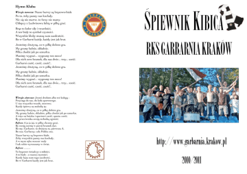 Hymn Klubu Wersja nowsza: Nasze barwy są brązowo-białe Po to, żeby panny nas kochały. Nic się nie martw, że forsy nie mamy. Chłopcy z Ludwinowa lubią w piłkę grać. Brąz to kolor siły i twardości, A ten biały to symbol czystości. Wszystkie kluby muszą nam zazdrościć, Bo w Garbarni każdy, każdy jest jak brat. Jesteśmy drużyną, co w piłkę dobrze gra. My gramy ładnie, składnie. Piłka chodzi jak po sznurku. Musimy wygrać... wygramy ten mecz! Dla nich zero bramek, dla nas dwie... trzy... sześć. Garbarni cześć, cześć, cześć!. Jesteśmy drużyną, co w piłkę dobrze gra. ŚPIEWNIK KIBICA RKS GARBARNIA KRAKÓW My gramy ładnie, składnie. Piłka chodzi jak po sznurku. Musimy wygrać... wygramy ten mecz! Dla nich zero bramek, dla nas dwie... trzy... sześć. Garbarni cześć, cześć, cześć!. Wersja starsza: Jesteś druhem albo też kolegą - Przystąp do nas, do koła sportowego. U nas wszystko wesołe, morowe; Każdy śpiewa na melodię tę: Jesteśmy drużyną, co w piłkę dobrze gra. My gramy ładnie, składnie, piłka chodzi jak po sznurku. A więc na boisku i sportowi cześć, sportu cześć, By przeciwnika swoją techniką zgnieść, Refren: A ja ja jaj, w piłkę chcemy grać, By swoją normę w porcji bramek dać, Bo my, Garbarze, to drużyna ta, pierwsza A, Bo nas, Garbarzy, cała Polska zna. Nasze barwy są brązowo-białe, Żeby wszystkie panny nas kochały, A w mym ręku neseser mały I tak sobie wyruszamy w świat. Refren: .......... To brązowe świadczy o miłości, A to białe - o naszej czystości. Każdy łajza nam tego zazdrości, Bo w Garbarni każdy jest jak brat. http://www.garbarnia.krakow.pl 2010/2011 1 Moc Garbarni Od Krakowa do Jastarni Wszyscy znają moc Garbarni Tu brygada jest wzorowa Rządzą ziomy z Ludwinowa Nasze barwy, brąz i biel Zna je każdy, stąd po Hel Nam dziś uśmiech, tobie łzy Bo wygrają Młode Lwy 38 Jej oddałem serce swe <1x lider, powtarzają wszyscy> Ona najpiękniejszym snem <1x lider, powtarzają wszyscy> W brąz i biel przystraja się <1x lider, powtarzają wszyscy> Kocham Ją a Ona mnie <1x lider, powtarzają wszyscy> Nigdy ja nie zdradzę Jej <1x lider, powtarzają wszyscy> To Garbarnia, RKS <1x lider, powtarzają wszyscy> Cała Polska już Ją zna <1x lider, powtarzają wszyscy> Moja miłość Garbarnia <1x lider, powtarzają wszyscy> 2 Gdy na Hawajach Gdy na Hawajach Zakwitną figi Powróci nasza Garbarnia W szeregi drugiej ligi 3 Garbarnia-R, Garbarnia-K, Garbarnia-S! 39 W pewnym mieście na Rydlówce 4 Gdzie Ludwinów dzielnia jest Ukochana jest drużyna Co się zowie RKS!!! O Garbarnia, o Garbarnio! Ty mistrzostwo jedno masz! O Garbarnio, o Garbarnio! Na następne przyszedł czas! Nasza, nasza wiara niezachwiana Bo jest w Tobie zakochana Więc wygraj dziś ten mecz 40 Zagraj mistrzu jak za dawnych lat, Garbarnia Kraków-RKS!!! Sialalala lalalala, Garbarnia Kraków RKS!!! Wczoraj obiecałaś mi na pewno Że trzy punkty dzisiaj będą Więc wygraj dziś ten mecz Hej, hej Garbarnio, Ukochana ma drużyno, Wygrałabyś ten mecz, ten ważny mecz 2 jak za dawnych lat, jak za dawnych lat Strzelaj bramki jak za dawnych lat, jak za dawnych lat, jak za dawnych lat Zbieraj punkty jak za dawnych lat, jak za dawnych lat, jak za dawnych lat Wygraj ligę jak za dawnych lat, jak za dawnych lat, jak za dawnych lat 15 34 5 35 Jesteśmy z Wami, Garbarnia jesteśmy z Wami! Jesteśmy z Wami, Garbarnia jesteśmy z Wami! Do boju Garbarnia, do boju Garbarnia Marsz, marsz, marsz, do boju marsz, Zwycięstwo czeka nas!!! Kto wygra mecz? Kto wygra mecz? Oczywiście że RKS!!! 2x 36 Dzisiaj mecz na Ludwinowie; Znów Garbarnia gra. Przyszło nas, kibiców, mrowie; Serce nas tu gna. Nasi chłopcy walczą pięknie Niczym lwy. Przeciwnikom ruła mięknie Raz, dwa, trzy. Garbarnia, Garbarnia Najukochańszy w całym świecie klub. Garbarnia, Garbarnia Kochać cię będziemy aż po grób. 37 Już czas, Garbarnio ma! Tułaczki nadszedł kres! Już czas, Garbarnio ma! Twe miejsce w drugiej lidze jest! Nie nam porażki smak! Nie dla nas słone łzy! Nie nam porażki smak! To my Garbarnia, Młode Lwy! 14 GUANTANAMERA Naprzód Garbarnia, kochana nasza Garbarnia! Naprzód Garbarnia, kochana nasza Garbarnia! Lwy z Ludwinowa- duma i chluba Krakowa! Lwy z Ludwinowa- duma i chluba Krakowa! Gramy do końca, Garbarnia gramy do końca! Gramy do końca, Garbarnia gramy do końca! Chcemy zwycięstwa, Garbarnia chcemy zwycięstwa! Chcemy zwycięstwa, Garbarnia chcemy zwycięstwa! 6 Wygramy, wygramy, wygramy!!! <lider> Wygramy, wygramy, wygramy!!! <wszyscy> (.......) pokonamy!!! <lider> (......) pokonamy!!! <wszyscy> I trzy punkty mamy!!! <lider> I trzy punkty mamy!!! <wszyscy> O Garbarnio Klubie Ty nasz!!! <lider> O Garbarnio Klubie Ty nasz!!! <wszyscy> Do boju, do boju, do boju Garbarnia!!! /3x<wszyscy> 7 W górę serca: Garbarnia wygra mecz /3x W górę serca: Garbarnia wygra mecz /3x 3 8 Rzeki przepłynąłem, góry pokonałem, Wielkim lasem szedłem, nocy nie przespałem Żeby Ciebie wspierać Klubie ukochany Żeby Ci zaśpiewać:hej Garbarnia Pany!!! 9 (mel. Niech żyje wolność) Na zawsze wierni, wierni i oddani Krakowskiej Garbarni z Ludwinowa fani 10 Najwspanialszy Klub na świecie Co kibiców mnóstwo ma Każdy kibic wie że przecież To jest nasza Garbarnia Strzelaj bramki by mecz wygrać Aby punkty zdobywać Abyś Mistrzem Polski była Właśnie nasza Garbarnia My kibice Ją kochamy Choć Jej w oczy wieje wiatr Właśnie o Niej dziś śpiewamy To jest nasza Garbarnia. 29 (mel. 10 w skali Beauforta) Od wielu, bardzo wielu lat Garbarni los nie sprzyja. Przeciwko Niej się sprzysiągł świat I szczęście ją omija Choć życie ciężkie, czasy złe, Lecz radość nas ogarnia, Bo my kibice wiemy że: Mistrzem będzie Garbarnia!!! 30 (mel. Przepijemy naszej babci domek mały) Zawołamy, zaśpiewamy na głos cały, Na kraj cały, Na świat cały; Że chłopaki z Ludwinowa mecz wygrały, Ważny mecz, Ważny mecz, Ważny mecz. 2x 31 w Kra