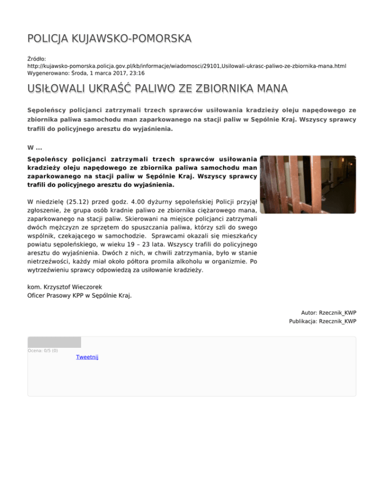 POLICJA KUJAWSKO-POMORSKA Źródło: http://kujawsko-pomorska.policja.gov.pl/kb/informacje/wiadomosci/29101,Usilowali-ukrasc-paliwo-ze-zbiornika-mana.html Wygenerowano: Środa, 1 marca 2017, 23:16 USIŁOWALI UKRAŚĆ PALIWO ZE ZBIORNIKA MANA Sępoleńscy policjanci zatrzymali trzech sprawców usiłowania kradzieży oleju napędowego ze zbiornika paliwa samochodu man zaparkowanego na stacji paliw w Sępólnie Kraj. Wszyscy sprawcy trafili do policyjnego aresztu do wyjaśnienia. W ... Sępoleńscy policjanci zatrzymali trzech sprawców usiłowania kradzieży oleju napędowego ze zbiornika paliwa samochodu man zaparkowanego na stacji paliw w Sępólnie Kraj. Wszyscy sprawcy trafili do policyjnego aresztu do wyjaśnienia. W niedzielę (25.12) przed godz. 4.00 dyżurny sępoleńskiej Policji przyjął zgłoszenie, że grupa osób kradnie paliwo ze zbiornika ciężarowego mana, zaparkowanego na stacji paliw. Skierowani na miejsce policjanci zatrzymali dwóch mężczyzn ze sprzętem do spuszczania paliwa, którzy szli do swego wspólnik, czekającego w samochodzie. Sprawcami okazali się mieszkańcy powiatu sępoleńskiego, w wieku 19 – 23 lata. Wszyscy trafili do policyjnego aresztu do wyjaśnienia. Dwóch z nich, w chwili zatrzymania, było w stanie nietrzeźwości, każdy miał około półtora promila alkoholu w organizmie. Po wytrzeźwieniu sprawcy odpowiedzą za usiłowanie kradzieży. kom. Krzysztof Wieczorek Oficer Prasowy KPP w Sępólnie Kraj. Autor: Rzecznik_KWP Publikacja: Rzecznik_KWP Ocena: 0/5 (0) Tweetnij