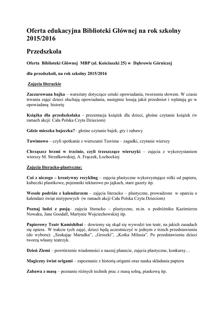 Oferta edukacyjna Biblioteki Głównej na rok szkolny 2015/2016 Przedszkola Oferta Biblioteki Głównej MBP (al. Kościuszki 25) w Dąbrowie Górniczej dla przedszkoli, na rok szkolny 2015/2016 Zajęcia literackie Zaczarowana bajka – warsztaty dotyczące sztuki opowiadania, tworzenia słowem. W czasie trwania zajęć dzieci słuchają opowiadania, następnie losują jakiś przedmiot i wplatają go w opowiadaną historię Książka dla przedszkolaka - prezentacja książek dla dzieci, głośne czytanie książek (w ramach akcji: Cała Polska Czyta Dzieciom) Gdzie mieszka bajeczka?– głośne czytanie bajek, gry i zabawy Tuwimowo – czyli spotkanie z wierszami Tuwima – zagadki, czytanie wierszy Chrząszcz brzmi w trzcinie, czyli trzeszczące wierszyki – zajęcia z wykorzystaniem wierszy M. Strzałkowskiej, A. Frączek, Łochockiej Zajęcia literacko-plastyczne: Coś z niczego – kreatywny recykling – zajęcia plastyczne wykorzystujące rolki od papieru, kubeczki plastikowe, pojemniki tekturowe po jajkach, stare gazety itp. Wesołe podróże z kalendarzem – zajęcia literacko – plastyczne, prowadzone w oparciu o kalendarz świąt nietypowych (w ramach akcji Cała Polska Czyta Dzieciom) Poznaj ludzi z pasją– zajęcia literacko – plastyczne, m.in. o podróżniku Kazimierzu Nowaku, Jane Goodall, Martynie Wojciechowskiej itp. Papierowy Teatr Kamishibai – dowiemy się skąd się wywodzi ten teatr, na jakich zasadach się opiera. W trakcie tych zajęć, dzieci będą uczestniczyć w jednym z trzech przedstawieniu (do wyboru): „Szukając Marudka”, „Groszki”, „Kotka Milusia”. Po przedstawieniu dzieci tworzą własny teatrzyk. Dzień Ziemi – powtórzenie wiadomości o naszej planecie, zajęcia plastyczne, konkursy… Magiczny świat origami – zapoznanie z historią origami oraz nauka składania papieru Zabawa z masą – poznanie różnych technik prac z masą solną, piaskową itp. Zajęcia regionalne Moje miasto Dąbrowa Górnicza– dzieci poznają zabytki i ciekawe miejsca naszego miasta podczas prezentacji multimedialnej, a także biorą udział w grach i zabawach związanych z naszym miastem. Śladami baśni i legend zagłębiowskich– dzieci poznają legendy regionalne i tworzą własną legendę. Tradycje świąteczne w Zagłębiu – zajęcia dotyczące obrzędów świątecznych w regionie Unia Europejska i kultura różnych narodów: Poznajemy kraje UE – prezentacja multimedialna, gry i zabawy. Zajęcia inne Akademia dobrych manier– zajęcia z etykiety dla dzieci, o zachowaniu się w miejscach publicznych, a także w domu np. jak korzystamy ze sztućców , jak się ubrać do teatru i na przyjęcie oraz wiele innych informacji. Pasowanie na czytelnika - dzieci dowiedzą się jak należy zachowywać się w bibliotece i szanować książki oraz jak wiele korzyści daje czytanie. Aby stać się pełnoprawnym czytelnikiem naszej biblioteki, dzieci muszą przejść kilka prób i testów. Odpowiedzą one na zagadki i quizy dotyczące bajek, baśni i biblioteki. Poznajemy swoje prawa – przybliżenie dzieciom treści praw dziecka poprzez literaturę z tym związaną. Zajęcia kończą się częścią praktyczną przez odgrywanie scenek dramowych przedstawiających respektowanie i naruszanie praw dziecka. Poznaj swój kraj – zajęcia o różnych regionach i miastach Polski. Światowy Dzień Pluszowego Misia – poznanie Misiów - bohaterów bajek, czytanie książeczek o Misiach, gry i zabawy. Urodziny Kubusia Puchatka– prezentacja multimedialna nt. mieszkańców stumilowego lasu i bohatera urodzin Kubusia Puchatka, odczytanie listu Kubusia Puchatka skierowanego do dzieci przez osobę prowadzącą, wykonanie laurek przez uczestników urodzin. Gry i zabawy ruchowe. Bajkoterapia– zajęcia dla max.15 osób, po wcześniejszym ustaleniu tematu zajęć (dla dzieci od lat 5) Poznajemy sztukę origami - zajęcia plastyczne Kosmiczna podróż – zdobywamy informacje o kosmosie, tworzymy własną kosmiczną grę Zasady ruchu drogowego – poznajemy podstawowe zasady jak bezpiecznie uczestniczyć w ruchu drogowym Jestem bezpieczny w domu, na ulicy, na placu zabaw – zajęcia podczas których dzieci poznają zasady bezpieczeństwa 4-6 lat Szkoły podstawowe Oferta Biblioteki Głównej MBP (al. Kościuszki 25) w Dąbrowie Górniczej, dla szkół podstawowych, na rok szkolny 2015/2016 Zajęcia literackie Historia pisma– lekcja biblioteczna na temat historii pisma na przestrzeni dziejów, w oparciu o prezentację multimedialną oraz zajęcia plastyczne Ortografia na wesoło– zajęcia dla klas I –VI, o zasadach ortografii, gry i zabawy, prezentacja multimedialna. Gramatyka na wesoło- zajęcia dla klas I –VI, o zasadach gramatycznych. Zabawy z alfabetem– prezentacja multimedialna, łamańce językowe związane z alfabetem, gry i zabawy (zajęcia dla klas I - IIIszkoły podstawowej) Zrymuj rym, byś cool był– zajęcia o rymach, prezentacja multimedialna, gry i zabawy tematyczne (dla klas od IV – VI) Zaczarowana historia– warsztaty dotyczące sztuki opowiadania, tworzenia słowem. W czasie trwania zajęć dzieci słuchają opowiadania, następnie losują jakiś przedmiot i wplatają go w opowiedziana historie Książka dla każdego- zajęcia literacko – czytelnicze. Prezentacja książek dla dzieci (młodzieży), jak wybrać odpowiednią pozycję, która zainteresuje młodego czytelnika. Siła wyobraźni- zajęcia literackie, czytanie i interpretacja wybranych tekstów literackich, własne próby tworzenia poezji, sloganów reklamowych itp. gry i zabawy przy użyciu wyobraźni Savoir vivre– zajęcia nt. podstawowych zasad savoir vivru. Poznaj pisarza– prezentacja multimedialna nt. biografii wybranych pisarzy Poznaj ludzi z pasją– zajęcia literacko – plastyczne m.in. o podróżniku Kazimierzu Nowaku, Jane Goodall, Martynie Wojciechowskiej itp. Wesołe podróże z kalendarzem– zajęcia literacko – plastyczne w oparciu o kalendarz świ
