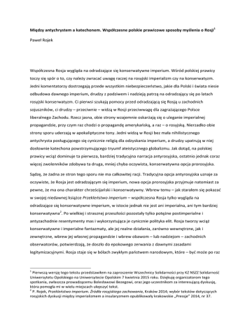 Między antychrystem a katechonem. Współczesne polskie prawicowe sposoby myślenia o Rosji1 Paweł Rojek Współczesna Rosja wygląda na odradzające się konserwatywne imperium. Wśród polskiej prawicy toczy się spór o to, czy należy zwracad uwagę raczej na rosyjski imperializm czy na konserwatyzm. Jedni komentatorzy dostrzegają przede wszystkim niebezpieczeostwo, jakie dla Polski i świata niesie odbudowa dawnego imperium, drudzy z podziwem i nadzieją patrzą na odradzający się po latach rosyjski konserwatyzm. Ci pierwsi szukają pomocy przed odradzającą się Rosją u zachodnich sojuszników, ci drudzy – przeciwnie – widzą w Rosji przeciwwagę dla zagrażającego Polsce liberalnego Zachodu. Rzecz jasna, obie strony wzajemnie oskarżają się o uleganie imperialnej propagandzie, przy czym raz chodzi o propagandę amerykaoską, a raz – o rosyjską. Nierzadko obie strony sporu uderzają w apokaliptyczne tony. Jedni widzą w Rosji bez mała nihilistycznego antychrysta posługującego się cynicznie religią dla odzyskania imperium, a drudzy upatrują w niej dosłownie katechona powstrzymującego tryumf ateistycznego globalizmu. Jak dotąd, na polskiej prawicy wciąż dominuje ta pierwsza, bardziej tradycyjna narracja antyrosyjska, ostatnio jednak coraz więcej zwolenników zdobywa ta druga, mniej chyba oczywista, konserwatywna opcja prorosyjska. Sądzę, że żadna ze stron tego sporu nie ma całkowitej racji. Tradycyjna opcja antyrosyjska uznaje za oczywiste, że Rosja jest odradzającym się imperium, nowa opcja prorosyjska przyjmuje natomiast za pewne, że ma ona charakter chrześcijaoski i konserwatywny. Wbrew temu – jak starałem się pokazad w swojej niedawnej książce Przekleostwo imperium – współczesna Rosja tylko wygląda na odradzające się konserwatywne imperium, w istocie jednak nie jest ani imperialna, ani tym bardziej konserwatywna2. Po wielkiej i strasznej przeszłości pozostały tylko potężne postimperialne i antyzachodnie resentymenty mas i wykorzystująca je cynicznie polityka elit. Rosja tworzy wciąż konserwatywne i imperialne fantazmaty, ale jej realne działania, zarówno wewnętrzne, jak i zewnętrzne, wbrew jej własnej propagandzie i wbrew obawom – lub nadziejom – zachodnich obserwatorów, potwierdzają, że doszło do epokowego zerwania z dawnymi zasadami legitymizacyjnymi. Rosja staje się w bólach zwykłym paostwem narodowym, które – byd może po raz 1 Pierwszą wersję tego tekstu przedstawiłem na zaproszenie Wszechnicy Solidarności przy KZ NSZZ Solidarnośd Uniwersytetu Opolskiego na Uniwersytecie Opolskim 7 kwietnia 2015 roku. Dziękuję organizatorom tego spotkania, zwłaszcza prowadzącemu Bolesławowi Bezegowi, oraz jego uczestnikom za interesującą dyskusję, która pomogła mi w wielu miejscach ulepszyd tekst. 2 P. Rojek, Przekleostwo imperium. Źródła rosyjskiego zachowania, Kraków 2014; wybór tekstów dotyczących rosyjskich dyskusji między imperializmem a insularyzmem opublikowały krakowskie „Pressje” 2014, nr 37. pierwszy w dziejach – ani nie niesie światu apokaliptycznych zagrożeo, ani nie daje mu żadnych mesjaoskich nadziei. Chciałbym tu przyjrzed się wskazanym wyżej dwóm głównym nurtom współczesnego polskiego prawicowego myślenia o Rosji. Pierwszy z nich dominuje w szeroko rozumianym obozie patriotycznym, związanym mniej lub bardziej bezpośrednio z Prawem i Sprawiedliwością i popularny jest w mediach „Gazety Polskiej” czy portalu „Fronda.pl”, do jego przedstawicieli należą na przykład Przemysław Żurawski vel Grajewski i Tomasz Sakiewicz3. Drugi nurt jest natomiast wyraźnie obecny w szeroko rozumianym obozie narodowym, związanym z dawną Ligą Polskich Rodzin czy współczesnym Ruchem Narodowym, oraz wśród zwolenników Janusza Korwin-Mikkego. Publicystykę tego nurtu można znaleźd na przykład w tygodniku „Najwyższy Czas” i na portalu „Konserwatyzm.pl”, a jego byd może najbardziej charakterystycznym przedstawicielem jest Adam Wielomski. W tym tekście chciałbym się skupid na analizie poglądów dwojga przedstawicieli obu nurtów, którzy specjalizują się w historii i kulturze rosyjskiej. Profesor Andrzej Nowak jest historykiem, jednym z najwybitniejszych polskich znawców dziejów Rosji, profesor Anna Raźny jest natomiast filologiem, jedną z najważniejszych polskich badaczek literatury rosyjskiej. Zarówno profesor Nowak, jak i profesor Raźny uczestniczą aktywnie w życiu publicznym, zajmują się publicystyką i angażują się w działalnośd polityczną, przy czym Nowak związany jest raczej z PiS-em, a Raźny z dawną LPR i nurtami narodowymi. Najpierw przyjrzę się diagnozie współczesnej Rosji profesora Nowaka, następnie skontrastuję ją z poglądami profesor Raźny, a potem spróbuję krytycznie odnieśd się do obu tych sposobów myślenia. 1. Nihilistyczne neoimperium Profesor Andrzej Nowak jest znakomitym kontynuatorem oryginalnej polskiej szkoły sowietologii, której najważniejszym twierdzeniem była zasadnicza ciągłośd między carskim a radzieckim imperializmem. Zwięzłym streszczeniem polskiego poglądu na ZSRS jest tytuł wielotomowej przedwojennej pracy Jana Kucharzewskiego Od białego caratu do czerwonego4. Teza ta bynajmniej nie była dawniej oczywista, Związek Sowiecki przedstawiał się bowiem jako paostwo programowo walczące ze światowym imperializmem i wielu zachodnich autorów wierzyło mu na słowo. Jeśli dziś na świecie powszechnie traktuje się ZSRS jako szczególną postad dawnego rosyjskiego imperium, to 3 4 Zob. zwłaszcza T. Sakiewicz, Testament I Rzeczypospolitej. Kulisy śmierci Lecha Kaczyoskiego, Kraków 2014. J. Kucharzewski, Od białego caratu do czerwonego, t. I–V, Warszawa 1998–2000. jest to w dużej mierze zasługa pochodzących z Polski autorów, przede wszystkim amerykaoskich historyków Richarda Pipesa i Adam Ulama. Andrzej Nowak nie tylko podtrzymuje polską tezę o ciągłości i