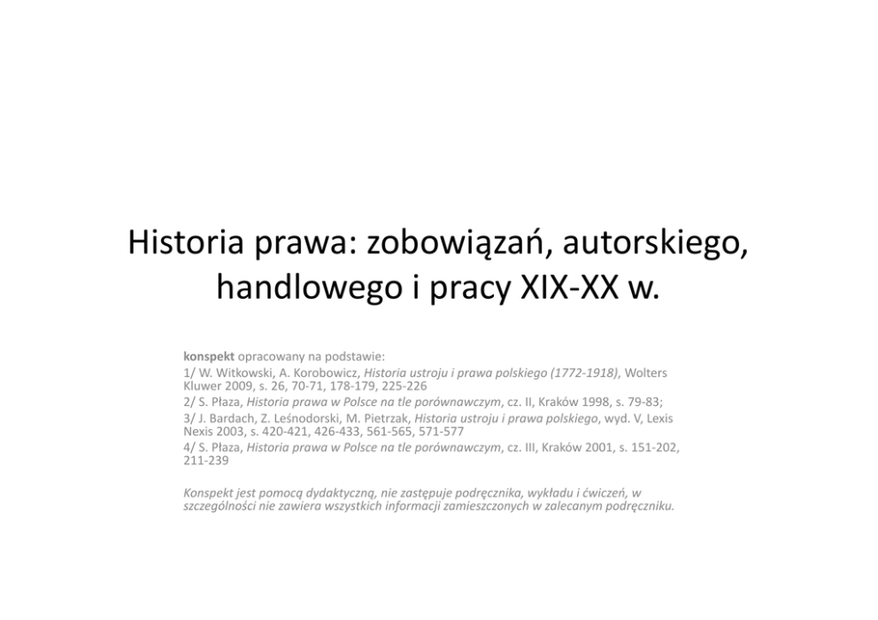 Historia prawa: zobowiązań, autorskiego, handlowego i pracy XIX-XX w. konspekt opracowany na podstawie: 1/ W. Witkowski, A. Korobowicz, Historia ustroju i prawa polskiego (1772-1918), Wolters Kluwer 2009, s. 26, 70-71, 178-179, 225-226 2/ S. Płaza, Historia prawa w Polsce na tle porównawczym, cz. II, Kraków 1998, s. 79-83; 3/ J. Bardach, Z. Leśnodorski, M. Pietrzak, Historia ustroju i prawa polskiego, wyd. V, Lexis Nexis 2003, s. 420-421, 426-433, 561-565, 571-577 4/ S. Płaza, Historia prawa w Polsce na tle porównawczym, cz. III, Kraków 2001, s. 151-202, 211-239 Konspekt jest pomocą dydaktyczną, nie zastępuje podręcznika, wykładu i ćwiczeń, w szczególności nie zawiera wszystkich informacji zamieszczonych w zalecanym podręczniku. Prawo zobowiązań w XIX w. I Pacta sunt servanda; wadliwość umowy – wada oświadczenia woli, rażąca niesprawiedliwość Zasada: czynności prawne kauzalne, w BGB także abstrakcyjne (bez przyczyny prawnej – causa) PPK – skomplikowana typologia źródeł zobowiązania (bezpośrednie, pośrednie, dalsze podziały) KN – źródła zobowiązań: umowy, z mocy prawa, delikty, quasi-umowy, quasi-delikty (nawiązanie do prawa rzymskiego); szeroka swoboda umów (ograniczenie: porządek publiczny dobre obyczaje); akt notarialny dla: umowa przedślubna, hipoteka, darowizna ABGB – źródła zobowiązań: ustawa, umowa, delikt; wolność umów, równość stron, z prawa polskiego wprowadzone dożywocie, poza kodeksem feudalne przepisy o czeladzi BGB – centralne miejsce prawo zobowiązań, ponad 600 paragrafów; powstanie: ex delicto, ex contractu; swoboda umów węższa niż w KN, nieważne umowy sprzeczne z prawem, dobrymi obyczajami, zakaz umów lichwiarskich; ochrona przede wszystkim wierzycieli, choć są wpływy nurtu socjologicznego; regulacja m.in. umowy o pracę Prawo zobowiązań w XIX w. II Odpowiedzialność cywilna Domniemanie niewinności przy własnych czynach, domniemanie winy przy czynach powierzonych osób (culpa in custodiendo, culpa in eligendo) i zwierząt (culpa in custodiendo - ale nie BGB, przewidujący tutaj odpowiedzialność obiektywną) ABGB – z niewykonania/nienależytego wykonania umowy lub z czynów niedozwolonych (wspólne określenie); damnum emergens i lucrum cessans w przypadku złego zamiaru (dolus) i rażącego niedbalstwa (culpa lata), damnum emergens gdy zwykłe niedbalstwo (culpa levis) KN – osobno określa szkodę kontraktową i deliktową, szeroki zakres deliktu; umyślność (z czynu) i nieumyślność (niedbalstwo, nieroztropność); odpowiedzialność za czyny własne, powierzonych osób oraz za rzeczy pod dozorem BGB – precyzyjne określenie czynu niedozwolonego Odpowiedzialność obiektywna: np. zawalenie się budynków Wzrasta rola towarzystw ubezpieczeniowych (rozwój komunikacji) Prawo handlowe z XIX w. 1 Kwestie ogólne Dopuszczenie do obrotu handlowe osób ze wszystkich warstw społecznych Ogólne zasady prawa handlowego: bezpieczeństwo obrotu krajowego i międzynarodowego, swoboda umów, zasada jawności (ogłaszanie bilansów w spółkach, rejestrów firm), samodzielność zawodu handlowego Firma – symbol działalności PPK z 1794 - Regulacja weksla; zdolność wekslowa przysługiwała: kupcom, przedsiębiorcom przemysłowym, handlującym na morzu i w ramach żeglugi śródlądowej, osobom, które uzyskały zezwolenie sądu, właściciele majątków szlacheckich, dzierżawcy domen - Prawo handlowe oparte na kryterium podmiotowym – definicji kupca: zawodowo i na własny rachunek sprzedaż rzeczy, weksli lub książek; prawo do firmy - Instytucja spółki i maklerów giełdowych Prawo handlowe z XIX w. 2 Kodeks handlowy Napoleona z 1807 r. - Od 1 V 1809 w Księstwie Warszawskim; - Kryterium przedmiotowe obrotu handlowego: czynności uznane za handlowe (działalność celem uzyskania zysku – wymiana, kredyt, produkcja przemysłowa) - 648 art., 4 księgi: I. O handlu w ogólności (handlujący, księgi handlowe, spółki, weksle, giełdy), II. O handlu morskim, III. Upadłość i bankructwo, IV. Sądy handlowe i postępowanie przed nimi - Uzupełniane regulacje: o giełdzie, w 1825 r. przepisy o księgach handlowych Niemiecki Kodeks handlowy 1897 (wejście w życie 1900 r.) - Kryterium podmiotowe – prawo kupców (handle i przemysł) - Solidaryzm społeczny, ochrona słabszej strony w obrocie - 4 księgi: I. kupiec, II. spółki handlowe, III. czynności handlowe, IV. Handel morski Austriacki kodeks handlowy z 1862 r. - Kryterium mieszane przedmiotowo-podmiotowe: prawo kupców oraz czynności handlowe Prawo gospodarcze XIX w. 1 Do lat 80’ XIX prawodawstwo liberalne – swoboda umów i równość stron, liberalizm gospodarczy Królestwo Polskie 1816 wolność przemysłowa oraz zasada wolnej konkurencji 1817 Komisja Spraw Wewnętrznych i Policji może udzielać po założeniu fabryki libertacji podatkowej na 3-9 lat Ochrona patentowa wynalazków 5-15 lat Utrzymanie prawa polskiego z 1576 r.: własność wnętrza ziemi należy do właściciela powierzchni Sprzeczne z wolnością gospodarczą: - Koncesje - Protekcjonizm w stosunku do wytwórczości - Pomoc podatkowa państwa i kredyt Wolność przemysłowa: Prusy 1845, Niemcy 1869, Austria 1869, Rosja 1863 (ustawa podatkowa) Wolność górnicza Austria 1864, Prusy 1865 Prawo gospodarcze XIX w. 2 Monopole państwowe: kolej, łączność Kartele: pierwszy cukrowniczy w Austrii; dopuszczalne: Królestwo Polskie, Rosja; tolerowane Prusy, w Austrii próba ograniczeń Samorząd gospodarczy: reprezentowanie interesów oraz instrument oddziaływania państwa na życie gospodarcze Izby przemysłowo-handlowe: regulacje Prusy 1849, 1897 oraz Austria 1898; brak w Rosji i Królestwie Polskim; istnieją Komitety Handlu i Rzemiosła, Zgromadzenia Kupców i Komitety Giełdowe Izby rolnicze Przymusowe zrzeszenia rolników Prusy od 1894: zrzeszenie rolników płacących podatek gruntowy powyżej ustalonej kwoty Blokada w Galicji wprowadzenia ustawy