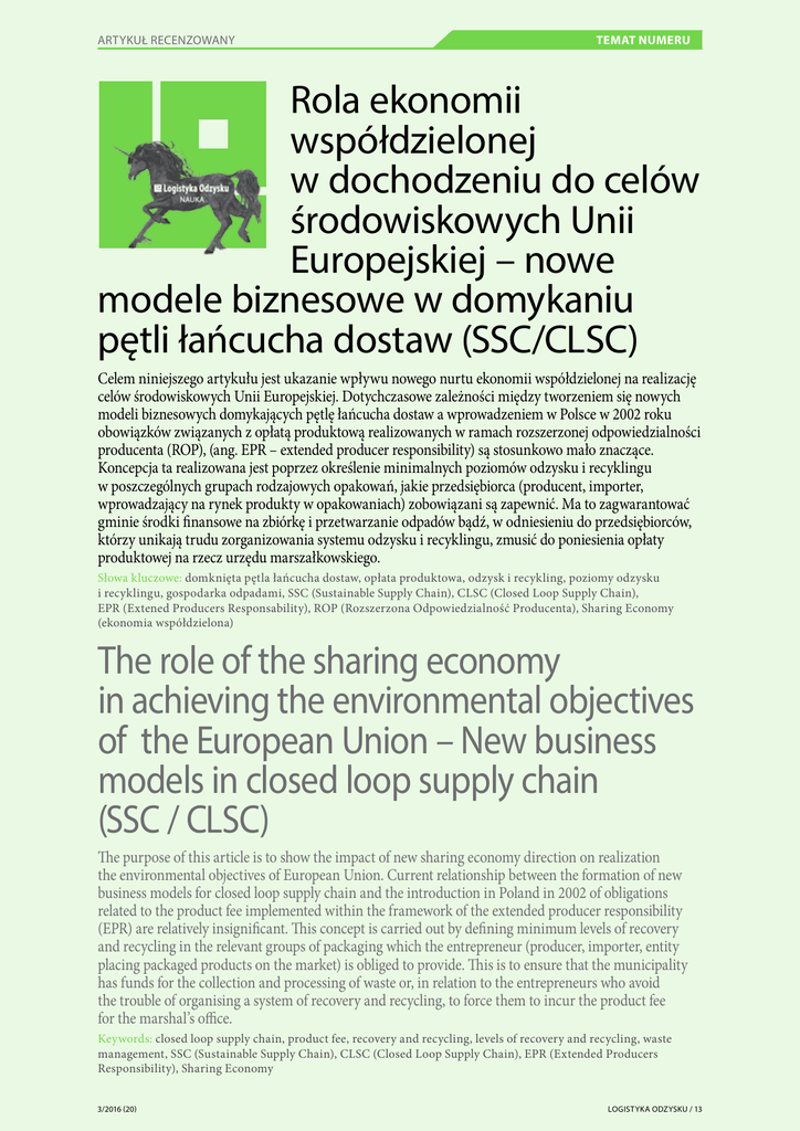artykuł recenzowany TEMAT NUMERU Rola ekonomii współdzielonej w dochodzeniu do celów środowiskowych Unii Europejskiej – nowe modele biznesowe w domykaniu pętli łańcucha dostaw (SSC/CLSC) Celem niniejszego artykułu jest ukazanie wpływu nowego nurtu ekonomii współdzielonej na realizację celów środowiskowych Unii Europejskiej. Dotychczasowe zależności między tworzeniem się nowych modeli biznesowych domykających pętlę łańcucha dostaw a wprowadzeniem w Polsce w 2002 roku obowiązków związanych z opłatą produktową realizowanych w ramach rozszerzonej odpowiedzialności producenta (ROP), (ang. EPR – extended producer responsibility) są stosunkowo mało znaczące. Koncepcja ta realizowana jest poprzez określenie minimalnych poziomów odzysku i recyklingu w poszczególnych grupach rodzajowych opakowań, jakie przedsiębiorca (producent, importer, wprowadzający na rynek produkty w opakowaniach) zobowiązani są zapewnić. Ma to zagwarantować gminie środki finansowe na zbiórkę i przetwarzanie odpadów bądź, w odniesieniu do przedsiębiorców, którzy unikają trudu zorganizowania systemu odzysku i recyklingu, zmusić do poniesienia opłaty produktowej na rzecz urzędu marszałkowskiego. Słowa kluczowe: domknięta pętla łańcucha dostaw, opłata produktowa, odzysk i recykling, poziomy odzysku i recyklingu, gospodarka odpadami, SSC (Sustainable Supply Chain), CLSC (Closed Loop Supply Chain), EPR (Extened Producers Responsability), ROP (Rozszerzona Odpowiedzialność Producenta), Sharing Economy (ekonomia współdzielona) The role of the sharing economy in achieving the environmental objectives of the European Union – New business models in closed loop supply chain (SSC / CLSC) The purpose of this article is to show the impact of new sharing economy direction on realization the environmental objectives of European Union. Current relationship between the formation of new business models for closed loop supply chain and the introduction in Poland in 2002 of obligations related to the product fee implemented within the framework of the extended producer responsibility (EPR) are relatively insignificant. This concept is carried out by defining minimum levels of recovery and recycling in the relevant groups of packaging which the entrepreneur (producer, importer, entity placing packaged products on the market) is obliged to provide. This is to ensure that the municipality has funds for the collection and processing of waste or, in relation to the entrepreneurs who avoid the trouble of organising a system of recovery and recycling, to force them to incur the product fee for the marshal’s office. Keywords: closed loop supply chain, product fee, recovery and recycling, levels of recovery and recycling, waste management, SSC (Sustainable Supply Chain), CLSC (Closed Loop Supply Chain), EPR (Extended Producers Responsibility), Sharing Economy 3/2016 (20) Logistyka Odzysku / 13 TEMAT NUMERU Z góry narzucone wymogi okazują się być mało motywujące, gdyż wciąż zbyt duża masa odpadów trafia na wysypiska. Jako kontrpropozycja do modelu gospodarki konsumpcyjnej (linearnej) powstaje model gospodarki recyrkulacyjnej, w której istotną rolę pełni nowy ruch konsumencki określany jako ekonomia współdzielona. Nurt ten z deficytowości surowców buduje przewagę konkurencyjną. Konsumenci, bardziej dbając o dostęp do surowców czy produktów niż o ich posiadanie, wyznaczają zupełnie nowe trendy na rynku. W ten właśnie sposób dokonuje się domykanie pętli łańcucha dostaw poprzez ponowne wykorzystanie danego towaru. Obie koncepcje nie istnieją bez sprawnej logistyki odzysku – nie jest możliwe bowiem dostarczenie towaru lub usługi do konsumenta, nie dbając o jej odbiór bądź zagospodarowanie pozostałości. Jesteśmy świadkami rewolucyjnych zmian wywołanych rozwojem technologicznym i ograniczonością pojemności środowiska. Obserwujemy dynamiczny proces dostosowania się człowieka do zmienionych warunków ekonomiczno-ekologicznych. Model biznesowy gwarantujący odzysk i recykling – przemysł czy konsument – komu bliższe są aspekty środowiskowe W literaturze często spotyka się określenia zamknięty cykl produkcyjny, domknięta pętla łańcucha dostaw, zrównoważona produkcja – wszystkie te określenia dotyczą nowego podejścia do tworzenia produktów i usług w związku z dewastacją środowiska, jaka się dokonała w wyniku dynamicznego rozwoju konsumpcji. Do pojęć tych dołączyła gospodarka o obiegu zamkniętym nagłaśniana przez Komisję Europejską w ramach promocji nowego podejścia opisanego w nowelizacji dyrektywy ramowej. Do podstawowych celów gospodarki recyrkulacyjnej należą: ■ Podniesienie poziomu przygotowania do ponownego użycia i recyklingu odpadów komunalnych do 65% w 2030 r.1 ■ Zakaz składowania segregowanych odpadów oraz ograniczenie odsetka składowanych odpadów komunalnych do 10 % do 2030 r.1 ■ Zwiększenie przygotowania do ponownego użycia i poddawania recyklingowi odpadów opakowaniowych do 75% w 2030 r. z uwzględnieniem celów pośrednich 65% w 2025 r. oraz jeszcze ambitniejszych celów dla wybranych grup materiałowych2. Wymogi odzysku i recyklingu w ramach systemu rozszerzonej odpowiedzialności producenta obarczone są groźbą kary w postaci opłaty produktowej za ich niewykonanie. Kary te jednak nie są na tyle motywujące, by ograniczać faktyczne deponowanie odpadów na składowiskach i dodatkowo zachętę stanowią niskie opłaty za składowanie odpadów. Dla wprowadzenia zmian potrzebne są dodatkowe bodźce, które spowodują zmianę postępowania w zakresie gospodarki odpadami. Przemysł, aby osiągnąć nowe cele, musi przeprojektować dotychczasowe modele biznesowe. W związku z powyższym dąży do modyfikacji procesów pozyskiwania surowców, odchodząc od surowców naturalnych na rzecz surowców wtórnych lub 14 / Logistyka Odzysku artykuł recenzowany dr Katarzyna Mich