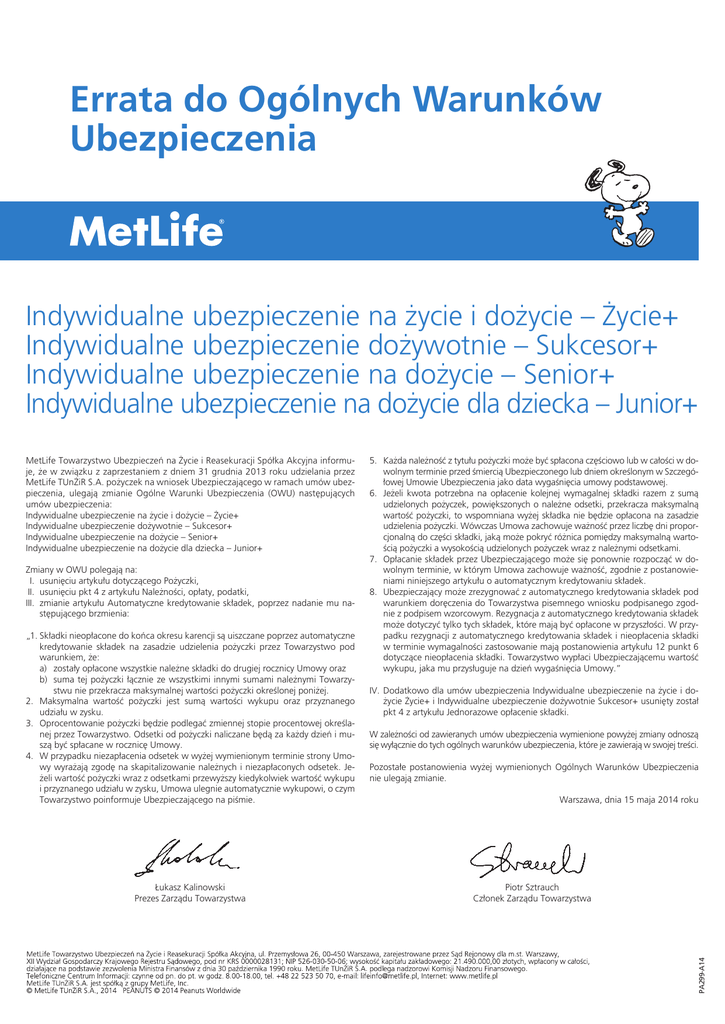 Errata do Ogólnych Warunków Ubezpieczenia Indywidualne ubezpieczenie na życie i dożycie – Życie+ Indywidualne ubezpieczenie dożywotnie – Sukcesor+ Indywidualne ubezpieczenie na dożycie – Senior+ Indywidualne ubezpieczenie na dożycie dla dziecka – Junior+ Zmiany w OWU polegają na: I. usunięciu artykułu dotyczącego Pożyczki, II. usunięciu pkt 4 z artykułu Należności, opłaty, podatki, III. zmianie artykułu Automatyczne kredytowanie składek, poprzez nadanie mu następującego brzmienia: „1.Składki nieopłacone do końca okresu karencji są uiszczane poprzez automatyczne kredytowanie składek na zasadzie udzielenia pożyczki przez Towarzystwo pod warunkiem, że: a) zostały opłacone wszystkie należne składki do drugiej rocznicy Umowy oraz b) suma tej pożyczki łącznie ze wszystkimi innymi sumami należnymi Towarzystwu nie przekracza maksymalnej wartości pożyczki określonej poniżej. 2. Maksymalna wartość pożyczki jest sumą wartości wykupu oraz przyznanego udziału w zysku. 3. Oprocentowanie pożyczki będzie podlegać zmiennej stopie procentowej określanej przez Towarzystwo. Odsetki od pożyczki naliczane będą za każdy dzień i muszą być spłacane w rocznicę Umowy. 4. W przypadku niezapłacenia odsetek w wyżej wymienionym terminie strony Umowy wyrażają zgodę na skapitalizowanie należnych i niezapłaconych odsetek. Jeżeli wartość pożyczki wraz z odsetkami przewyższy kiedykolwiek wartość wykupu i przyznanego udziału w zysku, Umowa ulegnie automatycznie wykupowi, o czym Towarzystwo poinformuje Ubezpieczającego na piśmie. Łukasz Kalinowski Prezes Zarządu Towarzystwa 5. Każda należność z tytułu pożyczki może być spłacona częściowo lub w całości w dowolnym terminie przed śmiercią Ubezpieczonego lub dniem określonym w Szczegółowej Umowie Ubezpieczenia jako data wygaśnięcia umowy podstawowej. 6. Jeżeli kwota potrzebna na opłacenie kolejnej wymagalnej składki razem z sumą udzielonych pożyczek, powiększonych o należne odsetki, przekracza maksymalną wartość pożyczki, to wspomniana wyżej składka nie będzie opłacona na zasadzie udzielenia pożyczki. Wówczas Umowa zachowuje ważność przez liczbę dni proporcjonalną do części składki, jaką może pokryć różnica pomiędzy maksymalną wartością pożyczki a wysokością udzielonych pożyczek wraz z należnymi odsetkami. 7. Opłacanie składek przez Ubezpieczającego może się ponownie rozpocząć w dowolnym terminie, w którym Umowa zachowuje ważność, zgodnie z postanowieniami niniejszego artykułu o automatycznym kredytowaniu składek. 8. Ubezpieczający może zrezygnować z automatycznego kredytowania składek pod warunkiem doręczenia do Towarzystwa pisemnego wniosku podpisanego zgodnie z podpisem wzorcowym. Rezygnacja z automatycznego kredytowania składek może dotyczyć tylko tych składek, które mają być opłacone w przyszłości. W przypadku rezygnacji z automatycznego kredytowania składek i nieopłacenia składki w terminie wymagalności zastosowanie mają postanowienia artykułu 12 punkt 6 dotyczące nieopłacenia składki. Towarzystwo wypłaci Ubezpieczającemu wartość wykupu, jaka mu przysługuje na dzień wygaśnięcia Umowy.” IV. Dodatkowo dla umów ubezpieczenia Indywidualne ubezpieczenie na życie i dożycie Życie+ i Indywidualne ubezpieczenie dożywotnie Sukcesor+ usunięty został pkt 4 z artykułu Jednorazowe opłacenie składki. W zależności od zawieranych umów ubezpieczenia wymienione powyżej zmiany odnoszą się wyłącznie do tych ogólnych warunków ubezpieczenia, które je zawierają w swojej treści. Pozostałe postanowienia wyżej wymienionych Ogólnych Warunków Ubezpieczenia nie ulegają zmianie. Warszawa, dnia 15 maja 2014 roku Piotr Sztrauch Członek Zarządu Towarzystwa PA299-A14 MetLife Towarzystwo Ubezpieczeń na Życie i Reasekuracji Spółka Akcyjna informuje, że w związku z zaprzestaniem z dniem 31 grudnia 2013 roku udzielania przez MetLife TUnŻiR S.A. pożyczek na wniosek Ubezpieczającego w ramach umów ubezpieczenia, ulegają zmianie Ogólne Warunki Ubezpieczenia (OWU) następujących umów ubezpieczenia: Indywidualne ubezpieczenie na życie i dożycie – Życie+ Indywidualne ubezpieczenie dożywotnie – Sukcesor+ Indywidualne ubezpieczenie na dożycie – Senior+ Indywidualne ubezpieczenie na dożycie dla dziecka – Junior+