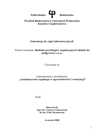 Politechnika Białostocka Wydział Budownictwa i Inżynierii Środowiska Katedra Ciepłownictwa Instrukcja do zajęć laboratoryjnych Temat ćwiczenia: Badanie przebiegów regulacyjnych układu do podgrzewu c.w.u. Ćwiczenie nr Laboratorium z przedmiotu: „Automatyczna regulacja w ogrzewnictwie i wentylacji” Kod: Opracował: mgr inż. Tomasz Teleszewski dr inż. Piotr Rynkowski wrzesień 2008 1 1. Wprowadzenie „Ciepła woda użytkowa (c.w.u.) może być przygotowywana w podgrzewaczach elektrycznych i gazowych. Gazowe wymagają podłączenia do instalacji gazowej oraz komina przystosowanego do odprowadzania spalin gazowych (stare kominy murowane często trzeba modernizować). Pomieszczenie, w którym ma być zainstalowany taki podgrzewacz, musi mieć odpowiednią kubaturę (nie mniej niż 8 m3). Trzeba również zapewnić w nim dobrą wentylację, tzn. nawiew powietrza (może to być nawiew bezpośredni - przez nawiewnik zamontowany w tym pomieszczeniu, w którym jest zainstalowany podgrzewacz, lub nawiew pośredni - przez nawiewniki zamontowane w pokojach) oraz wywiew przez kanał wentylacyjny. Elektryczne, jeśli mają małą moc -do 6 kW, z reguły są przystosowane do zasilania z instalacji jednofazowej (230 V); większe wymagają podłączenia do instalacji trójfazowej (400 V). Zarówno podgrzewacze gazowe, jak i elektryczne produkuje się w dwóch odmianach: - pojemnościowe podgrzewają wodę znajdującą się w zasobniku i utrzymują jej temperaturę na zadanym poziomie; - przepływowe uruchamiają podgrzewanie w momencie odkręcenia kranu i wyłączają, gdy się go zakręca. Elektryczne pojemnościowe Moc elektrycznych podgrzewaczy pojemnościowych to najczęściej 1,5 do 2 kW - taką moc mają ich grzałki (a niektóre modele mają je dwie a nawet trzy). Jest to bardzo wygodne i przynosi konkretne oszczędności energii, pozwala bowiem na pracę urządzenia ze zmienną mocą: małą - kiedy przez dłuższy czas nie używamy ciepłej wody i chodzi jedynie o podtrzymanie jej temperatury, średnią - w cyklu normalnej pracy, i wysoką - gdy zachodzi potrzeba szybkiego podgrzania wody w zbiorniku. Niektóre podgrzewacze pojemnościowe mają zamontowane dodatkowo urządzenia przystosowane do współpracy z kotłami centralnego ogrzewania. Podgrzewacze pojemnościowe mogą być bezciśnieniowe (jednopunktowe) oraz ciśnieniowe (wielopunktowe). Bezciśnieniowe. Są to niewielkie zbiorniki (o pojemności 5-15 litrów), które mogą zasilać tylko jeden punkt poboru: umywalkę lub zlewozmywak. Umieszcza się je nad lub pod przyborem. Zazwyczaj są sprzedawane razem ze specjalną baterią, która redukuje ciśnienie wody - z tego, jakie panuje w instalacji, do tego, pod jakim pozostaje woda w zbiorniku. Ciśnieniowe. Mają w zbiorniku takie ciśnienie, jakie panuje w instalacji wodnej. Mogą zasilać jeden lub więcej punktów poboru wody. Do zasilania pojedynczych punktów stosuje się niewielkie podgrzewacze o pojemności od 10 do 30 litrów, możliwe do zamontowania w szafkach Większe podgrzewacze - o pojemności od kilkudziesięciu do kilkuset litrów można zawiesić bezpośrednio pod sufitem (te wykonane w wersji poziomej) albo na ścianie, lub postawić na specjalnym stojaku (pionowe). Elektryczne przepływowe Małe, o mocy od 3,5 do 6 kW mają wydajność od 1,5 do 3 litrów ciepłej wody na minutę i mogą zasilać tylko jeden punkt poboru wody. Często są sprzedawane w komplecie z zamontowaną baterią i wylewką lub słuchawką prysznicową. Większe, o mocy przekraczającej 20 kW, są w stanie dostarczyć wodę jednocześnie do dwóch, a nawet trzech punktów poboru wody w ilości nawet 12-14 litrów na minutę. 2 Regulacja temperatury wody w elektrycznych podgrzewaczach przepływowych może się odbywać na dwa sposoby: - hydraulicznie - im więcej wody się pobiera, tym niższa jest jej temperatura; - elektronicznie - temperatura pozostaje niezależna od ilości pobieranej wody (istnieje możliwość nastawiania temperatury z dokładnością do 0,5-1oC). Gazowe pojemnościowe Są to różnej wielkości zbiorniki, w których dolnej części znajduje się komora spalania wraz z palnikiem. Kiedy następuje włączenie palnika, gorące spaliny przepływające specjalnym kanałem usytuowanym w środku zbiornika oddają ciepło otaczającej go wodzie. Palnik pracuje tak długo, aż woda w zasobniku osiągnie nastawioną temperaturę, po czym się wyłącza. Podgrzewacze stosowane w domach mają pojemność od 80 do 200 litrów. Te o pojemności do 120 litrów mają mniejsze gabaryty, są lżejsze, a więc przystosowane do zawieszenia na ścianie. Większe produkuje się tylko jako stojące. Dużą zaletą podgrzewaczy pojemnościowych jest mała moc, zazwyczaj nieprzekraczająca 10 kW. Dzięki temu urządzenia te charakteryzują się mniejszym chwilowym zużyciem gazu niż przepływowe podgrzewacze gazowe i mogą być stosowane nawet tam, gdzie ze względu na zbyt mały przydział gazu ziemnego korzystanie z podgrzewacza przepływowego jest niemożliwe. Gazowe przepływowe Nazywane też „termami” lub „piecykami kąpielowymi”, różnią się od siebie mocą, sposobami zapłonu palnika i regulacji temperatury wody. Moc. Dostępne są trzy grupy urządzeń: małej mocy (17-19 kW), średniej (23-24 kW) i dużej (około 30 kW). Maksymalna wydajność tych pierwszych to około 9 litrów na minutę, a tych dużej mocy - nawet 14 litrów na minutę (jeśli woda jest podgrzewana o 30oC). Rodzaj zapłonu palnika podgrzewacza. Tu można wybierać spośród trzech wariantów: - płomyk dyżurny, od którego po odkręceniu kranu z ciepłą wodą zapala się palnik główny; - zapłon na baterie, czyli zasilany z baterii aparat zapłonowy wytwarzający iskrę do zapalenia palnika; - hydrogenerator, czyli mała zasilana wodą turbinka, która wytwarza prąd i zasila zapalacz iskrowy. Regulacja temperatury wody. Do wyboru są trzy jej rodzaje: - ręczna, umożliwiająca skokowe l