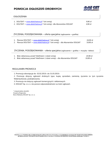POMOCJA OGŁOSZEŃ DROBNYCH . OGŁOSZENIA 1. DOLTEXT + www.ebelchatow.pl 7 dni emisji 9,90 zł 2. DOLTEXT + www.ebelchatow.pl 7 dni emisji –dla Abonentów DOLSAT 4,90 zł ŻYCZENIA, PODZIĘKOWANIA – oferta specjalna (ogłoszenie + grafika) 1. Plansza DOLTEXT + www.ebelchatow.pl 7 dni emisji 2. Plansza DOLTEXT + www.ebelchatow.pl 7 dni emisji – dla Abonentów DOLSAT 24,90 zł 19,90 zł ŻYCZENIA, PODZIĘKOWANIA – oferta specjalna (ogłoszenie + grafika + muzyka +lektor) 1. Blok reklamowy przed TeleDniem 1 dzień emisji 2. Blok reklamowy przed TeleDniem 1 dzień emisji – dla Abonentów DOLSAT 24,90 zł 19,90 zł REGULAMIN PROMOCJI 1. Promocja obowiązuje do 02.02.2015r. do 31.03.2015r. 2. Promocja dotyczy ogłoszeń drobnych typu: kupię, sprzedam, zamienię, życzenia (w tym życzenia Walentynkowe), podziękowania. 3. Promocja nie dotyczy ogłoszeń komercyjnych i reklamowych. 4. DOLSAT Sp. z o. o. nie ponosi odpowiedzialności za treść ogłoszeń. * (niepotrzebne skreślić) Kryspina Rogowska Biuro Reklamy DOLSAT Sp. z o. o.
