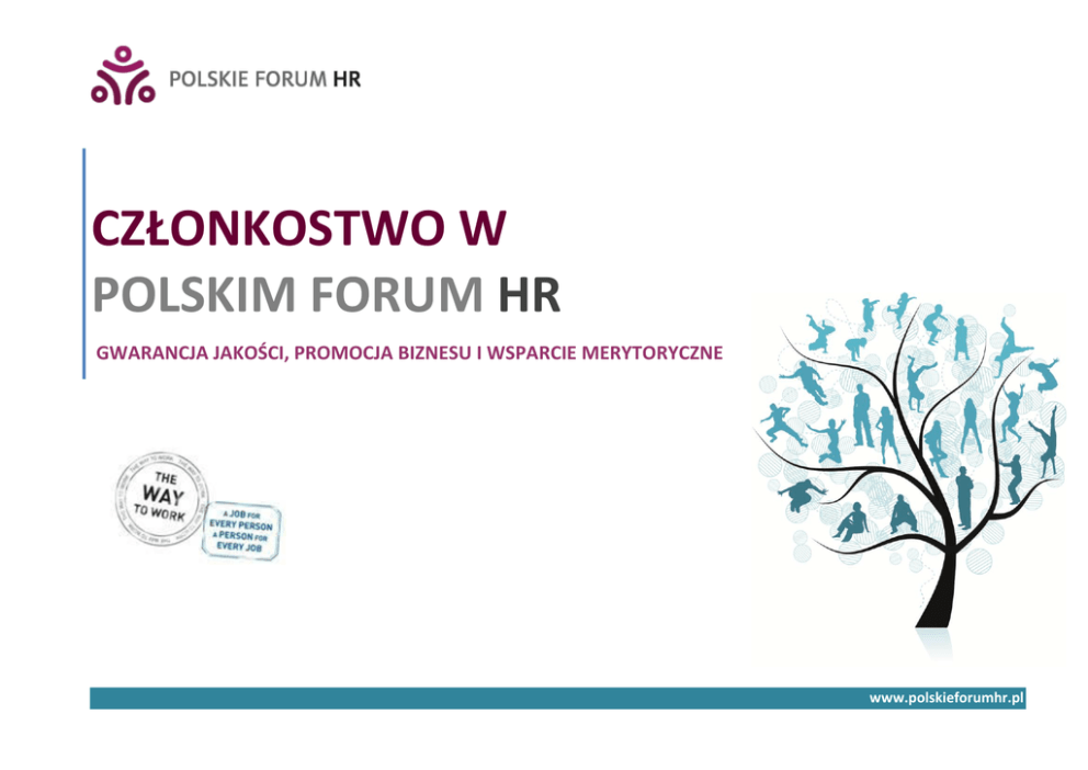 CZŁONKOSTWO W POLSKIM FORUM HR GWARANCJA JAKOŚCI, PROMOCJA BIZNESU I WSPARCIE MERYTORYCZNE www.polskieforumhr.pl O POLSKIM FORUM HR Polskie Forum HR powstało w 2002 roku z inicjatywy największych agencji zatrudnienia działających wówczas na rynku. Od samego początku swojego istnienia koncentrujemy się na aktywnościach mających na celu skuteczną poprawę otoczenia prawnego funkcjonowania branży, promocję usług świadczonych przez nasz sektor, dbanie o jej dobry wizerunek, budowanie wartościowego dialogu z partnerami społecznymi oraz dostarczanie możliwie szerokiej oferty naszym członkom, ułatwiając im funkcjonowanie na rynku. Swoje działania koncentrujemy w trzech sekcjach: pracy tymczasowej rekrutacji i selekcji delegowania HISTORIA I DOKONANIA 2002 Powstanie Związku Agencji Pracy Tymczasowej (ZAPT) 2004 Wejście w życie ustawy o zatrudnieniu pracowników tymczasowych 2005 Przedstawiciel ZAPT w Zarządzie Eurociett (jako jedyny przedstawiciel Europy Środkowowschodniej) 2006 Okrągły stół - pierwszy dialog społeczny wokół tematu pracy tymczasowej w Polsce 2009 Przyjęcie Standardu ZAPT (obecnie Standard Polskiego Forum HR) Każda z sekcji prowadzi niezależne projekty, którym przyświeca jeden cel - wyznaczanie najwyższych standardów na rynku agencji zatrudnienia w Polsce. JESTEŚMY CZŁONKIEM CZŁONKOWIE POLSKIEGO FORUM HR Nowelizacja ustawy o zatrudnieniu pracowników tymczasowych 2010 Zmiana struktury organizacji: poszerzenie działalności, nowa nazwa: Polskie Forum HR www.polskieforumhr.pl CO DAJE CZŁONKOSTWO W POLSKIM FORUM HR ? Wsparcie najlepszych ekspertów w dziedzinie prawa pracy oraz ochrony danych osobowych Dostęp do najświeższych danych z rynku agencji zatrudnienia w Polsce i na świecie Wzmocnienie wizerunku oraz pozycji rynkowej firmy „Jesteśmy wyznacznikiem najwyższych standardów. Każda kolejna agencja, która staje się naszym Członkiem poszerza grono agencji godnych zaufania.” Anna Wicha, Prezes Zarządu Polskiego Forum HR, Dyrektor Generalny Adecco Polska Sp. z Dostęp do wyspecjalizowanej oferty szkoleniowej Wpływ na kształt otoczenia prawnego funkcjonowania sektora w Polsce i Europie Udział w prestiżowych projektach branżowych Wymianę wiedzy i doświadczeń z innymi firmami członkowskimi Wiedzę na temat ram prawnych branży w innych krajach europejskich oraz sieć tamtejszych kontaktów Preferencyjne warunki korzystania z płatnych usług Polskiego Forum HR o.o. „Przynależność do Polskiego Forum HR zobowiązuje do przestrzegania wyższych standardów. Dla agencji nie będących korporacją jest to istotny czynnik budujący zaufanie zarówno wśród klientów jaki i pracowników tymczasowych”, Katarzyna Rydzewska, Dyrektor Zarządzający Job Impulse Polska Sp. z o.o. „Polskie Forum HR daje możliwość korzystania z doświadczeń międzynarodowych, co jest szczególnie ważne dla agencji małych i średnich, których pole działania nie wykracza poza granice Polski”, Antonio Carvelli, Członek Zarządu GI Group Sp. z o.o. www.polskieforumhr.pl CO DAJE CZŁONKOSTWO W POLSKIM FORUM HR ? WSPARCIE PRAWNE Uczestnictwo w kreowaniu otoczenia prawnego funkcjonowania naszej branży (opiniowanie aktów prawnych, zgłaszanie własnych inicjatyw ustawodawczych etc.) Dostęp do zebranych interpretacji przepisów prawa i stanowisk MPiPS, GIP i ZUS. Standard Polskiego Forum HR. Rozwiązywanie bieżących problemów, konsultacjom z pracownikami biura. dzięki Współpraca z najlepszymi prawnikami w branży, zarówno w zakresie pracy tymczasowej i prawa pracy jaki i ochrony danych osobowych. Wymiana praktycznych członkami PFHR. doświadczeń między Stosowanie przez agencje zatrudnienia przepisów regulaminu pracy i regulaminu wynagrodzeń obowiązujących u pracodawcy użytkownika. Zatrudnianie pracowników tymczasowych regulacje szczególne a Kodeks Pracy. Ochrona danych zatrudnienia. osobowych w - agencjach Nawiązywanie i rozwiązywanie umów o pracę z pracownikiem tymczasowym ze szczególnym uwzględnieniem zasad prowadzenia dokumentacji pracowniczej. Prawo pracy w pracy Rekrutera. Przepis na skuteczną rozmowę rekrutacyjną. Sztuka prezentacji i wystąpień publicznych. Trening automotywacji. BADANIA I RAPORTY SZKOLENIA Organizujemy przynajmniej jedno szkolenie miesięcznie (w większości w Warszawie, poza tym również w Katowicach i Poznaniu). Przykładowe tematy szkoleń: Dostęp do najświeższych danych z rynku agencji zatrudnienia w Polsce i na świecie (w trybie kwartalnym i rocznym): www.polskieforumhr.pl Uczestnictwo w jedynym w Polsce branżowym badaniu poziomu wynagrodzeń pracowników tymczasowych. Możliwość wspólnej realizacji dotyczących wynagrodzeń wewnętrznych. badań np. pracowników Promocja firmy w jedynym na rynku, corocznym raporcie o rynku agencji zatrudnienia PARTNERSTWO BIZNESOWE Preferencyjne warunki współpracy z ekspertami Polskiego Forum HR w zakresie szkoleń, procedur, konsultacji prawnych, audytów. WYMIANĘ WIEDZY I KONTAKTÓW Cokwartalne spotkania agencji członkowskich oraz spotkania tematyczne umożliwiają wymianę wiedzy i doświadczeń w zakresie prowadzenia agencji zatrudnienia między członkami organizacji. Polskie CO DAJE CZŁONKOSTWO W POLSKIM FORUM HR ? Forum HR dysponuje siecią kontaktów eksperckich zarówno wśród podmiotów wspomagających działalność agencji zatrudnienia, jak i partnerów społecznych w Polsce i na świecie (MPiPS, Konfederacja Lewiatan, Ciett, Eurociett, związki zawodowe, GIP itp.). Dodatkowo członkostwo w PFHR gwarantuje: • • • dostęp do statystyk, raportów, analiz oraz do najświeższych informacji dotyczących branży agencji zatrudnienia i rynku pracy w Polsce i na świecie, możliwość korzystania z wypracowanej sieci kontaktów z instytucjami rynku pracy oraz partnerami biznesowymi, możliwość korzystania z informacji gromadzonych przez biuro PFHR odnośnie uwarunkowań prawnych funkcjonowania agencji zatrudnieni