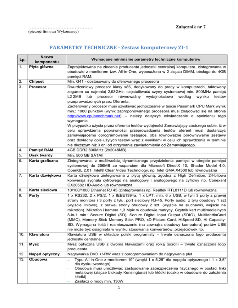 …………………………………. Załącznik nr 7 (pieczęć firmowa Wykonawcy) PARAMETRY TECHNICZNE - Zestaw komputerowy ZI-1 1. Nazwa komponentu Płyta główna 2. 3. Chipset Procesor 4. 5. 6. Pamięć RAM Dysk twardy Karta graficzna 7. Karta dźwiękowa 8. 9. Karta sieciowa Porty 10. Klawiatura 11. Mysz 12. 13. Napęd optyczny Obudowa Lp. Wymagane minimalne parametry techniczne komputerów Zaprojektowana na zlecenie producenta jednostki centralnej komputera, zintegrowana w obudowie z monitorem tzw. All-in-One, wyposażona w 2 złącza DIMM, obsługa do 4GB pamięci RAM; Min. G41 - dostosowany do oferowanego procesora Dwurdzeniowy procesor klasy x86, dedykowany do pracy w komputerach, taktowany zegarem co najmniej 2,93GHz, częstotliwość szyny systemowej min. 800MHz pamięć L2 2MB lub procesor równoważny wydajnościowo według wyniku testów przeprowadzonych przez Oferenta. Zaoferowany procesor musi uzyskiwać jednocześnie w teście Passmark CPU Mark wynik min.: 1980 punktów (wynik zaproponowanego procesora musi znajdować się na stronie http://www.cpubenchmark.net) – należy dołączyć oświadczenie o spełnieniu tego wymagania W przypadku użycia przez oferenta testów wydajności Zamawiający zastrzega sobie, iż w celu sprawdzenia poprawności przeprowadzenia testów oferent musi dostarczyć zamawiającemu oprogramowanie testujące, oba równoważne porównywalne zestawy oraz dokładny opis użytych testów wraz z wynikami w celu ich sprawdzenia w terminie nie dłuższym niż 3 dni od otrzymania zawiadomienia od Zamawiającego. 4GB DDR2 800MHz (2x2048MB) Min. 500 GB SATAII Zintegrowana, z możliwością dynamicznego przydzielenia pamięci w obrębie pamięci systemowej do 256MB ze wsparciem dla Microsoft DirectX 10, Shader Model 4.0, OpenGL 2.01, Intel® Clear Video Technology, np. Intel GMA X4500 lub równoważna Karta dźwiękowa zintegrowana z płytą główną, zgodna z High Definition, 24-bitowa konwersja sygnału cyfrowego na analogowy i analogowego na cyfrowy np. Conexant CX20582 HD-Audio lub równoważna 10/100/1000 Ethernet RJ 45 (zintegrowana) np. Realtek RTL8111D lub równoważna 1 x RS232, 2 x PS/2, 1 x IEEE1394a, 1 x LPT; min. 6 x USB, w tym 3 porty z prawej strony monitora i 3 porty z tyłu, port sieciowy RJ-45. Porty audio: z tyłu obudowy 1 szt (wyjście liniowe), z prawej strony obudowy 2 szt. (wyjście na słuchawki, wejście na mikrofon). Mikrofon i kamera 1,3 Mpix w obudowie matrycy. Czytnik kart multimedialnych 8-in-1 min.: Secure Digital (SD), Secure Digital Input Output (SDIO), MultiMediaCard (MMC), Memory Stick Memory Stick PRO, xD-Picture Card, HiSpeed-SD, Hi CapacitySD. Wymagana ilość i rozmieszczenie (na zewnątrz obudowy komputera) portów USB nie może być osiągnięta w wyniku stosowania konwerterów, przejściówek itp. Klawiatura USB w układzie polski programisty – trwale oznaczona logo producenta jednostki centralnej Mysz optyczna USB z dwoma klawiszami oraz rolką (scroll) – trwale oznaczona logo producenta Nagrywarka DVD +/-RW wraz z oprogramowaniem do nagrywania płyt Typu All-in-One z monitorem 19” (wnęki 1 x 5,25” dla napędu optycznego i 1 x 3,5” dla dysku twardego) Obudowa musi umożliwiać zastosowanie zabezpieczenia fizycznego w postaci linki metalowej (złącze blokady Kensingtona) lub kłódki (oczko w obudowie do założenia kłódki) Zasilacz o mocy min. 130W 1 14. System operacyjny 15. Certyfikaty i standardy 16. Gwarancja 18. Wsparcie Microsoft Windows 7 Professional PL 32-bit, zainstalowany system operacyjny niewymagający aktywacji za pomocą telefonu lub Internetu w firmie Microsoft. Dołączony nośnik z oprogramowaniem Certyfikat ISO9001 dla producenta sprzętu (załączyć dokument potwierdzający spełnianie wymogu) Oferowane modele komputerów muszą posiadać certyfikat Microsoft, potwierdzający poprawną współpracę oferowanych modeli komputerów z ww. systemem operacyjnym Windows 7 w wersji 32 (załączyć wydruk ze strony Microsoft WHCL) Głośność jednostki centralnej mierzona zgodnie z normą ISO 7779 oraz wykazana zgodnie z normą ISO 9296 w pozycji obserwatora w trybie jałowym (IDLE) wynosząca maksymalnie 17 dB (załączyć oświadczenie producenta wraz z raportem badawczym wystawionym przez niezależną akredytowaną jednostkę) Deklaracja zgodności CE (załączyć do oferty) 5 lat na miejscu u klienta Czas reakcji serwisu - do końca następnego dnia roboczego Firma serwisująca musi posiadać ISO 9001:2000 na świadczenie usług serwisowych oraz posiadać autoryzacje producenta komputera – dokumenty potwierdzające załączyć do oferty. Oświadczenie producenta komputera, że w przypadku nie wywiązywania się z obowiązków gwarancyjnych oferenta lub firmy serwisującej, przejmie na siebie wszelkie zobowiązania związane z serwisem. Możliwość telefonicznego sprawdzenia konfiguracji sprzętowej komputera oraz warunków gwarancji po podaniu numeru seryjnego bezpośrednio u producenta lub jego przedstawiciela. Dostęp do najnowszych sterowników i uaktualnień na stronie producenta zestawu realizowany poprzez podanie na dedykowanej stronie internetowej producenta numeru seryjnego lub modelu komputera – do oferty należy dołączyć link strony. techniczne producenta Nazwa urządzenia: …………………………………………………………………………….. Cena netto za 1 sztukę: ……………… x 40 sztuk = Wartość netto: …………………. PLN Podatek VAT 0% ……………………………… ……………………………….. (Podpis i pieczęć osoby upoważnionej do składania oświadczeń w imieniu Wykonawcy) (Data) 2