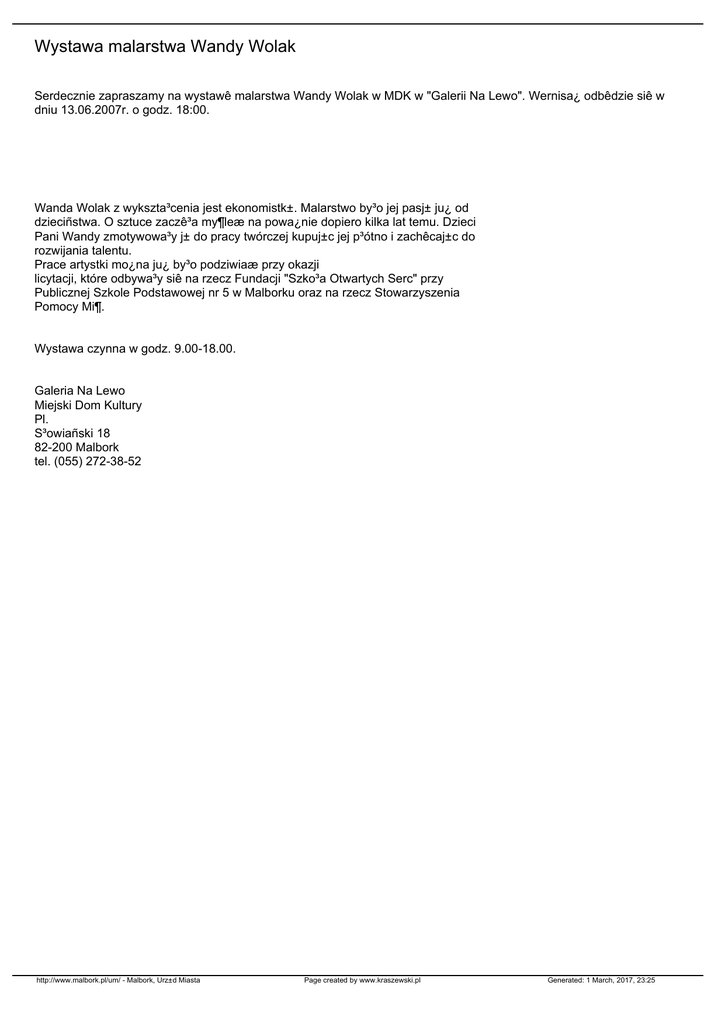 Wystawa malarstwa Wandy Wolak Serdecznie zapraszamy na wystawê malarstwa Wandy Wolak w MDK w "Galerii Na Lewo". Wernisa¿ odbêdzie siê w dniu 13.06.2007r. o godz. 18:00. Wanda Wolak z wykszta³cenia jest ekonomistk±. Malarstwo by³o jej pasj± ju¿ od dzieciñstwa. O sztuce zaczê³a my¶leæ na powa¿nie dopiero kilka lat temu. Dzieci Pani Wandy zmotywowa³y j± do pracy twórczej kupuj±c jej p³ótno i zachêcaj±c do rozwijania talentu. Prace artystki mo¿na ju¿ by³o podziwiaæ przy okazji licytacji, które odbywa³y siê na rzecz Fundacji "Szko³a Otwartych Serc" przy Publicznej Szkole Podstawowej nr 5 w Malborku oraz na rzecz Stowarzyszenia Pomocy Mi¶. Wystawa czynna w godz. 9.00-18.00. Galeria Na Lewo Miejski Dom Kultury Pl. S³owiañski 18 82-200 Malbork tel. (055) 272-38-52 http://www.malbork.pl/um/ - Malbork, Urz±d Miasta Page created by www.kraszewski.pl Generated: 1 March, 2017, 23:25