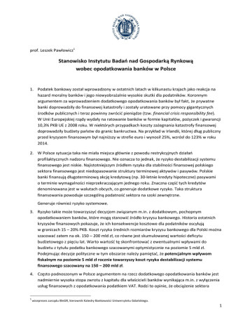 prof. Leszek Pawłowicz1 Stanowisko Instytutu Badań nad Gospodarką Rynkową wobec opodatkowania banków w Polsce 1. Podatek bankowy został wprowadzony w ostatnich latach w kilkunastu krajach jako reakcja na hazard moralny banków i jego niewyobrażalnie wysokie skutki dla podatników. Koronnym argumentem za wprowadzeniem dodatkowego opodatkowania banków był fakt, że prywatne banki doprowadziły do finansowej katastrofy i zostały uratowane przy pomocy gigantycznych środków publicznych i teraz powinny zwrócić pieniądze (tzw. financial crisis responsibility fee). W Unii Europejskiej rządy wydały na ratowanie banków w formie kapitałów, pożyczek i gwarancji 10,3% PKB UE z 2008 roku. W niektórych przypadkach koszty zażegnania katastrofy finansowej doprowadziły budżety państw do granic bankructwa. Na przykład w Irlandii, której dług publiczny przed kryzysem finansowym był najniższy w strefie euro i wynosił 25%, wzrósł do 123% w roku 2014. 2. W Polsce sytuacja taka nie miała miejsca głównie z powodu restrykcyjnych działań profilaktycznych nadzoru finansowego. Nie oznacza to jednak, że ryzyko destabilizacji systemu finansowego jest niskie. Najistotniejszym źródłem ryzyka dla stabilności finansowej polskiego sektora finansowego jest niedopasowanie struktury terminowej aktywów i pasywów. Polskie banki finansują długoterminową akcję kredytową (np. 30-letnie kredyty hipoteczne) pasywami o terminie wymagalności nieprzekraczającym jednego roku. Znaczna część tych kredytów denominowana jest w walutach obcych, co generuje dodatkowe ryzyko. Taka struktura finansowania powoduje szczególną podatność sektora na szoki zewnętrzne. Generuje również ryzyko systemowe. 3. Ryzyko takie może towarzyszyć decyzjom związanym m.in. z dodatkowym, pochopnym opodatkowaniem banków, które mogą stanowić źródło kryzysu bankowego. Historia ostatnich kryzysów finansowych pokazuje, że ich konsekwencje kosztowe dla podatników oscylują w granicach 15 – 20% PKB. Koszt ryzyka średnich rozmiarów kryzysu bankowego dla Polski można szacować zatem na ok. 150 – 200 mld zł, co równe jest skumulowanej wartości deficytu budżetowego z pięciu lat. Warto wartość tę skonfrontować z ewentualnymi wpływami do budżetu z tytułu podatku bankowego szacowanymi optymistycznie na poziomie 5 mld zł. Podejmując decyzje polityczne w tym obszarze należy pamiętać, że potencjalnym wpływom fiskalnym na poziomie 5 mld zł rocznie towarzyszy koszt ryzyka destabilizacji systemu finansowego szacowany na 150 – 200 mld zł. 4. Często podnoszonym w Polsce argumentem na rzecz dodatkowego opodatkowania banków jest nadmiernie wysoka stopa zwrotu z kapitału dla właścicieli banków wynikająca m.in. z wyłączenia usług finansowych z opodatkowania podatkiem VAT. Rodzi to opinie, że obciążenie sektora 1 wiceprezes zarządu IBnGR, kierownik Katedry Bankowości Uniwersytetu Gdańskiego. 1 bankowego na rzecz budżetu jest zbyt niskie, a koszty pośrednictwa finansowego są zbyt wysokie, z czego wynika niezasłużenie wysoka rentowność banków. Teza o nadmiernie wysokiej rentowności banków, mająca swoje uzasadnienie w przeszłości, nie znajduje obecnie potwierdzenia w faktach. Od kryzysu finansowego w latach 2008 – 2009 RoE sektora bankowego pozostaje na zbliżonym poziomie do innych sektorów gospodarki2. Średnia stopa zwrotu z zainwestowanych kapitałów (RoE) w polskim sektorze bankowym wynosi obecnie ok. 10% i jest istotnie niższa niż np. w budownictwie czy przemyśle chemicznym3. Przewidywana i oczekiwana stopa zwrotu z kapitału będzie w 2016 roku i najbliższych kilku latach znacznie niższa z powodu konieczności wdrożenia europejskich restrykcji regulacyjnych a ponadto dodatkowych krajowych opłat o charakterze parapodatków, m.in. z wyższych opłat na Bankowy Fundusz Gwarancyjny, opłat na rzecz funduszu wsparcia dla kredytobiorców mieszkaniowych (600 mln zł), a także kosztów restrukturyzacji kredytów CHF, szacowanych minimalnie na 13,6 mld zł. W rezultacie, nawet bez dodatkowego podatku bankowego, realne obciążenie banków będzie znacznie wyższe od oficjalnej stopy opodatkowania. Wprowadzenie w tych warunkach dodatkowego podatku bankowego, może spowodować, że oczekiwana stopa zwrotu z kapitału będzie odstraszała inwestorów, a relatywnie dobra kapitalizacja i bezpieczeństwo polskiego sektora bankowego mogą przestać być atutem polskiej gospodarki. Rozważając opodatkowanie sektora bankowego należy zatem nie tylko odpowiedzieć na pytanie ile powinny zarabiać banki, aby był to zarobek akceptowalny społecznie, ale również uwzględnić ryzyko zniszczenia atrakcyjności inwestycyjnej sektora dla prywatnego kapitału i konieczność zaangażowania środków publicznych w celu zapewnienia bezpieczeństwa systemu finansowego. 5. Powyższe konstatacje nie oznaczają jednak, że banki nie powinny być obciążone na rzecz dobra wspólnego, szczególnie na rzecz wzrostu stabilności systemu finansowego. W istocie mamy do czynienia z wyborem między fiskalnym celem opodatkowania banków, z natury krótkookresowym, a „opodatkowaniem” którego celem jest wzrost stabilności systemu finansowego oznaczający redukcję ryzyka dla finansów publicznych w dłuższym okresie czasu. Znaczna część krajów UE, które wprowadziły podatek bankowy przeznacza wpływy z tego podatku na fundusze stabilizacyjne (np. Niemcy, Szwecja, Belgia, Cypr, Słowacja i Portugalia). 6. Lepszym rozwiązaniem dla Polski niż dodatkowe opodatkowanie banków w celach fiskalnych, jest wybór takich rozwiązań, które skłaniałyby banki do bycia bardziej bezpiecznymi, również przy pomocy parapodatków na rzecz funduszy stabilizacyjnych. W Polsce funduszami takimi zarządza Bankowy Fundusz Gwarancyjny (BFG)4. Warto zauważyć, że środki zgromadzone w BFG są częścią finansów publicznych5. Oznacza to, że środki zgromadzone w BFG wzmacniają fundu