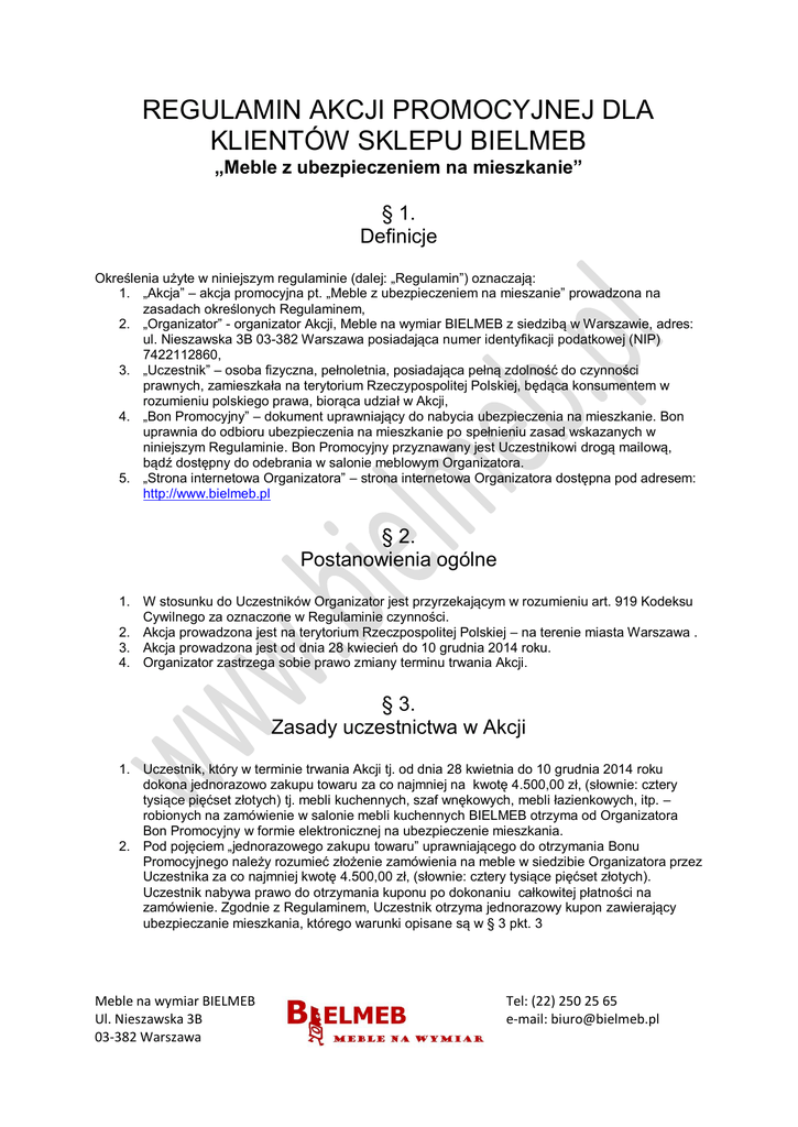 REGULAMIN AKCJI PROMOCYJNEJ DLA KLIENTÓW SKLEPU BIELMEB „Meble z ubezpieczeniem na mieszkanie” § 1. Definicje Określenia użyte w niniejszym regulaminie (dalej: „Regulamin”) oznaczają: 1. „Akcja” – akcja promocyjna pt. „Meble z ubezpieczeniem na mieszanie” prowadzona na zasadach określonych Regulaminem, 2. „Organizator” - organizator Akcji, Meble na wymiar BIELMEB z siedzibą w Warszawie, adres: ul. Nieszawska 3B 03-382 Warszawa posiadająca numer identyfikacji podatkowej (NIP) 7422112860, 3. „Uczestnik” – osoba fizyczna, pełnoletnia, posiadająca pełną zdolność do czynności prawnych, zamieszkała na terytorium Rzeczypospolitej Polskiej, będąca konsumentem w rozumieniu polskiego prawa, biorąca udział w Akcji, 4. „Bon Promocyjny” – dokument uprawniający do nabycia ubezpieczenia na mieszkanie. Bon uprawnia do odbioru ubezpieczenia na mieszkanie po spełnieniu zasad wskazanych w niniejszym Regulaminie. Bon Promocyjny przyznawany jest Uczestnikowi drogą mailową, bądź dostępny do odebrania w salonie meblowym Organizatora. 5. „Strona internetowa Organizatora” – strona internetowa Organizatora dostępna pod adresem: http://www.bielmeb.pl § 2. Postanowienia ogólne 1. W stosunku do Uczestników Organizator jest przyrzekającym w rozumieniu art. 919 Kodeksu Cywilnego za oznaczone w Regulaminie czynności. 2. Akcja prowadzona jest na terytorium Rzeczpospolitej Polskiej – na terenie miasta Warszawa . 3. Akcja prowadzona jest od dnia 28 kwiecień do 10 grudnia 2014 roku. 4. Organizator zastrzega sobie prawo zmiany terminu trwania Akcji. § 3. Zasady uczestnictwa w Akcji 1. Uczestnik, który w terminie trwania Akcji tj. od dnia 28 kwietnia do 10 grudnia 2014 roku dokona jednorazowo zakupu towaru za co najmniej na kwotę 4.500,00 zł, (słownie: cztery tysiące pięćset złotych) tj. mebli kuchennych, szaf wnękowych, mebli łazienkowych, itp. – robionych na zamówienie w salonie mebli kuchennych BIELMEB otrzyma od Organizatora Bon Promocyjny w formie elektronicznej na ubezpieczenie mieszkania. 2. Pod pojęciem „jednorazowego zakupu towaru” uprawniającego do otrzymania Bonu Promocyjnego należy rozumieć złożenie zamówienia na meble w siedzibie Organizatora przez Uczestnika za co najmniej kwotę 4.500,00 zł, (słownie: cztery tysiące pięćset złotych). Uczestnik nabywa prawo do otrzymania kuponu po dokonaniu całkowitej płatności na zamówienie. Zgodnie z Regulaminem, Uczestnik otrzyma jednorazowy kupon zawierający ubezpieczanie mieszkania, którego warunki opisane są w § 3 pkt. 3 Meble na wymiar BIELMEB Ul. Nieszawska 3B 03-382 Warszawa Tel: (22) 250 25 65 e-mail: [email protected] 3. Ubezpieczanie zawierane będzie w agencji – Dobre Tanie Ubezpieczenia Jakub Śliwiński z siedzibą w Warszawie, adres: ul. Nieszawska 3B, 03-382. Przedmiot i zakres ubezpieczenia określony jest w § 4 4. Uczestnik może skorzystać z promocji jedynie w przypadku, gdy zapozna się z regulaminem oraz zaakceptuje jego warunki 5. Zawarcie polisy ubezpieczeniowej nie może nastąpić później niż 90 dni od otrzymania bonu promocyjnego. 6. Informacja o ofercie promocyjnej przekazywana jest klientom na stronie internetowej, poprzez mailing, bannery, linki tekstowe na portalach wykorzystywanych do akcji oraz w salonie meblowym BIELMEB. 7. Uczestnikowi nie przysługuje prawo żądania wymiany rabatu na ekwiwalent pieniężny. § 4. Warunki Ubezpieczenia 1. Ubezpieczenie zawierane będzie wyłącznie przez agencję Dobre Tanie Ubezpieczenia Jakub Śliwiński 03-382 Warszawa ul. Nieszawska 3 B. 2. Ubezpieczenie Domów i mieszkań dokonywane jest w towarzystwie ubezpieczeniowym Gothaer z siedzibą w Warszawie ul. Wołoska 22A, 02-675 Warszawa 3. Polisa zawarta zostanie na okres jednego roku. 4. Ubezpieczanie Domów i mieszkań – Cztery kąty obejmuje przy zakupie mebli na kwotę minimum 4.500,00 zł, (słownie: cztery tysiące pięćset złotych) obejmuje: a) Stałe elementy wnętrz – suma ubezpieczenia: 10.000,00 zł b) Ruchomości domowe – suma ubezpieczenia: 10.000,00 zł c) Kradzież z włamaniem, dewastacja, rozbój – 5.000,00 zł d) OC w życiu prywatnym – 30.000,00 zł 5. Ubezpieczanie Domów i mieszkań – Cztery kąty obejmuje przy zakupie mebli na kwotę minimum 7.500,00 zł, (słownie: siedem tysiący pięćset złotych) obejmuje: e) Stałe elementy wnętrz – suma ubezpieczenia: 20.000,00 zł f) Ruchomości domowe – suma ubezpieczenia: 20.000,00 zł g) Kradzież z włamaniem, dewastacja, rozbój – 8.000,00 zł h) OC w życiu prywatnym – 50.000,00 zł 6. Ogólne Warunki Ubezpieczenia dostępne są u organizatora akcji. § 5. Postanowienia końcowe 1. Regulamin niniejszej Akcji jest dostępny na Stronie internetowej Organizatora, oraz w siedzibie Organizatora 2. Przed wzięciem udziału w Akcji Uczestnik powinien zapoznać się z Regulaminem. 3. Niniejsza Akcja Promocyjna nie łączy się z innymi akcjami promocyjnymi trwającymi w tym samym czasie. 4. Szczegóły dotyczące informacji technicznych dostępne są w Salonach Mebli Bielmeb oraz w Dziale Obsługi Klienta pod numerem telefonu +48 (22) 250 25 65 Meble na wymiar BIELMEB Ul. Nieszawska 3B 03-382 Warszawa Tel: (22) 250 25 65 e-mail: [email protected]