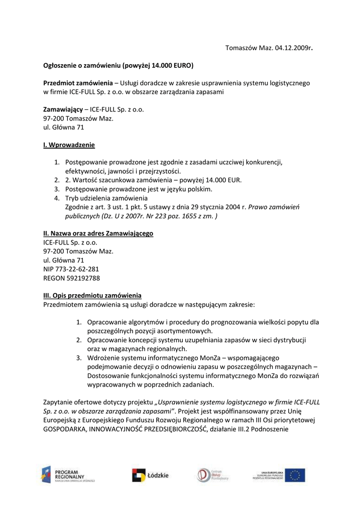 Tomaszów Maz. 04.12.2009r. Ogłoszenie o zamówieniu (powyżej 14.000 EURO) Przedmiot zamówienia – Usługi doradcze w zakresie usprawnienia systemu logistycznego w firmie ICE-FULL Sp. z o.o. w obszarze zarządzania zapasami Zamawiający – ICE-FULL Sp. z o.o. 97-200 Tomaszów Maz. ul. Główna 71 I. Wprowadzenie 1. Postępowanie prowadzone jest zgodnie z zasadami uczciwej konkurencji, efektywności, jawności i przejrzystości. 2. 2. Wartośd szacunkowa zamówienia – powyżej 14.000 EUR. 3. Postępowanie prowadzone jest w języku polskim. 4. Tryb udzielenia zamówienia Zgodnie z art. 3 ust. 1 pkt. 5 ustawy z dnia 29 stycznia 2004 r. Prawo zamówieo publicznych (Dz. U z 2007r. Nr 223 poz. 1655 z zm. ) II. Nazwa oraz adres Zamawiającego ICE-FULL Sp. z o.o. 97-200 Tomaszów Maz. ul. Główna 71 NIP 773-22-62-281 REGON 592192788 III. Opis przedmiotu zamówienia Przedmiotem zamówienia są usługi doradcze w następującym zakresie: 1. Opracowanie algorytmów i procedury do prognozowania wielkości popytu dla poszczególnych pozycji asortymentowych. 2. Opracowanie koncepcji systemu uzupełniania zapasów w sieci dystrybucji oraz w magazynach regionalnych. 3. Wdrożenie systemu informatycznego MonZa – wspomagającego podejmowanie decyzji o odnowieniu zapasu w poszczególnych magazynach – Dostosowanie funkcjonalności systemu informatycznego MonZa do rozwiązao wypracowanych w poprzednich zadaniach. Zapytanie ofertowe dotyczy projektu „Usprawnienie systemu logistycznego w firmie ICE-FULL Sp. z o.o. w obszarze zarządzania zapasami”. Projekt jest współfinansowany przez Unię Europejską z Europejskiego Funduszu Rozwoju Regionalnego w ramach III Osi priorytetowej GOSPODARKA, INNOWACYJNOŚD PRZEDSIĘBIORCZOŚD, działanie III.2 Podnoszenie innowacyjności i konkurencyjności przedsiębiorstw w ramach Regionalnego Programu Operacyjnego Województwa Łódzkiego na lata 2007-2013. Ogłoszenie dotyczy przedmiotu zamówienia opisanego powyżej lub równoważnego. IV. Opis sposobu obliczania ceny Wartośd szacunkowa zamówienia określona została na podstawie analizy rynku w zakresie ceny podczas sporządzania wniosku o dofinansowanie projektu „Usprawnienie systemu logistycznego w firmie ICE-FULL Sp. z o.o. w obszarze zarządzania zapasami”. Ocena wg kryterium ceny – ranga kryterium – 100% Kryterium cena – obliczana jest wg wzoru: C=(Cmin/Cb) X 100% gdzie: C – cena Cmin – cena najniższa Cb – cena badana a) Zamawiający przyjmie do oceny podaną przez Wykonawców cenę netto w złotych. b) Zamawiający zastosuje zaokrąglenie wyników do dwóch miejsc po przecinku. c) 1% odpowiada 1 punktowi przyjętemu do oceny. V. Termin składania ofert Termin składania ofert – 14 dni. VI. Opis warunków udziału w postępowaniu O udzielenie zamówienia może ubiegad się Wykonawca spełniający następujące warunki: posiada odpowiednie uprawnienia do wykonywania określonej działalności lub czynności, posiada niezbędną wiedzę i doświadczenie oraz dysponuje potencjałem kadrowym, znajduje się w sytuacji ekonomicznej i finansowej zapewniającej wykonanie działania, nie podlega wykluczeniu w oparciu o zapisy zawarte w art. 24 ust. 1 i 2 ustawy Prawo zamówieo publicznych. VII. Informacje o sposobie porozumiewania się zamawiającego z wykonawcą oraz przekazywania oświadczeo i dokumentów. W przedmiotowym postępowaniu Zamawiający dopuszcza możliwośd przekazywania sobie przez strony postępowania informacji na adres: ICE-FULL Sp. z o.o., 97-200 Tomaszów Maz. ul. Główna 71, lub na adres e-mail [email protected], lub nr tel. 605-400-364 VIII. Wskazanie osób uprawnionych do porozumiewania się z wykonawcą Do porozumiewania się z Wykonawcą w sprawach związanych z postępowaniem upoważnia się p. Tadeusza Mikulskiego , nr tel. 605-400-364 IX. Termin związania wykonawcy ofertą Czas trwania projektu 1 stycznia 2010 r. – 30 lipca 2010 r. X. Opis kryteriów, którymi Zamawiający będzie się kierował przy wyborze oferty Przy wyborze ofert Zamawiający będzie kierował się : ceną – 100% XI. Projekt współfinansowany ze środków Europejskiego Funduszu Rozwoju Regionalnego oraz Budżetu Paostwa