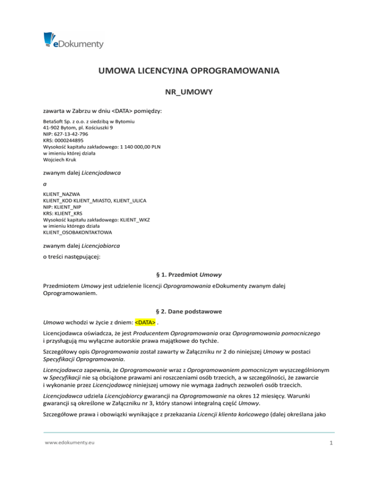 =+ UMOWA LICENCYJNA OPROGRAMOWANIA NR_UMOWY zawarta w Zabrzu w dniu <DATA> pomiędzy: BetaSoft Sp. z o.o. z siedzibą w Bytomiu 41-902 Bytom, pl. Kościuszki 9 NIP: 627-13-42-796 KRS: 0000244895 Wysokość kapitału zakładowego: 1 140 000,00 PLN w imieniu której działa Wojciech Kruk zwanym dalej Licencjodawca a KLIENT_NAZWA KLIENT_KOD KLIENT_MIASTO, KLIENT_ULICA NIP: KLIENT_NIP KRS: KLIENT_KRS Wysokość kapitału zakładowego: KLIENT_WKZ w imieniu którego działa KLIENT_OSOBAKONTAKTOWA zwanym dalej Licencjobiorca o treści następującej: § 1. Przedmiot Umowy Przedmiotem Umowy jest udzielenie licencji Oprogramowania eDokumenty zwanym dalej Oprogramowaniem. § 2. Dane podstawowe Umowa wchodzi w życie z dniem: <DATA> . Licencjodawca oświadcza, że jest Producentem Oprogramowania oraz Oprogramowania pomocniczego i przysługują mu wyłączne autorskie prawa majątkowe do tychże. Szczegółowy opis Oprogramowania został zawarty w Załączniku nr 2 do niniejszej Umowy w postaci Specyfikacji Oprogramowania. Licencjodawca zapewnia, że Oprogramowanie wraz z Oprogramowaniem pomocniczym wyszczególnionym w Specyfikacji nie są obciążone prawami ani roszczeniami osób trzecich, a w szczególności, że zawarcie i wykonanie przez Licencjodawcę niniejszej umowy nie wymaga żadnych zezwoleń osób trzecich. Licencjodawca udziela Licencjobiorcy gwarancji na Oprogramowanie na okres 12 miesięcy. Warunki gwarancji są określone w Załączniku nr 3, który stanowi integralną część Umowy. Szczegółowe prawa i obowiązki wynikające z przekazania Licencji klienta końcowego (dalej określana jako www.edokumenty.eu 1 =+ Licencja) określa formularz Licencji, który jest integralną częścią Umowy jako Załącznik nr 4. Licencjodawca nie ponosi odpowiedzialności za szkody będące następstwem nieprawidłowego używania Oprogramowania przez Licencjobiorcę. § 3. Nabycie Licencji Oprogramowania 1. Licencjobiorca na podstawie niniejszej umowy nabywa Licencję, dla <LICZBA> jednoczesnych, Nazwanych Użytkowników. Zainstalowanie Oprogramowania na większej liczbie stanowisk – niż przewidziane niniejszą Umową wymaga zakupu Licencji dla dodatkowych Nazwanych Użytkowników. Licencja ma charakter niewyłączny i została udzielona na czas nieoznaczony. Nabycie Licencji Oprogramowania upoważnia Licencjobiorcę do darmowego Upgrade’u Oprogramowania oraz Oprogramowania pomocniczego w okresie trwania gwarancji, chyba, że zmiany w Oprogramowaniu są wynikiem celowej Modyfikacji uwzględnionej w Specyfikacji lub Analizie przedwdrożeniowej i podlegają odrębnej wycenie. Prace związane z dostarczeniem Upgrade’u, zainstalowaniem i przeszkoleniem pracowników Licencjobiorcy przez przedstawiciela Licencjodawcy podlegają rozliczeniu w kwocie osobogodziny ustalonej dla realizacji Prac wdrożeniowych określonych w odrębnej umowie realizacji prac wdrożeniowych. Nabycie Licencji Oprogramowania upoważnia Licencjobiorcę do darmowego Update’u Oprogramowania oraz Oprogramowania pomocniczego w okresie trwania gwarancji bez ponoszenia kosztów finansowych z zastrzeżeniem zapisów określonych w gwarancji. Wszelkie działania związane z procesem analizy (Analiza przedwdrożeniowa), wdrożeniem (Prace wdrożeniowe) oraz opieką powdrożeniową (Opieka konserwacyjna i serwisowa) dla Oprogramowania nie są objęte niniejszą umową. § 4. Zakończenie Umowy 1. Licencjobiorca ma prawo do rozwiązania Umowy ze skutkiem natychmiastowym, jeżeli: 1.1. Licencjodawca dokona naruszenia postanowień Umowy i nie dokona naprawy takiego naruszenia w ciągu 30 dni od daty otrzymania pisemnego zawiadomienia o takim naruszeniu, 1.2. Licencjodawca zostanie postawiony w stan przymusowej lub dobrowolnej likwidacji, w celu innym niż połączenie lub przekształcenie własnościowe. 2. Licencjodawca ma prawo do rozwiązania Umowy ze skutkiem natychmiastowym, jeżeli: 2.1. Licencjobiorca dopuści się naruszenia postanowień niniejszej Umowy i nie dokona naprawy takiego naruszenia w ciągu 30 dni od daty otrzymania przez Licencjobiorcę pisemnego zawiadomienia o takim naruszeniu, 2.2. Licencjobiorca zostanie postawiony w stan upadłości lub zostanie otwarty proces jego likwidacji, w celu innym niż połączenie lub przekształcenie własnościowe. § 5. Inne postanowienia 1. Licencjobiorca wyraża zgodę na umieszczenie jego danych oraz znaku graficznego na Materiałach marketingowych Licencjodawcy w odniesieniu do przedmiotu niniejszej Umowy. 2. Strony Umowy zgadzają się, że fakt podpisania Umowy nie jest objęty poufnością chyba, że którakolwiek www.edokumenty.eu 2 =+ ze Stron przedstawi na piśmie żądanie objęcia wyżej wymienionych faktów poufnością. 3. Strony Umowy oświadczają, że przyjmują do wiadomości i wyrażają zgodę na to, że warunki oraz sposób realizacji Umowy przez Strony uważane są za istotną tajemnicę handlową objętą, bez ograniczenia w czasie, poufnością za wyjątkiem sytuacji w której Użytkownik jest zobowiązany do udzielenia tych informacji na podstawie obowiązującej Ustawy o dostępie do informacji publicznej. 4. Żadna ze Stron nie będzie odpowiedzialna za jakikolwiek przypadek niewykonania lub zwłoki w wykonaniu swoich zobowiązań wynikających z Umowy, powstałych w wyniku okoliczności uzasadnionych Siłą wyższą. Strony ustalają, iż wszystkie kwestie sporne wynikające z w/w sytuacji regulować będą przepisy Kodeksu Cywilnego, natomiast warunkiem koniecznym jest, aby Strona powołująca się na tę klauzulę zawiadomiła w terminie 7 dni od ich zaistnienia drugą ze Stron o zaszłych okolicznościach i prawdopodobnym czasie ich trwania. 5. Ważność, interpretacja i wykonywanie Umowy będzie nadzorowane i interpretowane zgodnie z odpowiednimi przepisami Kodeksu Cywilnego i Ustawy o Prawie autorskim i prawach pokrewnych z dnia 4 lutego 1994. 6. W razie powstania sporu pomiędzy Stronami na tle realizacji Umowy, przed wystąpieniem na drogę s