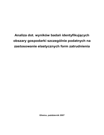Analiza dot. wyników badań identyfikujących obszary gospodarki szczególnie podatnych na zastosowanie elastycznych form zatrudnienia Gliwice, październik 2007 SPIS TREŚCI Wstęp I. Analiza dot. wyników badań identyfikujących obszary gospodarki szczególnie podatnych na zastosowanie elastycznych form zatrudnienia I.I. Wyniki badań na temat „rodzic-pracownik – rozwój zawodowy rodziców podczas urlopu wychowawczego” I.II. I.III Studium badawcze Projektu „Praca dla dwojga” – I Etap Studium badawcze Projektu „Praca dla dwojga” – II Etap I.IV. Analiza badań na temat wykorzystania elastycznych form pracy w badanych przedsiębiorstwach przeprowadzonych w województwie podlaskim – okolice białegostoku II. Wnioski i podsumowania Bibliografia WSTĘP Bieżący rozwój gospodarczy i społeczny w Unii Europejskiej charakteryzuje się rosnącym ryzykiem i niepewnością. Rok 2006 przyniósł umiarkowany wzrost gospodarczy a ogólny wzrost liczby osób pozostających bez pracy zatrzymał się, przynajmniej tymczasowo. Jednak poziom bezrobocia pozostaje niedopuszczalnie wysoki – 8,0%. W tym samym czasie niestabilność warunków pracy i ubóstwo osób bezrobotnych, jak również 14 milionów zatrudnionych, zwiększyły się, podczas gdy – z drugiej strony – nastąpiła eksplozja zysków firm i dalszy wzrost liczby europejskich milionerów. Ponadprzeciętna stopa ubóstwa wśród dzieci (20%) i wśród osób starszych (18%). Wzrost gospodarczy w UE był w pierwszych pięciu latach dekady słaby, przeciętnie 1,7% rocznie (w strefie euro, 1,4% rocznie). Wzrost gospodarczy w 2006 r. na poziomie 2,8% dla Krajów Unii (2,6% w strefie euro), wydaje się być zjawiskiem przejściowym, gdyż większość głównych instytucji przewiduje ponowne spowolnienie gospodarcze. W tym samym czasie wzrost wydajności był ogólnie niski: 2 około 1,2% rocznie (0,9% w strefie euro) w latach 2001-2005 i 1,3% (1,2% w strefie euro) w 2006 r. (W Stanach Zjednoczonych w podanym wyżej pięcioleciu wyniósł on 2,2% rocznie). Znaczący wzrost produkcji i wydajności nastąpił jedynie w nowych państwach członkowskich z Europy Środkowo-Wschodniej jednak nie wiązał się z odpowiednia poprawa sytuacji społecznej. Kraje Europy Środkowo-Wschodniej są regionem o najszybszym wzroście gospodarczym, ale bezrobocie utrzymuje się na bardzo wysokim poziomie.: Słowacja (12,0%) i Polska (12,8%) wg danych na koniec 2006r., wykazują najwyższe stopy bezrobocia w Europie. W tych krajach wysoka stopa bezrobocia ma szczególnie drastyczny wpływ na warunki życia, ponieważ wydatki publiczne na opiekę socjalna są niższe niż w Unii Europejskiej (odpowiednio 27,6% PKB i 18,5% PKB). Zróżnicowanie wyników ekonomicznych ma również odzwierciedlenie w narastających różnicach w rachunkach bieżących bilansu płatniczego. Podczas gdy niektóre kraje notują znaczna nadwyżkę w rachunku bieżącym, np. Holandia (7,6% PKB), Szwecja (6,3%PKB) i Niemcy (4,5% PKB), inne maja wysokie deficyty. Łotwa i Estonia maja dwucyfrowe procentowe wskaźniki deficytu, w Portugalii deficyt ten wynosi 9,0% PKB, na Słowacji, w Grecji, Hiszpanii i na Węgrzech deficyty przekraczają 7% PKB. Pomimo, że ta sytuacja na rachunku bieżącym jest w niektórych przypadkach produktem ubocznym nieprzeciętnych wyników wzrostu gospodarczego, to jest ona równoznaczna z niebezpieczna nierównowaga, która zagraża spójności ekonomicznej i politycznej Unii Europejskiej. Dla krajów, które jeszcze nie wprowadziły euro może ona wywołać presje na dewaluacje, a to z kolei może zwiększyć niestabilność na rynkach walutowych. Pomimo zróżnicowanych wyników poszczególnych krajów członkowskich w stosunkach z otoczeniem zewnętrznym, pozycja Unii Europejskiej w światowej gospodarce jest silna. Unia jest największym i najważniejszym na świecie ugrupowaniem handlowym. Mimo spektakularnego pojawienia się na globalnej scenie krajów azjatyckich, w szczególności Indii i Chin, Unia Europejska była zdolna zwiększyć swój udział w rynku towarów i utrzymać wiodącą role na rynku usług. Jej pozycja rynkowa wzmacniała się od lat 90-tych XX w., kiedy handel zewnętrzny Unii Europejskiej znacznie powiększył się zarówno w zakresie towarów jak i usług. Udział zewnętrznego obrotu towarowego (eksport plus import) krajów unijnych w stosunku 3 do PKB wzrósł z 14,92% w 1991 r. do 21,86% w 2004 r. Dla usług wskaźnik ten wzrósł z 5,51% w 1990 r. do 7,12% w 2004 r. Unia zdołała zwiększyć swój udział w światowym eksporcie towarów z 16% w 1991 r. do 20% w 2004 r. W eksporcie usług nastąpiły podobne zmiany. Mimo że udział Unii Europejskiej w światowym eksporcie usług zmniejszył się z rekordowo wysokiego poziomu 24.52% w 1990 r. do 20.71% w 1992 r., to zdołała ona utrzymać ten poziom w całym okresie do 2004 r., kiedy to wyniósł on 20.81%. Z drugiej strony, mniej więcej w tym samym okresie udział eksportu USA w światowym eksporcie towarów zmalał o 3 punkty. Wstąpienie do struktur Unii Europejskiej miało w końcu pozytywny wpływ na rozwój makroekonomiczny nowych krajów członkowskich. Wzrost PKB był w ciągu ostatnich lat znacznie wyższy niż w starych krajach Unii . Jednakże ta różnica wzrostu w stosunku do gospodarek zachodnioeuropejskich, mimo że niezbędna dla procesu zmniejszania różnic w poziomie rozwoju, jest jedną z przyczyn innego, bardzo poważnego problemu krajów Europy Środkowo-Wschodniej: ogromnego i trwałego deficyt na rachunku bieżącym w większości krajów. Obiektywna ocena tego stanu rzeczy prowadzi do wniosku, że jeżeli obecne tendencje utrzymają się, ujemny rachunek bieżący i zadłużenie większości „nowych państw” będą się pogłębiać, aż państwa te staną się niewypłacalne i będą musiały renegocjować swoje długi. Wyłania się wiec latynoamerykański typ rozwoju i wygląda na to że nie ma sił lub ruchów chcących i z
