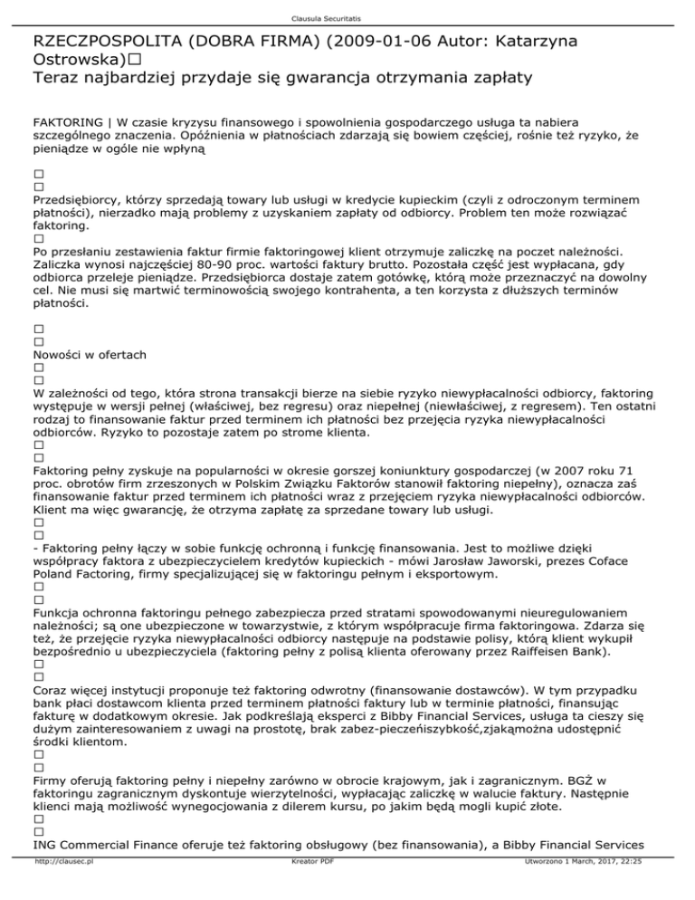 Clausula Securitatis RZECZPOSPOLITA (DOBRA FIRMA) (2009-01-06 Autor: Katarzyna Ostrowska) Teraz najbardziej przydaje się gwarancja otrzymania zapłaty FAKTORING | W czasie kryzysu finansowego i spowolnienia gospodarczego usługa ta nabiera szczególnego znaczenia. Opóźnienia w płatnościach zdarzają się bowiem częściej, rośnie też ryzyko, że pieniądze w ogóle nie wpłyną Przedsiębiorcy, którzy sprzedają towary lub usługi w kredycie kupieckim (czyli z odroczonym terminem płatności), nierzadko mają problemy z uzyskaniem zapłaty od odbiorcy. Problem ten może rozwiązać faktoring. Po przesłaniu zestawienia faktur firmie faktoringowej klient otrzymuje zaliczkę na poczet należności. Zaliczka wynosi najczęściej 80-90 proc. wartości faktury brutto. Pozostała część jest wypłacana, gdy odbiorca przeleje pieniądze. Przedsiębiorca dostaje zatem gotówkę, którą może przeznaczyć na dowolny cel. Nie musi się martwić terminowością swojego kontrahenta, a ten korzysta z dłuższych terminów płatności. Nowości w ofertach W zależności od tego, która strona transakcji bierze na siebie ryzyko niewypłacalności odbiorcy, faktoring występuje w wersji pełnej (właściwej, bez regresu) oraz niepełnej (niewłaściwej, z regresem). Ten ostatni rodzaj to finansowanie faktur przed terminem ich płatności bez przejęcia ryzyka niewypłacalności odbiorców. Ryzyko to pozostaje zatem po strome klienta. Faktoring pełny zyskuje na popularności w okresie gorszej koniunktury gospodarczej (w 2007 roku 71 proc. obrotów firm zrzeszonych w Polskim Związku Faktorów stanowił faktoring niepełny), oznacza zaś finansowanie faktur przed terminem ich płatności wraz z przejęciem ryzyka niewypłacalności odbiorców. Klient ma więc gwarancję, że otrzyma zapłatę za sprzedane towary lub usługi. - Faktoring pełny łączy w sobie funkcję ochronną i funkcję finansowania. Jest to możliwe dzięki współpracy faktora z ubezpieczycielem kredytów kupieckich - mówi Jarosław Jaworski, prezes Coface Poland Factoring, firmy specjalizującej się w faktoringu pełnym i eksportowym. Funkcja ochronna faktoringu pełnego zabezpiecza przed stratami spowodowanymi nieuregulowaniem należności; są one ubezpieczone w towarzystwie, z którym współpracuje firma faktoringowa. Zdarza się też, że przejęcie ryzyka niewypłacalności odbiorcy następuje na podstawie polisy, którą klient wykupił bezpośrednio u ubezpieczyciela (faktoring pełny z polisą klienta oferowany przez Raiffeisen Bank). Coraz więcej instytucji proponuje też faktoring odwrotny (finansowanie dostawców). W tym przypadku bank płaci dostawcom klienta przed terminem płatności faktury lub w terminie płatności, finansując fakturę w dodatkowym okresie. Jak podkreślają eksperci z Bibby Financial Services, usługa ta cieszy się dużym zainteresowaniem z uwagi na prostotę, brak zabez-pieczeńiszybkość,zjakąmożna udostępnić środki klientom. Firmy oferują faktoring pełny i niepełny zarówno w obrocie krajowym, jak i zagranicznym. BGŻ w faktoringu zagranicznym dyskontuje wierzytelności, wypłacając zaliczkę w walucie faktury. Następnie klienci mają możliwość wynegocjowania z dilerem kursu, po jakim będą mogli kupić złote. ING Commercial Finance oferuje też faktoring obsługowy (bez finansowania), a Bibby Financial Services http://clausec.pl Kreator PDF Utworzono 1 March, 2017, 22:25 Clausula Securitatis uruchomił usługi przeznaczone specjalnie dla branż transportowej oraz tworzyw sztucznych. Nie tylko finansowanie W ramach faktoringu klient oprócz finansowania, otrzymuje również dodatkowe usługi. Ich zakres zależy od instytucji finansowej. Najczęściej spotykane to weryfikacja kontrahentów (we współpracy z wywiadowniamigospodarczymi), monitorowanie dłużników po upływie terminu platnosci, windykacja miękka z postępowaniem sądowym i komorniczym włącznie, inkaso należności od dłużników, przejęcie ryzyka niewypłacalności kontrahentów. Arvato Services Polska podejmuje się też m.in. księgowania faktur, księgowania płatności, prowadzenia kont rozliczeniowych odbiorców. BZ WBK Faktor podkreśla, że dyscyplinę płatniczą bardzo poprawia bieżące monitorowanie odbiorców zgłoszonych przez klienta do faktoringu. Obejmuje ono telefoniczne ponaglenia, wysyłanie upomnień, monitów, naliczanie odsetek za zwłokę. Coraz częściej firmy faktoringowe i banki oferują klientom dostęp online do aktualnej informacji o portfelu wierzytelności (kompleksowe raportowanie). Bibby Financial Services w ramach standardowego finansowania dosyć często stosu -je tzw. nadpłaty, czyli krótkoterminowe wypłaty środków ponad określoną w umowie procentową wielkość zaliczki. Takie dodatkowe zastrzyki pieniędzy oferowane są sprawdzonym klientom. Stanowią wsparcie w sytuacjach gwałtownego wzrostu potrzeb finansowych, np. w okresie płatności podatków lub gdy pojawia się okazja, by taniej kupić towary czy surowce. Dobrzy klienci mający przejściowe kłopoty mogą też liczyć na pomoc w uregulowaniu zaliczek na rzecz urzędu skarbowego lub ZUS. Bank czy firma faktoringowa Przedsiębiorca ma do wyboru usługi faktoringowe świadczone przez wyspecjalizowaną firmę lub bank. Firmy faktoringowe zwykle podkreślają, że w bankach faktoring jest tylko jednym z wielu produktów, natomiast u nich jest podstawową specjalnością, co gwarantuje wysoką jakość obsług. - Faktoring w firmie faktoringowej jest bardziej elastyczny. Faktorzy stosują inne kryteria oceny transakcji niż banki. Są w stanie zaakceptować większe ryzyko - mówi Grzegorz Gebler, członek zarządu Fortis Commercial Finance. Jak podkreśla Jarosław Jaworski z Coface Poland Factoring, banki na ogół stosują procedury analizy ryzyka zbliżone do kredytowych. - Firmy faktoringowe z kolei kładą większy nacisk na inne elementy oceny zdolności kredytowej, takie jak ocena potenc