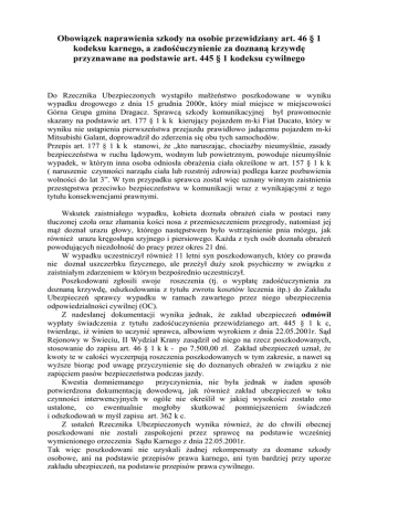 Obowiązek naprawienia szkody na osobie przewidziany art. 46 § 1 kodeksu karnego, a zadośćuczynienie za doznaną krzywdę przyznawane na podstawie art. 445 § 1 kodeksu cywilnego Do Rzecznika Ubezpieczonych wystąpiło małżeństwo poszkodowane w wyniku wypadku drogowego z dnia 15 grudnia 2000r, który miał miejsce w miejscowości Górna Grupa gmina Dragacz. Sprawcą szkody komunikacyjnej był prawomocnie skazany na podstawie art. 177 § 1 k k kierujący pojazdem m-ki Fiat Ducato, który w wyniku nie ustąpienia pierwszeństwa przejazdu prawidłowo jadącemu pojazdem m-ki Mitsubishi Galant, doprowadził do zderzenia się obu tych samochodów. Przepis art. 177 § 1 k k stanowi, że „kto naruszając, chociażby nieumyślnie, zasady bezpieczeństwa w ruchu lądowym, wodnym lub powietrznym, powoduje nieumyślnie wypadek, w którym inna osoba odniosła obrażenia ciała określone w art. 157 § 1 k k ( naruszenie czynności narządu ciała lub rozstrój zdrowia) podlega karze pozbawienia wolności do lat 3”. W tym przypadku sprawca został więc uznany winnym zaistnienia przestępstwa przeciwko bezpieczeństwu w komunikacji wraz z wynikającymi z tego tytułu konsekwencjami prawnymi. Wskutek zaistniałego wypadku, kobieta doznała obrażeń ciała w postaci rany tłuczonej czoła oraz złamania kości nosa z przemieszczeniem przegrody, natomiast jej mąż doznał urazu głowy, którego następstwem było wstrząśnienie pnia mózgu, jak również urazu kręgosłupa szyjnego i piersiowego. Każda z tych osób doznała obrażeń powodujących niezdolność do pracy przez okres 21 dni. W wypadku uczestniczył również 11 letni syn poszkodowanych, który co prawda nie doznał uszczerbku fizycznego, ale przeżył duży szok psychiczny w związku z zaistniałym zdarzeniem w którym bezpośrednio uczestniczył. Poszkodowani zgłosili swoje roszczenia (tj. o wypłatę zadośćuczynienia za doznaną krzywdę, odszkodowania z tytułu zwrotu kosztów leczenia itp.) do Zakładu Ubezpieczeń sprawcy wypadku w ramach zawartego przez niego ubezpieczenia odpowiedzialności cywilnej (OC). Z nadesłanej dokumentacji wynika jednak, że zakład ubezpieczeń odmówił wypłaty świadczenia z tytułu zadośćuczynienia przewidzianego art. 445 § 1 k c, twierdząc, iż winien to uczynić sprawca, albowiem wyrokiem z dnia 22.05.2001r. Sąd Rejonowy w Świeciu, II Wydział Krany zasądził od niego na rzecz poszkodowanych, stosowanie do zapisu art. 46 § 1 k k - po 7.500,00 zł. Zakład ubezpieczeń uznał, że kwoty te w całości wyczerpują roszczenia poszkodowanych w tym zakresie, a nawet są wyższe biorąc pod uwagę przyczynienie się do doznanych obrażeń w związku z nie zapięciem pasów bezpieczeństwa podczas jazdy. Kwestia domniemanego przyczynienia, nie była jednak w żaden sposób potwierdzona dokumentacją dowodową, jak również zakład ubezpieczeń w toku czynności interwencyjnych w ogóle nie określił w jakiej wysokości zostało ono ustalone, co ewentualnie mogłoby skutkować pomniejszeniem świadczeń i odszkodowań w myśl zapisu art. 362 k c. Z ustaleń Rzecznika Ubezpieczonych wynika również, że do chwili obecnej poszkodowani nie zostali zaspokojeni przez sprawcę na podstawie wcześniej wymienionego orzeczenia Sądu Karnego z dnia 22.05.2001r. Tak więc poszkodowani nie uzyskali żadnej rekompensaty za doznane szkody osobowe, ani na podstawie przepisów prawa karnego, ani tym bardziej przy uporze zakładu ubezpieczeń, na podstawie przepisów prawa cywilnego. - 2- Na marginesie informuję, że jedynie Syn poszkodowanych, po interwencji Rzecznika Ubezpieczonych został skierowany na badania, a po sporządzeniu opinii przez lekarza psychiatrę zakład ubezpieczeń wypłacił zadośćuczynienie w kwocie 1.000,00zł. Rozpoczynając od omówienia przepisów prawa karnego w tej kwestii, ustawodawca przewidział w art. 46 § 1 k k, że „w razie skazania za przestępstwo spowodowania śmierci, ciężkiego uszczerbku na zdrowiu, naruszenia czynności narządu ciała lub rozstroju zdrowia, przestępstwo przeciwko bezpieczeństwu w komunikacji lub przestępstwo przeciwko środowisku, mieniu lub obrotowi gospodarczemu, sąd na wniosek pokrzywdzonego lub innej osoby uprawnionej, orzeka obowiązek naprawienia szkody w całości albo w części, przepisów prawa cywilnego o przedawnieniu roszczenia oraz możliwości zasądzenia renty nie stosuje się”. Sąd Karny ma więc możliwość orzeczenia tego rodzaju środka karnego, który jednak nie uniemożliwia Poszkodowanym dochodzenia dalszych roszczeń z tytułu zadośćuczynienia za doznaną krzywdę w ramach obowiązkowego ubezpieczenia OC sprawcy szkody. Umożliwia to również wprost art. 415 § 4 kodeksu postępowania karnego, który stanowi, że „jeżeli zasądzone odszkodowanie nie pokrywa całej szkody lub nie stanowi pełnego zadośćuczynienia za doznaną krzywdę, pokrzywdzony może dochodzić dodatkowych roszczeń w postępowaniu cywilnym”. Trafny wydaje się więc pogląd, że jeżeli Sąd Karny orzekł należności z tytułu doznanej szkody, okoliczność tę należy uwzględniać przy ustalaniu wysokości zadośćuczynienia. Sąd Najwyższy w uchwale z dnia 20 czerwca 2000r., I KZP 5/00, OSNKW 2000/78/55 stanął natomiast na stanowisku, że korzystanie przez sprawcę przestępstwa przeciwko bezpieczeństwu w komunikacji z ubezpieczenia odpowiedzialności cywilnej (OC) posiadaczy pojazdów mechanicznych za szkody powstałe w związku z ruchem tych pojazdów nie wyłącza, ani nakazu orzeczenia naprawienia szkody (art. 46 § 1 k k), ani możliwości orzeczenia zamiast tego obowiązku – nawiązki określonej w art. 46 § 2 k k. W uzasadnieniu tej uchwały czytamy, z czym należy się zgodzić, że orzekanie środków karnych przewidzianych art.46 k k na wniosek pokrzywdzonego jest częścią konsekwencji popełnienia przestępstwa i poniesienia odpowiedzialności karnej. Ubezpieczenie odpowiedzialności cywilnej nie 