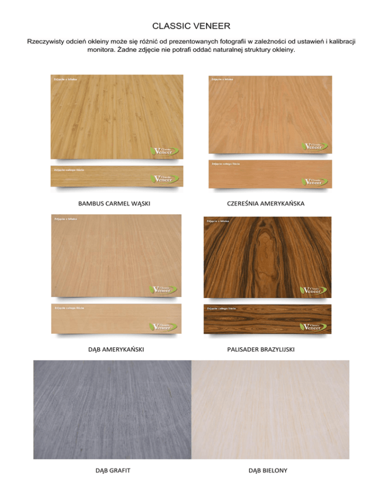 CLASSIC VENEER Rzeczywisty odcień okleiny może się różnić od prezentowanych fotografii w zależności od ustawień i kalibracji monitora. Żadne zdjęcie nie potrafi oddać naturalnej struktury okleiny. BAMBUS CARMEL WĄSKI DĄB AMERYKAŃSKI DĄB GRAFIT CZEREŚNIA AMERYKAŃSKA PALISADER BRAZYLIJSKI DĄB BIELONY DĄB CARDINAL DĄB CLASSIC PROSTOSŁOISTY DĄB CZARNO BIAŁY DĄB CZARNO SREBRNY DĄB FLADER DĄB PASTELOWY DĄB SILVER FLADER DĄB SILVER DRZEWO SANDAŁOWE HEBAN AMARONE HEBAN BOLIWIJSKI HEBAN CEJLON HEBAN CORVINA HEBAN MAKASSAR BIAŁY HEBAN JASNY HEBAN MAKASSAR LUX HEBAN MAKASSAR HEBAN PASIAK WĄSKI OLIWKA ARGENTO OLIWKA CORDOBA HEBAN PASIAK SZEROKI HEBAN PIANO OLIWKA BOLIWIA OLIWKA MALAGA OLIWKA PRIMA ORZECH BALTIMORE ORZECH CANALETTO PASIAK ORZECH WŁOSKI OLIWKA SEWILLA ORZECH CANALETTO FLADER ORZECH CARAVAGGIO ORZECH MILANO PALISANDER KOLUMBIJSKI PALISANDER SANTOS SOSNA TEAK MORINO PALISANDER RIO PLECIONKA NITKA TEAK GOLD TEAK WENGE AMARETTO WENGE AMORA WENGE DROBNOSŁOISTA WIĄZ LACOSTA WENGE CLASSIC WENGE CLEONI WENGE LUISIANA ZEBRANO BIANCO ZEBRANO CAPPUCCINO ZEBRANO CZARNE ZEBRANO JASNE