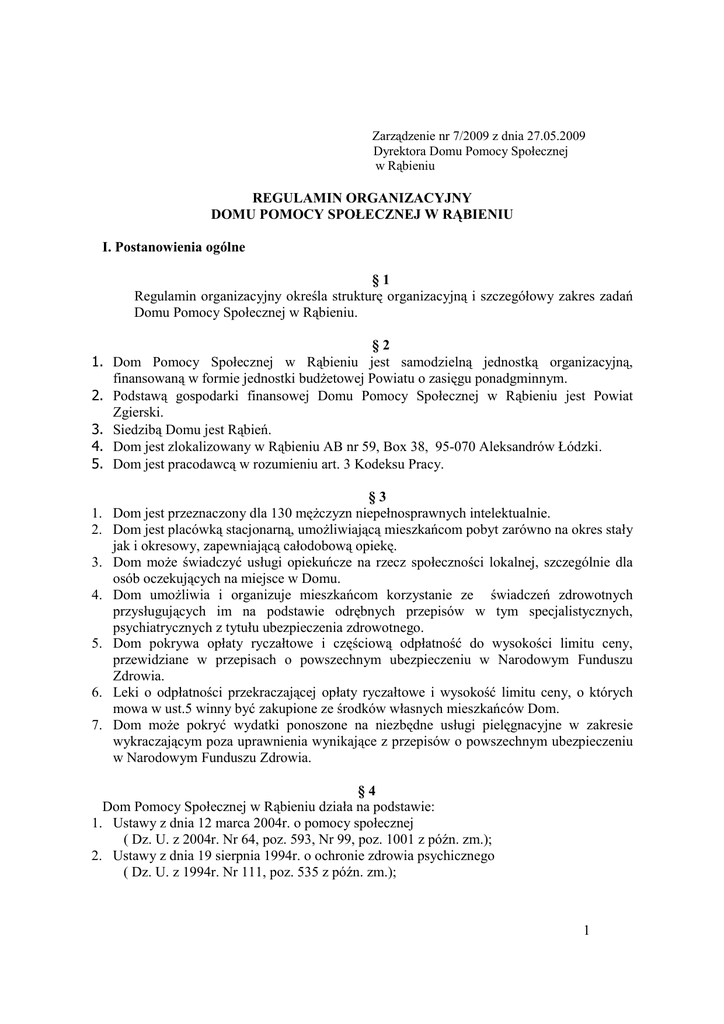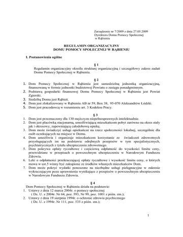 Zarządzenie nr 7/2009 z dnia 27.05.2009 Dyrektora Domu Pomocy Społecznej w Rąbieniu REGULAMIN ORGANIZACYJNY DOMU POMOCY SPOŁECZNEJ W RĄBIENIU I. Postanowienia ogólne §1 Regulamin organizacyjny określa strukturę organizacyjną i szczegółowy zakres zadań Domu Pomocy Społecznej w Rąbieniu. 1. 2. 3. 4. 5. §2 Dom Pomocy Społecznej w Rąbieniu jest samodzielną jednostką organizacyjną, finansowaną w formie jednostki budżetowej Powiatu o zasięgu ponadgminnym. Podstawą gospodarki finansowej Domu Pomocy Społecznej w Rąbieniu jest Powiat Zgierski. Siedzibą Domu jest Rąbień. Dom jest zlokalizowany w Rąbieniu AB nr 59, Box 38, 95-070 Aleksandrów Łódzki. Dom jest pracodawcą w rozumieniu art. 3 Kodeksu Pracy. §3 1. Dom jest przeznaczony dla 130 mężczyzn niepełnosprawnych intelektualnie. 2. Dom jest placówką stacjonarną, umożliwiającą mieszkańcom pobyt zarówno na okres stały jak i okresowy, zapewniającą całodobową opiekę. 3. Dom może świadczyć usługi opiekuńcze na rzecz społeczności lokalnej, szczególnie dla osób oczekujących na miejsce w Domu. 4. Dom umożliwia i organizuje mieszkańcom korzystanie ze świadczeń zdrowotnych przysługujących im na podstawie odrębnych przepisów w tym specjalistycznych, psychiatrycznych z tytułu ubezpieczenia zdrowotnego. 5. Dom pokrywa opłaty ryczałtowe i częściową odpłatność do wysokości limitu ceny, przewidziane w przepisach o powszechnym ubezpieczeniu w Narodowym Funduszu Zdrowia. 6. Leki o odpłatności przekraczającej opłaty ryczałtowe i wysokość limitu ceny, o których mowa w ust.5 winny być zakupione ze środków własnych mieszkańców Dom. 7. Dom może pokryć wydatki ponoszone na niezbędne usługi pielęgnacyjne w zakresie wykraczającym poza uprawnienia wynikające z przepisów o powszechnym ubezpieczeniu w Narodowym Funduszu Zdrowia. §4 Dom Pomocy Społecznej w Rąbieniu działa na podstawie: 1. Ustawy z dnia 12 marca 2004r. o pomocy społecznej ( Dz. U. z 2004r. Nr 64, poz. 593, Nr 99, poz. 1001 z późn. zm.); 2. Ustawy z dnia 19 sierpnia 1994r. o ochronie zdrowia psychicznego ( Dz. U. z 1994r. Nr 111, poz. 535 z późn. zm.); 1 3. Ustawy z dnia 06 lutego 1997r. o powszechnym ubezpieczeniu zdrowotnym ( Dz. U. z 1997r. Nr 28, poz. 153 z późn. zm.); 4. Ustawa z dnia 30 czerwca 2005r. o finansach publicznych ( Dz. U. z 2005r. Nr 249, poz. 2104 z późn. zm); 5. Ustawa z dnia 21 listopada 2008r. o pracownikach samorządowych (art. 37 ust 1 Dz. U. Nr 223 poz. 1458 ) 6. Rozporządzenia Ministra Polityki Społecznej z dnia 19 października 2005r. w sprawie domów pomocy społecznej ( Dz. U. z 2005r. Nr 217, poz. 1837); 7. Rozporządzenia Ministra Polityki Społecznej z dnia 21 października 200r. zmieniającego rozporządzenie w sprawie szczegółowego sposobu działania w sprawach przyjęcia do domu pomocy społecznej oraz wypisywania z domu pomocy społecznej osoby chorej psychicznie i upośledzonej umysłowo ( Dz. U. z 1995r. Nr 92, poz. 460; Dz. U. z 1999r. Nr 56, poz. 594; Dz. U. z 2005r. Nr 219, poz. 1871); 8. Rozporządzenia Rady Ministrów z dnia 18 marca 2009r. w sprawie zasad wynagradzania pracowników samorządowych zatrudnionych w jednostkach organizacyjnych jednostek samorządu terytorialnego 9. Statutu Domu Pomocy Społecznej w Rąbieniu zatwierdzonego uchwałą Nr XLVIII/465/06 Rady Powiatu Zgierskiego z dnia 30 czerwca 2006r. 10. Niniejszego Regulaminu. §5 Ilekroć w dalszej części niniejszego Regulaminu jest mowa o: 1. Regulaminie – należy przez to rozumieć regulamin Organizacyjny Domu Pomocy Społecznej w Rąbieniu, 2. Domu – należy przez to rozumieć Dom Pomocy Społecznej w Rąbieniu, 3. Dyrektorze – należy przez to rozumieć Dyrektora Domu Pomocy Społecznej w Rąbieniu, 4. Podmiocie prowadzącym – należy przez to rozumieć Powiat Zgierski, 5. Zarządzie Powiatu – należy przez to rozumieć Zarząd Powiatu Zgierskiego, 6. Staroście – należy przez to rozumieć Starostę Powiatu Zgierskiego, 7. PCPR – należy przez to rozumieć Powiatowe Centrum Pomocy Rodzinie, 8. Mieszkańcu – należy przez to rozumieć mieszkańca Domu Pomocy Społecznej w Rąbieniu, 9. Dziale – należy przez to rozumieć Dział w Domu Pomocy Społecznej w Rabieniu, 10. Kierowniku Działu – należy przez to rozumieć kierownika działu w Domu Pomocy Społecznej w Rąbieniu, 11. Kierownik Koordynator Działu Opiekuńczego – należy przez to rozumieć kierownika działu opiekuńczego w Domu Pomocy Społecznej w Rąbieniu, 12. Zespole – należy przez to rozumieć zespół terapeutyczny, zespół rehabilitacji, zespół pielęgniarek 13. Kierowniku Zespołu – należy przez to rozumieć kierownika zespołu terapeutycznego, kierownika zespołu rehabilitacji, kierownika zespołu opiekuńczego, kierownika zespołu pielęgniarek w Domu Pomocy Społecznej w Rąbieniu, 2 14. Standardzie usług – należy przez to rozumieć standard obowiązujących podstawowych usług świadczonych przez dom pomocy społecznej określony rozporządzeniem z dnia 19 października 2005r. w sprawie domów pomocy społecznej, 15. Pracowniku Domu – należy przez to rozumieć pracownika zatrudnionego w Domu Pomocy Społecznej w Rąbieniu. §6 Podmiotem prowadzącym placówkę jest Powiat Zgierski, a nadzór nad jakością działań oraz przestrzeganiem standardów opiekuńczych i wspomagających należy do zadań Wojewody. §7 1. Dom Pomocy Społecznej jest jednostką budżetową, która prowadzi gospodarkę finansową według zasad określonych w ustawie. 2. Podstawą gospodarki finansowej Domu jest plan wydatków i dochodów uchwalony przez Radę Powiatu Zgierskiego. §8 Misja Domu wyrażona jest w słowach: „ Kocham Cię i się Ciebie nie wstydzę”. II. Ogólne cele i zadania §9 1. Dom zaspokaja potrzeby bytowe, opiekuńcze, wspomagające i edukacyjne mieszkańców, w szczególności: 1) miejsce zamieszkania wraz z wyposażeniem w niezbędny sprzęt i meble; 2) wyżywienie z możl