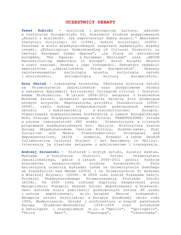 UCZESTNICY DEBATY Paweł Kubicki socjolog i antropolog kultury, adiunkt w Instytucie Europeistyki UJ, kierownik studiów podyplomowych „Miasto i miejskość. Jak współtworzyć dobre miasto.” Absolwent Instytutu Socjologii UJ (1999), doktor socjologii (2005). Pracował w wielu międzynarodowych zespołach badawczych, między innymi: „Ethnological Understanding of Cultural Diversity in Central European Urban Spaces”, „La Place un patrimoine européen, The Square: a European Heritage” oraz „RECON Reconstituting Democracy in Europe”. Autor książki Miasto w sieci znaczeń. Kraków i jego tożsamości. Sekretarz redakcji kwartalnika „Jagiellońskie Forum Europejskie”. Obszary zainteresowania: socjologia miasta, socjologia narodu i etniczności, antropologia kultury europejskiej. Anna Smolak - niezależna kuratorka. Ukończyła historię sztuki na Uniwersytecie Jagiellońskim oraz podyplomowe studia w zakresie dyplomacji kulturalnej Collegium Civitas / Instytut Adama Mickiewicza. W latach 2004-2012 związana z krakowskim Bunkrem Sztuki, wcześniej prowadziła Galerię Sito promującą młodych artystów. Współautorka projektu Transkultura (20062008), cyklu wystaw indywidualnych poświęconych kwestii obcości i wykorzenienia w wielokulturowej Europie. Organizowała międzynarodową konferencję w ramach Europejskiego Roku Dialogu Międzykulturowego w Polsce: TRANSKULTURA: Sztuka a płynna rzeczywistość XXI wieku. Uczestniczyła w licznych programach międzynarodowych min. Galicja. Historyczna kraina Europy (Międzynarodowe Centrum Kultury, Kraków-Lwów), Post Socialism and Media Transformations: Strategies and Representations, (AICA – Armenia, Erewań) a także GeoAIR Collaborative Cultural Project / Art Residency in Tbilisi. Interesują ją zjawiska związane z wykluczeniem i transgresją. Andrzej Szczerski – historyk i krytyk sztuki, kurator wystaw. Wykłada w Instytucie Historii Sztuki Uniwersytetu Jagiellońskiego, gdzie w latach 2005-2011 pełnił funkcję kierownika muzealniczych studiów kuratorskich. Poza macierzystą uczelnią wykładał także na Uniwersytecie Goethego we Frankfurcie nad Menem (2003) i na Uniwersytecie St Andrews w Wielkiej Brytanii (2004). W 2009 roku został Prezesem Sekcji Polskiej Międzynarodowego Stowarzyszenia Krytyków Sztuki (AICA). Od 2005 roku członek Kapituły Eksperckiej przy Małopolskiej Fundacji Muzeum Sztuki Współczesnej w Krakowie. Jest autorem wielu publikacji poświęconych sztuce XX wieku i sztuce współczesnej, m.in. książek Wzorce tożsamości. Recepcja sztuki brytyjskiej w Europie Środkowej około roku 1900, Modernizacje. Sztuka i architektura w nowych państwach Europy Środkowo-Wschodniej 1918-1939 oraz artykułów w katalogach i czasopismach m.in. w "Apollo", "Springerin", "Third Text", "Centropa", "Ikonotheka". Anna Wylegała - socjolożka, autorka pracy doktorskiej na temat pamięci społecznej w Galicji i na "Ziemiach Odzyskanych". Tłumaczka z języka ukraińskiego (ostatnie publikacje: Iwan Łysiak-Rudnycki, Między historią a polityką; Jarosław Hrycak, Prorok we własnym kraju. Iwan Franko i jego Ukraina (18561886)). Współpracuje z Ośrodkiem KARTA.