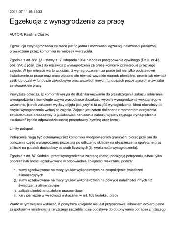 2014-07-11 15:11:33 Egzekucja z wynagrodzenia za pracę AUTOR: Karolina Ciastko Egzekucja z wynagrodzenia za pracę jest to jedna z możliwości egzekucji należności pieniężnej prowadzonej przez komornika na wniosek wierzyciela. Zgodnie z art. 881 §1 ustawy z 17 listopada 1964 r. Kodeks postępowania cywilnego (Dz.U. nr 43, poz. 296 z późn. zm.) do egzekucji z wynagrodzenia za pracę komornik przystępuje przez jego zajęcie. W tym miejscu warto wskazać, iż wynagrodzeniem za pracę jest nie tylko podstawowe świadczenie za pracę oraz prace zlecone ale również wszelkie nagrody pieniężne, premie jak również zysk lub udział w funduszu zakładowym oraz wszelkich innych funduszach pozostających w związku ze stosunkiem pracy. Powyższe oznacza, iż komornik wysyła do dłużnika wezwanie do przestrzegania zakazu pobierania wynagrodzenia i równolegle wzywa pracodawcę do zakazu wypłaty wynagrodzenia wskazanego w wezwaniu, jednak zakazem wypłaty objęta jest jedynie ta część wynagrodzenia, która nie należy do części wynagrodzenia wolnej od zajęcia. Zajęcie jest zatem dokonane z momentem doręczenia zawiadomienia pracodawcy, a jakiekolwiek naruszenie zakazu wypłaty zajętego wynagrodzenia skutkować będzie odpowiedzialnością pracodawcy (cywilną oraz karną). Limity potrąceń Potrącenia mogą być dokonane przez komornika w odpowiednich granicach, biorąc przy tym do obliczenia część wynagrodzenia pozostałą po odliczeniu składek na ubezpieczenia społeczne oraz zaliczki na podatek dochodowy od osób fizycznych (tj. kwota netto wynagrodzenia). Zgodnie z art. 87 Kodeksu pracy wynagrodzenia za pracę (netto) podlegają potrąceniu jednak tylko poprzez należności egzekwowane w odpowiedniej kolejności wskazanej poniżej: 1. sumy egzekwowane na mocy tytułów wykonawczych na zaspokojenie świadczeń alimentacyjnych 2. sumy egzekwowane na mocy tytułów wykonawczych na pokrycie należności innych niż świadczenia alimentacyjne 3. zaliczki pieniężne udzielone pracownikowi 4. kary pieniężne w wysokości wskazanej w art. 108 kodeksu pracy Warto w tym miejscu wskazać, iż powyższa kolejność nie jest przypadkowa, albowiem dopiero pełne zaspokojenie należności z „wyższego szczebla” daje podstawę do dokonywania potrąceń z niższego poziomu. Wyjątkiem są jedynie kary porządkowe, które podlegają potrąceniu niezależnie od pozostałych potrąceń do wysokości 10% wynagrodzenia przypadającego pracownikowi do wypłaty po dokonaniu pozostałych potrąceń. Wobec powyższego w razie potrącenia należności z tytułu świadczeń alimentacyjnych, objętych egzekucją, potrącenie może nastąpić do wysokości 3/5 wynagrodzenia, a w razie potrącenia innych należności, objętych egzekucją lub potrącania zaliczek pieniężnych, potrącenie może nastąpić do wysokości ½ wynagrodzenia. Pierwszeństwo egzekucji W przypadku świadczeń alimentacyjnych, objętych egzekucją wskazać należy, iż potrącane są one w pierwszej kolejności i aż do wyczerpania limitu 3/5 części wynagrodzenia, przy czym nie obowiązuje tutaj ograniczenie w stosunku do minimalnego wynagrodzenia za pracę, a nadto zgodnie z art. 87 §5 Kodeksu pracy nagroda z zakładowego funduszu nagród, dodatkowe wynagrodzenie roczne oraz należności przysługujące pracownikom z tytułu udziału w zysku lub w nadwyżce bilansowej podlegają egzekucji na zaspokojenie świadczeń alimentacyjnych do pełnej wysokości. Co do pozostałych świadczeń wskazanych powyżej kwotą wolną od potrąceń jest kwota minimalnego wynagrodzenia za pracę, ustalanego na podstawie odrębnych przepisów, przysługującego pracownikom zatrudnionym w pełnym wymiarze czasu pracy, po odliczeniu składek na ubezpieczenia społeczne oraz zaliczki na podatek dochodowy od osób fizycznych ( w 2013r. jest to kwota 1600 zł. brutto). Alimenty bez postępowania egzekucyjnego W przypadku świadczeń alimentacyjnych pracodawca może dokonać ich zaspokojenia bez postępowania egzekucyjnego, z wyjątkiem dwóch przypadków: 1) świadczeń alimentacyjnych, które mają być potrącane na rzecz kilku wierzycieli, a łączna suma, która może być potrącona, nie wystarcza na pełne pokrycie wszystkich należności alimentacyjnych, oraz 2) wynagrodzenia za pracę, które zostało zajęte w trybie egzekucji sądowej lub administracyjnej. W przypadku braku postępowania egzekucyjnego pracodawca dokonuje zajęcia na wniosek wierzyciela na podstawie przedłożonego przez niego tytułu wykonawczego. Na koniec warto wskazać, iż jeśli dłużnik zmieni pracodawcę, to zajęcie wynagrodzenia obowiązuje nadal, nawet gdyby po jego dokonaniu pracodawca podpisał z dłużnikiem nową umowę o pracę lub umowę zlecenia. Komornik nie musi wtedy wysyłać nowego zajęcia. W przypadku rozwiązania umowy o pracę z pracownikiem, który jest dłużnikiem, pracodawca powinien uczynić wzmiankę o zajęciu wynagrodzenia w wydanym świadectwie pracy, a jeżeli nowy pracodawca dłużnika jest mu znany, przesłać mu zawiadomienie komornika i dokumenty dotyczące zajęcia wynagrodzenia. AUTOR: Karolina Ciastko Komentarze
