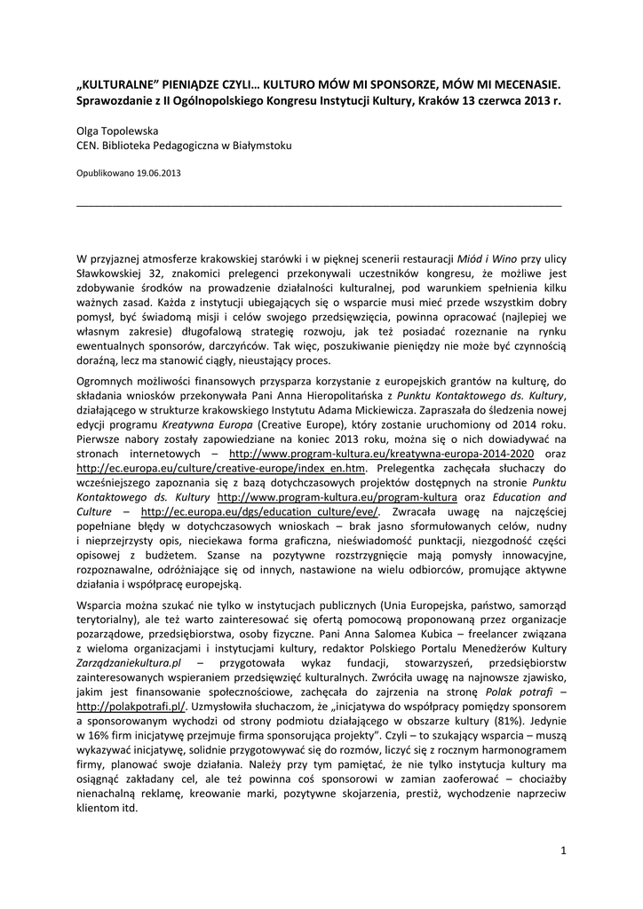 „KULTURALNE” PIENIĄDZE CZYLI… KULTURO MÓW MI SPONSORZE, MÓW MI MECENASIE. Sprawozdanie z II Ogólnopolskiego Kongresu Instytucji Kultury, Kraków 13 czerwca 2013 r. Olga Topolewska CEN. Biblioteka Pedagogiczna w Białymstoku Opublikowano 19.06.2013 __________________________________________________________________________________ W przyjaznej atmosferze krakowskiej starówki i w pięknej scenerii restauracji Miód i Wino przy ulicy Sławkowskiej 32, znakomici prelegenci przekonywali uczestników kongresu, że możliwe jest zdobywanie środków na prowadzenie działalności kulturalnej, pod warunkiem spełnienia kilku ważnych zasad. Każda z instytucji ubiegających się o wsparcie musi mieć przede wszystkim dobry pomysł, być świadomą misji i celów swojego przedsięwzięcia, powinna opracować (najlepiej we własnym zakresie) długofalową strategię rozwoju, jak też posiadać rozeznanie na rynku ewentualnych sponsorów, darczyńców. Tak więc, poszukiwanie pieniędzy nie może być czynnością doraźną, lecz ma stanowić ciągły, nieustający proces. Ogromnych możliwości finansowych przysparza korzystanie z europejskich grantów na kulturę, do składania wniosków przekonywała Pani Anna Hieropolitańska z Punktu Kontaktowego ds. Kultury, działającego w strukturze krakowskiego Instytutu Adama Mickiewicza. Zapraszała do śledzenia nowej edycji programu Kreatywna Europa (Creative Europe), który zostanie uruchomiony od 2014 roku. Pierwsze nabory zostały zapowiedziane na koniec 2013 roku, można się o nich dowiadywać na stronach internetowych – http://www.program-kultura.eu/kreatywna-europa-2014-2020 oraz http://ec.europa.eu/culture/creative-europe/index_en.htm. Prelegentka zachęcała słuchaczy do wcześniejszego zapoznania się z bazą dotychczasowych projektów dostępnych na stronie Punktu Kontaktowego ds. Kultury http://www.program-kultura.eu/program-kultura oraz Education and Culture – http://ec.europa.eu/dgs/education_culture/eve/. Zwracała uwagę na najczęściej popełniane błędy w dotychczasowych wnioskach – brak jasno sformułowanych celów, nudny i nieprzejrzysty opis, nieciekawa forma graficzna, nieświadomość punktacji, niezgodność części opisowej z budżetem. Szanse na pozytywne rozstrzygnięcie mają pomysły innowacyjne, rozpoznawalne, odróżniające się od innych, nastawione na wielu odbiorców, promujące aktywne działania i współpracę europejską. Wsparcia można szukać nie tylko w instytucjach publicznych (Unia Europejska, państwo, samorząd terytorialny), ale też warto zainteresować się ofertą pomocową proponowaną przez organizacje pozarządowe, przedsiębiorstwa, osoby fizyczne. Pani Anna Salomea Kubica – freelancer związana z wieloma organizacjami i instytucjami kultury, redaktor Polskiego Portalu Menedżerów Kultury Zarządzaniekultura.pl – przygotowała wykaz fundacji, stowarzyszeń, przedsiębiorstw zainteresowanych wspieraniem przedsięwzięć kulturalnych. Zwróciła uwagę na najnowsze zjawisko, jakim jest finansowanie społecznościowe, zachęcała do zajrzenia na stronę Polak potrafi – http://polakpotrafi.pl/. Uzmysłowiła słuchaczom, że „inicjatywa do współpracy pomiędzy sponsorem a sponsorowanym wychodzi od strony podmiotu działającego w obszarze kultury (81%). Jedynie w 16% firm inicjatywę przejmuje firma sponsorująca projekty”. Czyli – to szukający wsparcia – muszą wykazywać inicjatywę, solidnie przygotowywać się do rozmów, liczyć się z rocznym harmonogramem firmy, planować swoje działania. Należy przy tym pamiętać, że nie tylko instytucja kultury ma osiągnąć zakładany cel, ale też powinna coś sponsorowi w zamian zaoferować – chociażby nienachalną reklamę, kreowanie marki, pozytywne skojarzenia, prestiż, wychodzenie naprzeciw klientom itd. 1 Z powyższymi założeniami w końcowej części kongresu utożsamiała się Pani Magdalena Ujma – marketing manager z 15-letnią praktyką w firmach międzynarodowych (Johnson&Johnson, L’Oréal) i polskich (Polpharma, USP Zdrowie), wolontariusz zajmujący się fundraisingiem – i uzasadniała obustronne korzyści wynikające ze współpracy firm i instytucji kultury. Zwracała uwagę na przygotowanie właściwej argumentacji, zastanowienie się, jaka firma może oferować pomoc (zbieżność wartości i celów), co warto wiedzieć o praktykowanych w danej firmie sposobach sponsoringu (działania długofalowe – CSR, programy edukacyjne, wolontariat pracowniczy i działania jednorazowe – wystawy, koncerty, wsparcie lokalnych inicjatyw). Przydatną informacją bywa wiedza, kto w danej firmie/jakie działy mogą mieć budżet na sponsoring. Wcześniej, Pani Monika Wiejaczka – menadżer kultury, inicjatorka i organizatorka wielu projektów kulturalnych i edukacyjnych, zarówno w skali mini, jak i makro – podjęła się próby uporządkowania terminologii związanej z pozyskiwaniem pomocy. Mówiła o źródłach finansowania kultury – samofinansowaniu, bezinteresownym mecenacie publicznym i prywatnym oraz działaniu interesownym, jakim jest sponsoring. Zwracała uwagę na pułapki, czyhające na nieprzygotowanych oferentów (m.in. podatek VAT), podkreślała wzajemne zobowiązania stron (sponsor finansuje przedsięwzięcie, sponsorowany promuje sponsora), a także przypominała o właściwym formułowaniu treści umowy sponsoringowej, która nie jest reglamentowana przez żadne powszechnie obowiązujące przepisy. Tak jak przedmówczynie podkreślała, że najważniejszy jest właściwy wybór podmiotów, do których będzie adresowana oferta sponsoringowa. Należy być cierpliwym w osiąganiu celu, skuteczność osiąga się niekiedy po setkach wysłanych aplikacji. Należy pamiętać o tym, że instytucje kultury mają działać na zasadach agencji reklamowej, muszą „sprzedawać ” swój produkt i zainteresować sponsora swoją wyjątkowością. Pani Monika Wiejaczka podając typologie spo