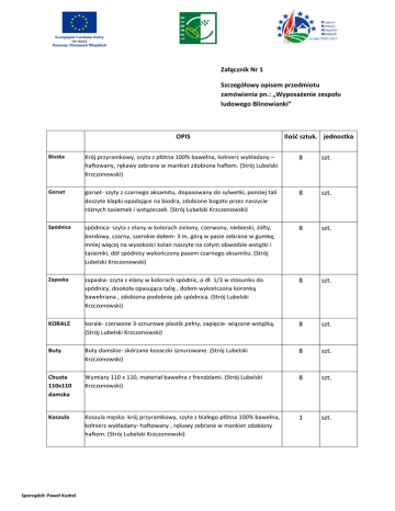 Załącznik Nr 1 Szczegółowy opisem przedmiotu zamówienia pn.: „Wyposażenie zespołu ludowego Blinowianki” OPIS Ilość sztuk. jednostka Bluzka Krój przyramkowy, szyta z płótna 100% bawełna, kołnierz wykładany – haftowany, rękawy zebrane w mankiet zdobione haftem. (Strój Lubelski Krzczonowski) 8 szt. Gorset gorset- szyty z czarnego aksamitu, dopasowany do sylwetki, poniżej tali doszyte klapki opadające na biodra, zdobione bogato przez naszycie różnych tasiemek i wstążeczek. (Strój Lubelski Krzczonowski) 8 szt. Spódnica spódnica- szyta z elany w kolorach zielony, czerwony, niebieski, żółty, bordowy, czarny, szerokie dołem- 3 m, górą w pasie zebrane w gumkę, mniej więcej na wysokości kolan naszyte na całym obwodzie wstążki i tasiemki, dół spódnicy wykończony pasem czarnego aksamitu. (Strój Lubelski Krzczonowski) 8 szt. Zapaska zapaska- szyta z elany w kolorach spódnic, o dł. 1/3 w stosunku do spódnicy, dookoła opasująca talię , dołem wykończona koronką bawełniana , zdobiona podobnie jak spódnica. (Strój Lubelski Krzczonowski) 8 szt. KORALE korale- czerwone 3-sznurowe plastik pełny, zapięcie- wiązane wstążką. (Strój Lubelski Krzczonowski) 8 szt. Buty Buty damskie- skórzane kozaczki sznurowane. (Strój Lubelski Krzczonowski) 8 szt. Chusta 110x110 damska Wymiary 110 x 110, materiał bawełna z frendzlami. (Strój Lubelski Krzczonowski) 8 szt. Koszula Koszula męska- krój przyramkowy, szyta z białego płótna 100% bawełna, kołnierz wykładany- haftowany , rękawy zebrane w mankiet zdobiony haftem. (Strój Lubelski Krzczonowski) 1 szt. Sporządził: Paweł Kudrel Spodnie męskie Spodnie- krój prosty, szyte z sukna wełnianego, na bokach wzdłuż zewnętrznych szwów przyszyty czerwony sznurek. (Strój Lubelski Krzczonowski) Marynarka Kaftan męski-szyty z sukna wełnianego ,krój prosty, wykładany kołnierz z haftem krzyżykowym. Przody kaftana, mankiety i linia tali – ozdobiona męska naszytymi wzorzystymi pasami- wykonane z wstążek na których są wszyte konturowe motywy, boczne brzegi tych pasów wycięte w zęby, pod które są powkładane kolorowe wstążki. (Strój Lubelski Krzczonowski) Pas Pas uszyty w te same motywy co zdobienie kaftana, opasujący talię a na środku pasa duża szlufka -o szer. pasa . (Strój Lubelski Krzczonowski) Buty męskie Buty- skórzane ,wysokie cholewki. (Strój Lubelski Krzczonowski) Sporządził: Paweł Kudrel 1 szt. 1 szt. 1 szt. 1 szt. Załącznik Nr 2 Formularz ofertowy do zamówienia pn.: „Wyposażenie zespołu ludowego Blinowianki” FORMULARZ OFERTOWY nazwa i adres wykonawcy : ...................................................................................................................................................................... ...................................................................................................................................................................... ...................................................................................................................................................................... Wójt Gminy Szastarka, Szastarka 121 , 23-225 Szastarka FORMULARZOFERTOWY Nawiązując do ogłoszenia - zapytanie ofertowe na „ Wyposażenie zespołu śpiewaczego Blinowianki” oferujemy wykonanie zamówienia w zakresie zgodnym z opisem przedmiotu zamówienia. Wykonanie w/w zadania oferujemy za cenę brutto (z podatkiem VAT) w wysokości:.....................zł brutto (słownie: ) 1. Powyższa cena ofertowa obejmuje wszelkie koszty i czynności określone w zapytaniu ofertowym. Zobowiązujemy się do wykonania zamówienia w terminie do 30 dni od dnia podpisania umowy. 2. Oświadczamy, że zapoznaliśmy się z opisem przedmiotu zamówienia znajdującym się w zapytaniu ofertowym i że nie wnosimy uwag oraz akceptujemy bez zastrzeżeń. 3. Oświadczamy, że zapoznaliśmy się z projektem umowy załączonym do zapytania ofertowego o zamówieniu oraz że akceptujemy go bez zastrzeżeń. 4. Na dostarczone przedmioty udzielimy gwarancji na okres 12 miesięcy od daty ostatecznego odbioru. 5. 6. Oświadczamy, że uważamy się za związanych niniejszą ofertą do dnia 17.09.2012 r. W przypadku udzielenia nam zamówienia zobowiązujemy się do zawarcia umowy w miejscu i terminie wskazanym przez Zamawiającego; 7. 8. Oferta wraz z załącznikami została złożona na stronach podpisanych i kolejno ponumerowanych od nr.......... do nr.......... Sporządził: Paweł Kudrel Potwierdzam spełnienie warunków dotyczących: • • • posiadania wiedzy i doświadczenia; dysponowania odpowiednim potencjałem technicznym oraz osobami zdolnymi do wykonania zamówienia; sytuacji ekonomicznej i finansowej; Adres, na który Zamawiający powinien przesyłać ewentualną korespondencję: Strona internetowa Wykonawcy : Osoba wyznaczona do kontaktów z Zamawiającym: Numer telefonu: Numer faksu: e-mail: ................................................................ Data i podpisy osób upoważnionych Sporządził: Paweł Kudrel FORMULARZ OFERTOWY (wykaz cen jednostkowych) Dotyczący zapytania ofertowego na „ Wyposażenie zespołu śpiewaczego Blinowianki” OPIS Ilość Cena sztuk. jednostkowa Netto Bluzka Krój przyramkowy, szyta z płótna 100% bawełna, kołnierz wykładany –haftowany, rękawy zebrane w mankiet zdobione haftem. (Strój Lubelski Krzczonowski) 8 Gorset gorset- szyty z czarnego aksamitu, dopasowany do sylwetki, poniżej tali doszyte klapki opadające na biodra, zdobione bogato przez naszycie różnych tasiemek i wstążeczek. (Strój Lubelski Krzczonowski) 8 Spódnica spódnica- szyta z elany w kolorach zielony, czerwony, niebieski, żółty, bordowy, czarny, szerokie dołem- 3 m, górą w pasie zebrane w gumkę, mniej więcej na wysokości kolan naszyte na całym obwodzie wstążki i tasiemki, dół spódnicy wykończony pasem czarnego aksamitu. (Strój Lubelski Krzczonowski) 8 Zapaska zapaska- szyta z elany w 