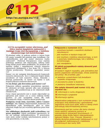 112 to europejski numer alarmowy, pod który można bezpłatnie zadzwonić z każdego kraju Unii Europejskiej, z telefonu stacjonarnego lub komórkowego. Wyobraźmy sobie, że podczas pobytu w innym kraju UE mamy wypadek lub jesteśmy jego świadkami. Czy wiedzielibyśmy, pod jaki numer alarmowy trzeba zadzwonić? Ponieważ Europejczycy coraz częściej podróżują służbowo lub rekreacyjnie, miliony ludzi mogą stanąć przed takim problemem. Na szczęście nie musimy szukać i zapamiętywać różnych numerów alarmowych działających w tym kraju UE, w którym właśnie przebywamy. Wystarczy zapamiętać numer 112! Numer 112 nie zastępuje dotychczasowych krajowych numerów alarmowych, lecz w większości krajów działa niezależnie od tych numerów. Dania, Holandia i Szwecja postanowiły, że numer 112 będzie w tych krajach jedynym numerem alarmowym. Co się dzieje, gdy dzwonimy pod numer 112? Połączenie odbiera specjalnie przeszkolony operator. W zależności od kraju operator albo sam przyjmuje zgłoszenie, albo przekierowuje je do właściwych służb ratunkowych. Coraz więcej operatorów jest w stanie odpowiadać na zgłoszenia pod numer 112 w coraz większej liczbie języków, co jest szczególnie ważne dla osób dzwoniących z kraju, w którym akurat przebywają. Podajemy swoje imię, nazwisko, adres i numer telefonu. Aby uniknąć nieporozumień, konieczna jest identyfikacja osób dzwoniących, gdyż to samo zdarzenie mogło być już wcześniej zgłoszone przez inne osoby. Nie odkładamy słuchawki, jeśli wybraliśmy 112 przez pomyłkę! Należy powiedzieć operatorowi, że nie ma żadnego niebezpieczeństwa. W przeciwnym razie może zostać wysłana natychmiastowa pomoc w celu sprawdzenia, co się stało. Połączenie z numerem 112: - umożliwia kontakt z wszelkimi służbami ratunkowymi - jest możliwe w każdym kraju UE - jest możliwe z telefonu stacjonarnego, w tym z automatu telefonicznego, lub z telefonu komórkowego. - jest nieodpłatne. W jakich przypadkach należy dzwonić pod numer 112? W każdym nagłym wypadku, gdy potrzebna jest pomoc pogotowia ratunkowego, straży pożarnej lub policji. Na przykład, gdy: Djesteśmy uczestnikami lub świadkami wypadku drogowego Dzauważymy pożar w budynku Djesteśmy świadkami włamania. Nie należy dzwonić pod numer 112, aby uzyskać np.: U informacje o ruchu drogowym Uinformacje o pogodzie Uinformacje ogólne. Niepotrzebne połączenia z tym numerem mogą przeciążyć linię telefoniczną i spowodować zagrożenie życia tych osób, które w danej chwili potrzebują natychmiastowej pomocy. Dzwonienie pod ten numer dla żartu również może opóźnić udzielenie pomocy w rzeczywistych sytuacjach kryzysowych. Z powodu dużej liczby takich nieprawdziwych zgłoszeń Belgia, Cypr, Francja, Słowenia i Wielka Brytania postanowiły zablokować nr 112 dla połączeń realizowanych z telefonów komórkowych bez karty SIM.