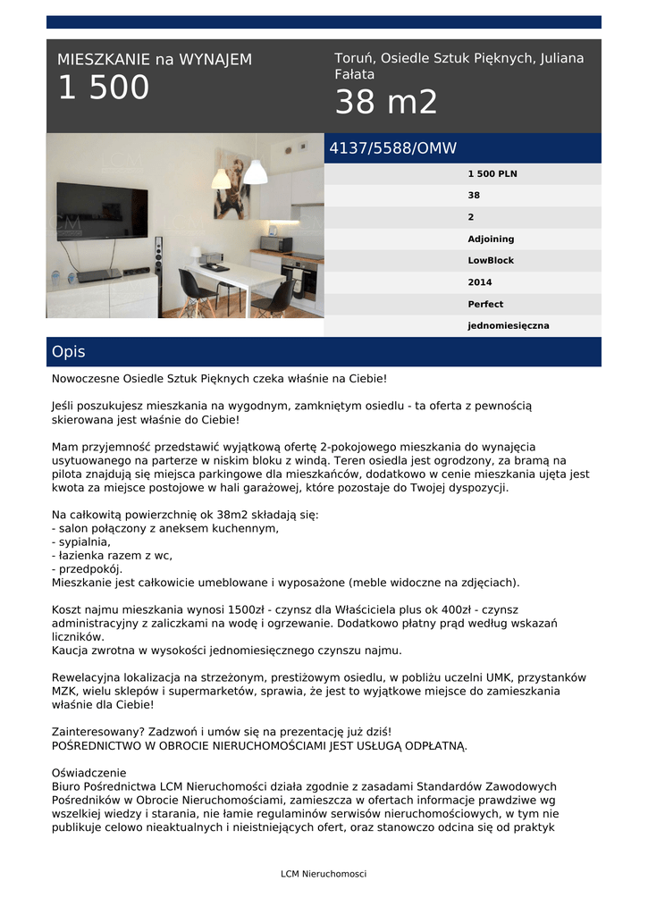 MIESZKANIE na WYNAJEM 1 500 Toruń, Osiedle Sztuk Pięknych, Juliana Fałata 38 m2 4137/5588/OMW 1 500 PLN 38 2 Adjoining LowBlock 2014 Perfect jednomiesięczna Opis Nowoczesne Osiedle Sztuk Pięknych czeka właśnie na Ciebie! Jeśli poszukujesz mieszkania na wygodnym, zamkniętym osiedlu - ta oferta z pewnością skierowana jest właśnie do Ciebie! Mam przyjemność przedstawić wyjątkową ofertę 2-pokojowego mieszkania do wynajęcia usytuowanego na parterze w niskim bloku z windą. Teren osiedla jest ogrodzony, za bramą na pilota znajdują się miejsca parkingowe dla mieszkańców, dodatkowo w cenie mieszkania ujęta jest kwota za miejsce postojowe w hali garażowej, które pozostaje do Twojej dyspozycji. Na całkowitą powierzchnię ok 38m2 składają się: - salon połączony z aneksem kuchennym, - sypialnia, - łazienka razem z wc, - przedpokój. Mieszkanie jest całkowicie umeblowane i wyposażone (meble widoczne na zdjęciach). Koszt najmu mieszkania wynosi 1500zł - czynsz dla Właściciela plus ok 400zł - czynsz administracyjny z zaliczkami na wodę i ogrzewanie. Dodatkowo płatny prąd według wskazań liczników. Kaucja zwrotna w wysokości jednomiesięcznego czynszu najmu. Rewelacyjna lokalizacja na strzeżonym, prestiżowym osiedlu, w pobliżu uczelni UMK, przystanków MZK, wielu sklepów i supermarketów, sprawia, że jest to wyjątkowe miejsce do zamieszkania właśnie dla Ciebie! Zainteresowany? Zadzwoń i umów się na prezentację już dziś! POŚREDNICTWO W OBROCIE NIERUCHOMOŚCIAMI JEST USŁUGĄ ODPŁATNĄ. Oświadczenie Biuro Pośrednictwa LCM Nieruchomości działa zgodnie z zasadami Standardów Zawodowych Pośredników w Obrocie Nieruchomościami, zamieszcza w ofertach informacje prawdziwe wg wszelkiej wiedzy i starania, nie łamie regulaminów serwisów nieruchomościowych, w tym nie publikuje celowo nieaktualnych i nieistniejących ofert, oraz stanowczo odcina się od praktyk LCM Nieruchomosci nieetycznych i wprowadzających inne firmy oraz potencjalnych klientów w błąd. ZAPEWNIAMY BEZPŁATNE I PROFESJONALNE DORADZTWO W ZAKRESIE POZYSKIWANIA KREDYTÓW HIPOTECZNYCH NA ZAKUP NIERUCHOMOŚCI Powyższe informacje zostały sporządzone na podstawie oświadczeń i nie są ofertą w rozumieniu przepisów Kodeksu Cywilnego. Mają one jedynie charakter informacyjny. Katarzyna Jarzembowska tel. 793941090 email: [email protected] LCM Nieruchomosci Powered by TCPDF (www.tcpdf.org)