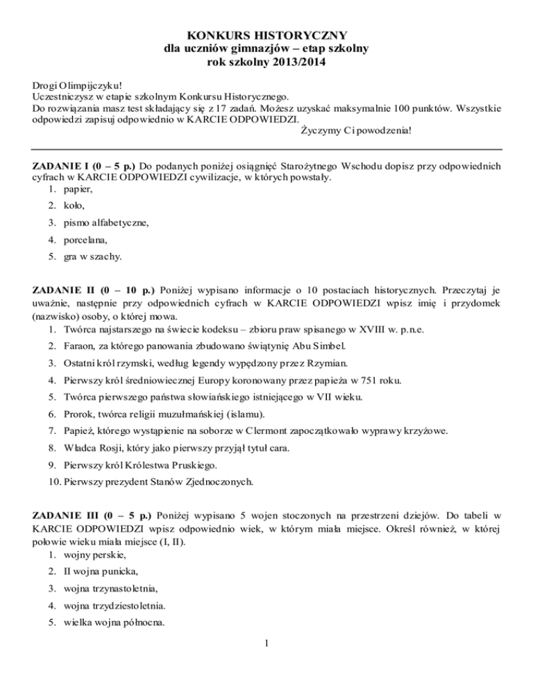 KONKURS HISTORYCZNY dla uczniów gimnazjów – etap szkolny rok szkolny 2013/2014 Drogi Olimpijczyku! Uczestniczysz w etapie szkolnym Konkursu Historycznego. Do rozwiązania masz test składający się z 17 zadań. Możesz uzyskać maksymalnie 100 punktów. Wszystkie odpowiedzi zapisuj odpowiednio w KARCIE ODPOWIEDZI. Życzymy Ci powodzenia! ZADANIE I (0 – 5 p.) Do podanych poniżej osiągnięć Starożytnego Wschodu dopisz przy odpowiednich cyfrach w KARCIE ODPOWIEDZI cywilizacje, w których powstały. 1. papier, 2. koło, 3. pismo alfabetyczne, 4. porcelana, 5. gra w szachy. ZADANIE II (0 – 10 p.) Poniżej wypisano informacje o 10 postaciach historycznych. Przeczytaj je uważnie, następnie przy odpowiednich cyfrach w KARCIE ODPOWIEDZI wpisz imię i przydomek (nazwisko) osoby, o której mowa. 1. Twórca najstarszego na świecie kodeksu – zbioru praw spisanego w XVIII w. p.n.e. 2. Faraon, za którego panowania zbudowano świątynię Abu Simbel. 3. Ostatni król rzymski, według legendy wypędzony przez Rzymian. 4. Pierwszy król średniowiecznej Europy koronowany przez papieża w 751 roku. 5. Twórca pierwszego państwa słowiańskiego istniejącego w VII wieku. 6. Prorok, twórca religii muzułmańskiej (islamu). 7. Papież, którego wystąpienie na soborze w Clermont zapoczątkowało wyprawy krzyżowe. 8. Władca Rosji, który jako pierwszy przyjął tytuł cara. 9. Pierwszy król Królestwa Pruskiego. 10. Pierwszy prezydent Stanów Zjednoczonych. ZADANIE III (0 – 5 p.) Poniżej wypisano 5 wojen stoczonych na przestrzeni dziejów. Do tabeli w KARCIE ODPOWIEDZI wpisz odpowiednio wiek, w którym miała miejsce. Określ również, w której połowie wieku miała miejsce (I, II). 1. wojny perskie, 2. II wojna punicka, 3. wojna trzynastoletnia, 4. wojna trzydziestoletnia. 5. wielka wojna północna. 1 ZADANIE IV (0 – 10 p.) Poniżej znajduje się 10 pytań, do których przygotowano po 4 odpowiedzi. Tylko jedna jest prawdziwa. Do tabeli w KARCIE ODPOWIEDZI wpisz odpowiednio literę oznaczającą prawidłową odpowiedź. 1. Monarchią despotyczną w czasach starożytnych było państwo: A. Egipt, B. Grecja, C. Rzym, D. Indie. 2. Pierwszą formą ustroju starożytnego Rzymu było: A. cesarstwo, B. republika, C. królestwo, D. demokracja. 3. Urzędnikiem republiki rzymskiej powoływanym w sytuacjach krytycznych dla państwa był: A. konsul, B. dyktator, C. pretor, D. edyl. 4. Monarchia Karola Wielkiego była monarchią: A. patrymonialną, B. parlamentarną, C. absolutną, D. konstytucyjną. 5. Parlament angielski ukształtował się w wieku: A. XII, B. XIV, C. XIII, D. XV. 6. Autorem powiedzenia „Państwo to ja” podkreślającego władzę absolutną był król Francji: A. Ludwik XIII, B. Ludwik XIV, C. Ludwik XV, D. Ludwik XVI. 7. Pierwszym państwem, w którym ukształtowała się monarchia parlamentarna w XVII wieku była: A. Francja, B. Anglia, C. Rosja, D. Polska. 8. Absolutyzm oświecony ukształtował się pod wpływem haseł epoki: A. Baroku, B. Renesansu, C. Średniowiecza, D. Oświecenia. 9. Zasadę trójdzielności władzy zastosowano po raz pierwszy w konstytucji: A. USA, B. Polski, C. Francji, D. Austrii. 10. W wyniku rewolucji francuskiej prawo do udziału w rządzeniu państwem uzyskali: A. duchowni, B. szlachta, C. burżuazja, D. chłopi. 2 ZADANIE V (0 – 5 p.) Do podanych poniżej nazwisk filozofów dopisz w KARCIE ODPOWIEDZI po jednym tytule dzieła wybranym z ramki. PLATON, CYCERON, TOMASZ MORUS, KAROL MONTESKIUSZ, JAN JAKUB ROSSEAU. * ”Książę” * „Utopia” * „O duchu praw” * „Uczta” * * „Umowa społeczna” * „O państwie” * ZADANIE VI (0 – 5 p.) Poniżej umieszczono pięć zdań dotyczących reformacji w Europie. Oceń, które z nich jest prawdziwe, a które fałszywe. Przy odpowiednich cyfrach w KARCIE ODPOWIEDZI wpisz słowo „prawda” lub „fałsz”. 1. Reformację w XVI wieku zapoczątkowało wywieszenie przez Marcina Lutra 95 tez na drzwiach kościoła w Wittenberdze. 2. Naukę o predestynacji głosił Jan Kalwin. 3. Akt supremacji wydany przez Henryka VIII uznawał papieża za głowę kościoła anglikańskiego. 4. Pokój w Augsburgu kończący wojny religijne w Niemczech wprowadził zasadę „czyj kraj, tego religia”. 5. Zakon jezuitów został założony w czasie obrad soboru trydenckiego. ZADANIE VII (0 – 5 p.) Poniżej wypisano cechy charakterystyczne różnych stylów architektonicznych. Połącz je z nazwami i w KARCIE ODPOWIEDZI dopisz w tabeli litery do cyfr. A. Budowle monumentalne, bogate zdobnictwo i ornamentyka, wielkie pałace otaczane ogrodami o regularnym planie, wnętrza zdobione sztukateriami, malowidłami, rzeźbami i płaskorzeźbami. B. Budowle wzorowane na architekturze antycznej, stosowanie kopuły, 2. GOTYCKI kolistego łuku i kolumn, wnętrza zdobione freskami i drewnianymi kasetonami. C. Głównie budowle sakralne z kamienia, charakterystyczne grube mury, 3. RENESANSOWY niewielkie okna, półpełne łuki, sklepienia kolebkowe i krzyżowe. D. Głównie budynki mieszkalne z charakterystyczną falistą, płynną linią, 4. BAROKOWY zdobione elementami roślinnymi, wnętrza wyposażone w meble o opływowych, giętych kształtach. E. Budowle wznoszone z cegły, charakterystyczne sklepienia krzyżowo – 5. KLASYCYSTYCZNY żebrowe, liczne przypory, wysokie okna zakończone ostrym łukiem ozdabiane witrażami, zdobnictwo podkreślające strzelistość budowli. F. Budowle nawiązujące do tradycji starożytnej Grecji i Rzymu, przez stosowanie kolumn, głównie pałace otaczane parkami i gmachy publiczne, budowane na planie kwadratu lub prostokąta. 1. ROMAŃSKI 3 ZADANIE VIII (0 – 5 p.) Przeczytaj poniższe informacje na temat odkryć geograficznych. Przy odpowiednich cyfrach w KARCIE ODPOWIEDZI wpisz imiona i nazwiska podróżników, o których mowa. 1. 2. 3. 4. 5. Odkrył Przylądek Dobrej Nadziei. Odkrył drogę morską z Europy do Indii. Jako pierwszy opłynął kulę ziemską. Dokonał podboju 