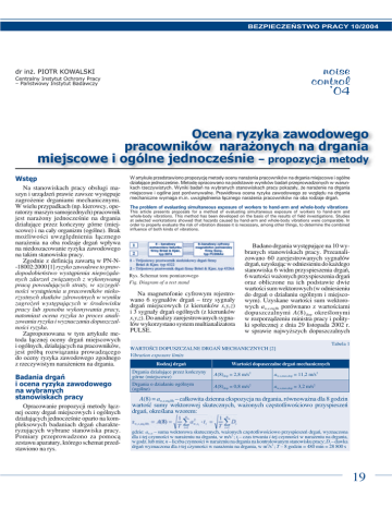 BEZPIECZEŃSTWO PRACY 10/2004 dr inż. PIOTR KOWALSKI Centralny Instytut Ochrony Pracy – Państwowy Instytut Badawczy Ocena ryzyka zawodowego pracowników narażonych na drgania miejscowe i ogólne jednocześnie – propozycja metody Wstęp Na stanowiskach pracy obsługi maszyn i urządzeń prawie zawsze występuje zagrożenie drganiami mechanicznymi. W wielu przypadkach (np. kierowcy, operatorzy maszyn samojezdnych) pracownik jest narażony jednocześnie na drgania działające przez kończyny górne (miejscowe) i na cały organizm (ogólne). Brak możliwości uwzględnienia łącznego narażenia na oba rodzaje drgań wpływa na niedoszacowanie ryzyka zawodowego na takim stanowisku pracy. Zgodnie z definicją zawartą w PN-N-18002:2000 [1] ryzyko zawodowe to prawdopodobieństwo wystąpienia niepożądanych zdarzeń związanych z wykonywaną pracą powodujących straty, w szczególności wystąpienia u pracowników niekorzystnych skutków zdrowotnych w wyniku zagrożeń występujących w środowisku pracy lub sposobu wykonywania pracy, natomiast ocena ryzyka to proces analizowania ryzyka i wyznaczania dopuszczalności ryzyka. Zaproponowana w tym artykule metoda łącznej oceny drgań miejscowych i ogólnych, działających na pracowników, jest próbą rozwiązania prowadzącego do oceny ryzyka zawodowego zgodnego z rzeczywistym narażeniem na drgania. Badania drgań i ocena ryzyka zawodowego na wybranych stanowiskach pracy Opracowanie propozycji metody łącznej oceny drgań miejscowych i ogólnych działających jednocześnie oparto na kompleksowych badaniach drgań charakteryzujących wybrane stanowiska pracy. Pomiary przeprowadzono za pomocą zestawu aparatury, którego schemat przedstawiono na rys. W artykule przedstawiono propozycję metody oceny narażenia pracowników na drgania miejscowe i ogólne działające jednocześnie. Metodę opracowano na podstawie wyników badań przeprowadzonych w warunkach rzeczywistych. Wyniki badań na wybranych stanowiskach pracy pokazały, że narażenie na drgania miejscowe i ogólne jest porównywalne. Prawidłowa ocena ryzyka zawodowego ze względu na drgania mechaniczne wymaga m.in. uwzględnienia łącznego narażenia pracowników na oba rodzaje drgań. The problem of evaluating simultaneous exposure of workers to hand-arm and whole-body vibrations This article presents proposals for a method of evaluating simultaneous exposure of workers to hand-arm and whole-body vibrations. This method has been developed on the basis of the results of field investigations. Studies at selected workstations showed that hazards caused by hand-arm and whole-body vibrations were comparable. In order to properly evaluate the risk of vibration disease it is necessary, among other things, to determine the combined influence of both kinds of vibrations. Rys. Schemat toru pomiarowego Fig. Diagram of a test stand Na magnetofonie cyfrowym rejestrowano 6 sygnałów drgań – trzy sygnały drgań miejscowych (z kierunków x,y,z) i 3 sygnały drgań ogólnych (z kierunków x,y,z). Do analizy zarejestrowanych sygnałów wykorzystano system multianalizatora PULSE. Badano drgania występujące na 10 wybranych stanowiskach pracy. Przeanalizowano 60 zarejestrowanych sygnałów drgań, uzyskując w odniesieniu do każdego stanowiska 6 widm przyspieszenia drgań, 6 wartości ważonych przyspieszenia drgań oraz obliczone na ich podstawie dwie wartości sum wektorowych (w odniesieniu do drgań o działaniu ogólnym i miejscowym). Uzyskane wartości sum wektorowych aw,e,eq,8h porównano z wartościami dopuszczalnymi A(8) dop określonymi w rozporządzeniu ministra pracy i polityki społecznej z dnia 29 listopada 2002 r. w sprawie najwyższych dopuszczalnych Tabela 1 WARTOŚCI DOPUSZCZALNE DRGAŃ MECHANICZNYCH [2] Vibration exposure limits Rodzaj drgań Drgania działające przez kończyny górne (miejscowe) Drgania o działaniu ogólnym (ogólne) Wartości dopuszczalne drgań mechanicznych A(8)dop = 2,8 m/s2 aw,s,max,dop = 11,2 m/s2 A(8)dop = 0,8 m/s2 aw,s,max,dop = 3,2 m/s2 A(8) = aw,e,eq,8h – całkowita dzienna ekspozycja na drgania, równoważna dla 8 godzin wartość sumy wektorowej skutecznych, ważonych częstotliwościowo przyspieszeń drgań, określana wzorem: gdzie: aw,si – suma wektorowa skutecznych, ważonych częstotliwościowo przyspieszeń drgań, wyznaczona dla i-tej czynności w narażeniu na drgania, w m/s2 ; ti – czas trwania i-tej czynności w narażeniu na drgania, w godz. lub min; n – liczba czynności w narażeniu na drgania na kontrolowanym stanowisku pracy; Di – dawka drgań wyznaczona dla i-tej czynności w narażeniu na drgania, w m2/s3 ; T – 8 godzin = 480 min = 28 800 s 19 BEZPIECZEŃSTWO PRACY 10/2004 stężeń i natężeń czynników szkodliwych dla zdrowia w środowisku pracy [2] przedstawionymi w tabeli 1. Obliczone krotności wartości dopuszczalnych posłużyły do oceny ryzyka zawodowego na badanych stanowiskach pracy. Zgodnie z normą PN-N-18002:2000 [1] przyjęto trójstopniową skalę oceny ryzyka: – krotność wartości dopuszczalnej < 0,5; ryzyko małe – 0,5 ≤ krotność wartości dopuszczalnej ≤ 1; ryzyko średnie – krotność wartości dopuszczalnej > 1; ryzyko duże. Wyniki przeprowadzonej oceny zestawiono w tabeli 2. Przedstawione wyniki badań wskazują na porównywalny udział w narażeniu pracownika obu rodzajów drgań (miejscowych i ogólnych). Zaobserwowano przypadki, w których wartości sum wektorowych obu rodzajów drgań osiągają ok. 0,5 wartości dopuszczalnych (NDN), np. autobus Jelcz M121, autobus Ikarus 280. Zgodnie ze stosowaną metodą oceny, oceniono ryzyko na tych stanowiskach jako średnie, czyli dopuszczalne. Gdy wartości obu sum wektorowych (drgań miejscowych i ogólnych) zbliżają się do wartości dopuszczalnych (np. autobus Man, autobus Solaris), przyjęcie ryzyka zawodowego za akceptowalne staje się już problematycz- ne. Podczas badań zarejestrowano także przypadki, w których 