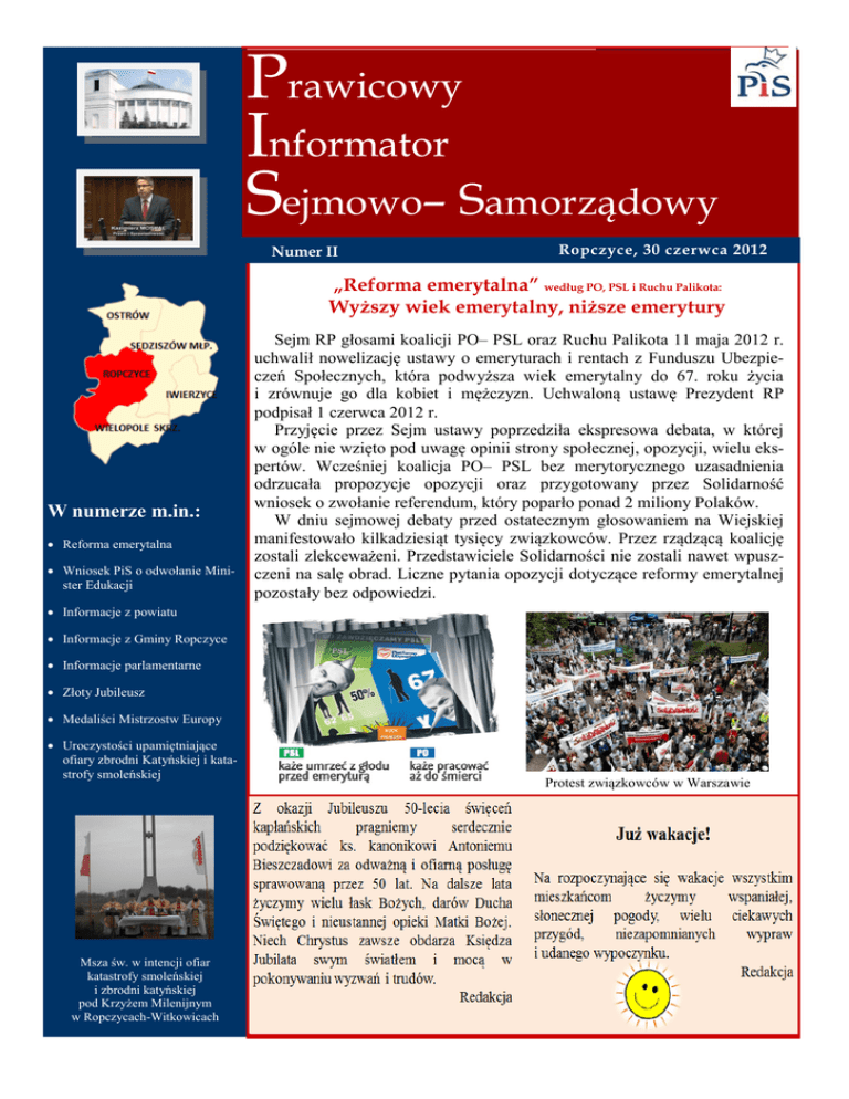 Prawicowy Informator Sejmowo– Samorządowy Numer II Ropczyce, 30 czerwca 2012 „Reforma emerytalna” według PO, PSL i Ruchu Palikota: Wyższy wiek emerytalny, niższe emerytury W numerze m.in.: Reforma emerytalna Wniosek PiS o odwołanie Minister Edukacji Sejm RP głosami koalicji PO– PSL oraz Ruchu Palikota 11 maja 2012 r. uchwalił nowelizację ustawy o emeryturach i rentach z Funduszu Ubezpieczeń Społecznych, która podwyższa wiek emerytalny do 67. roku życia i zrównuje go dla kobiet i mężczyzn. Uchwaloną ustawę Prezydent RP podpisał 1 czerwca 2012 r. Przyjęcie przez Sejm ustawy poprzedziła ekspresowa debata, w której w ogóle nie wzięto pod uwagę opinii strony społecznej, opozycji, wielu ekspertów. Wcześniej koalicja PO– PSL bez merytorycznego uzasadnienia odrzucała propozycje opozycji oraz przygotowany przez Solidarność wniosek o zwołanie referendum, który poparło ponad 2 miliony Polaków. W dniu sejmowej debaty przed ostatecznym głosowaniem na Wiejskiej manifestowało kilkadziesiąt tysięcy związkowców. Przez rządzącą koalicję zostali zlekceważeni. Przedstawiciele Solidarności nie zostali nawet wpuszczeni na salę obrad. Liczne pytania opozycji dotyczące reformy emerytalnej pozostały bez odpowiedzi. Informacje z powiatu Informacje z Gminy Ropczyce Informacje parlamentarne Złoty Jubileusz Medaliści Mistrzostw Europy Uroczystości upamiętniające ofiary zbrodni Katyńskiej i katastrofy smoleńskiej Msza św. w intencji ofiar katastrofy smoleńskiej i zbrodni katyńskiej pod Krzyżem Milenijnym w Ropczycach-Witkowicach Protest związkowców w Warszawie Prawicowy Informator Sejmowo– Samorządowy Informacje parlamentarne Str. 2 Rząd wbrew społeczeństwu, bez przeprowadzenia merytorycznej debaty, przeforsował swój projekt i podniósł wiek emerytalny To, co za wszelką cenę sforsował rząd PO-PSL nie jest prawdziwą reformą emerytalną. Przyjęcie tej ustawy doprowadzi młodych ludzi do emigracji, a starszych na głodowe zasiłki. Ustawa pogłębi bezrobocie, stworzy olbrzymie konflikty społeczne. Zupełnie zlekceważono środowisko wiejskie, nie uwzględniono wszystkich uwarunkowań pracy rolników. Rząd nie zaproponował żadnego programu, który zwiększałby zatrudnienie w naszym kraju. Trzeba przygotować miejsca pracy i pracowników do dłuższej aktywności zawodowej. Ludzie będą pracować dłużej, jeśli stworzy im się do tego warunki. Wprowadzenie ustawy oznacza spadek stopy zastąpienia dla świadczeń emerytalnych (relacja świadczenia emerytalnego do wynagrodzenia). W sposób znaczący zmniejszona została wysokość emerytury, natomiast emerytura częściowa w wysokości ok. 400 zł miesięcznie to nic innego jak kpina i poniżenie godności obywatela. Nieuczciwością rządu jest powoływanie się na europejskie standardy i tendencje wydłużania wieku emerytalnego. Dla porównania we Francji wiek emerytalny wynosi 62 lata, średnia długość życia wynosi ok. 80 lat, a średnia wysokość emerytury jest kilkakrotnie większa niż w Polsce. Dlaczego rząd PO-PSL nie dba o europejskie standardy w zakresie płac, zatrudnienia, długości życia czy też wysokości emerytur? Czy koszty naprawiania finansów publicznych zawsze ma ponosić zwykły obywatel? „Dyskusja o emeryturach nie powinna Protest ropczyckich związkowców w Warszawie koncentrować się tylko na problemie wydłużenia wieku aktywności zawodowej. Z systemem emerytalnym współgrać musi dbałość o rozwój ekonomiczny kraju. Równolegle - o zmianach w emeryturach nie można rozmawiać z pominięciem problematyki polityki prorodzinnej” B. Szydło, Wiceprezes PiS Koalicja PO-PSL broni szkodliwych działań Minister Edukacji Narodowej Urzędowanie Pani Minister Krystyny Szumilas to festiwal chaosu, niekompetencji, zaniechań, opóźnień i żenującej beztroski, dlatego Klub Parlamentarny PiS złożył 10 maja 2012 r. wniosek o votum nieufności wobec Ministra Edukacji Narodowej. Pomimo krótkiego urzędowania Pani Minister Szumilas ponosi pełną odpowiedzialność za bardzo niebezpieczny kierunek zmian w polskiej oświacie. Tym bardziej, że przy większości błędnych decyzji jakie podejmowała i podejmuje, arogancko odrzucała merytoryczne uwagi i propozycje zmian autorstwa opozycji oraz projekty obywatelskie. Tak było w przypadku projektów ustaw i rezolucji o odroczeniu obowiązku szkolnego sześciolatków, przywrócenia weta kuratora oświaty przy likwidacjach szkół czy przywrócenia liczby godzin historii. Tak również stało się w przypadku obywatelskiego projektu ustawy o objęciu wychowania przedszkolnego subwencją oświatową. Pani Minister ponosi odpowiedzialność za antysamorządową politykę. Wzrost samorządowych zadań edukacyjnych narzucanych przez rząd nie idzie bowiem w parze ze wzrostem środków finansowych przekazywanych na ich realizację. Jest to odczuwalne również w naszym powiecie. Problemy finansowe samorządów nawarstwiają się. Koalicja PO-PSL nie dostrzegając szkodliwych działań Pani Szumilas dnia 25 maja 2012 r. odrzuciła wniosek o jej odwołanie. Konferencja prasowa Forum Młodych PiS w Rzeszowie, kwiecień 2012 r. Uzasadnienie wniosku dostępne jest na stronie: www.kazimierz-moskal.pl Str. 3 Informacje z powiatu Echa realnych sukcesów minionej (2006-2010) kadencji samorządowej Powiatu Ropczycko-Sędziszowskiego — inwestycje oświatowe Na koniec I kwartału 2012 roku wydany został pierwszy numer informatora, który w bardzo ograniczonym zakresie dotyka problematyki samorządowej. W kolejnych numerach będziemy starać się systematycznie pokazywać i opisywać inwestycje powiatowe, które zostały zrealizowane w poprzedniej kadencji, a także inwestycje przygotowane łącznie z zabezpieczeniem środków finansowych przez Powiat w kadencji 20062010, a dokończone (bądź w trakcie realizacji) w czasie tej kadencji 2010-2014. Na zdecydowaną większość tych zadań pozyskane lub zabezpieczo