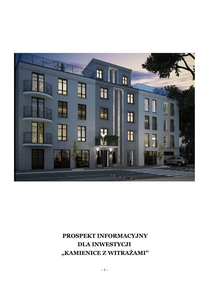 PROSPEKT INFORMACYJNY DLA INWESTYCJI „KAMIENICE Z WITRAŻAMI” -1- PROSPEKT INFORMACYJNY CZĘŚĆ OGÓLNA I. DANE IDENTYFIKACYJNE I KONTAKTOWE DOTYCZĄCE DEWELOPERA DANE DEWELOPERA Deweloper Dąbrowskiego sp zoo, KRS: 0000504810 Adres ul. Katowicka 125/1a, 41-500 Chorzów; biuro w Krakowie: ul Lwowska 25/10, 30-551 Kraków Nr NIP i REGON NIP: Nr telefonu Adres poczty elektronicznej Adres strony internetowej dewelopera 6272738504 REGON: +48 12 333 78 33 [email protected] WWW.KAMIENICEZWITRAZAMI.EU II. DOŚWIADCZENIE DEWELOPERA HISTORIA I UDOKUMENTOWANE DOŚWIADCZENIE DEWELOPERA UKOŃCZONE PRZEDSIĘWZIĘCIE DEWELOPERSKIE Adres Data rozpoczęcia Data zakończenia Deweloper Lwowska 25, 30 – 551 Kraków 2010r 2012r Grupa kapitałowa Eion Boutique Development PRZEDSIĘWZIĘCIE DEWELOPERSKIE W TRAKCIE REALIZACJI Adres Orkana 10, 43-300 Bielsko - Biała -2- 243528550 Data rozpoczęcia Data zakończenia Deweloper 2014r 2016r Grupa kapitałowa Eion Boutique Development III. INFORMACJE DOTYCZĄCE NIERUCHOMOŚCI I PRZEDSIĘWZIĘCIA DEWELOPERSKIEGO INFORMACJE DOTYCZĄCE GRUNTU Adres i nr działki ewidencyjnej 259/3 i 544/7 obręb 13 jednostka ewidencyjna Podgórze , dokładna lokalizacja działki zaznaczona jest na załączniku nr 1 Nr księgi wieczystej KR1P/504595/5 oraz KR1P/241560/9 Istniejące obciążenia hipoteczne brak nieruchomości lub wnioski o wpis w dziale czwartym księgi wieczystej Plan zagospodarowania przestrzennego dla sąsiadujących działek Zabudowa mieszkaniowo-usługowa zgodnie z załącznikiem nr 2 dopuszczalna wysokość zabudowy dopuszczalny działki Informacje zawarte w publicznie dostępnych dokumentach dotyczących przewidzianych inwestycji w promieniu 1 km od przedmiotowej nieruchomości procent 12 metrów zabudowy 50,00% budowa łącznicy kolejowej Kraków Zabłocie - Kraków Krzemionki, przebudowa stacji kolejowej Kraków Zabłocie. Szczegóły przebudowy w załączniku nr 3 INFORMACJE DOTYCZĄCE BUDYNKU Czy jest pozwolenie na budowę tak Czy pozwolenie na budowę jest ostateczne tak Czy pozwolenie na budowę jest zaskarżone nie Planowany termin rozpoczęcia rozpoczęcie IV kwartał 2016 i zakończenia prac budowlanych zakończenie I kwartał 2018 -3- Termin, do którego nastąpi przeniesienie prawa własności nieruchomości II kwartał 2018 1 Opis przedsięwzięcia deweloper- liczba budynków skiego Sposób pomiaru powierzchni zgodnie z normą PN-ISO 9836:1997 lokalu mieszkalnego lub domu jednorodzinnego Zamierzony sposób i procentowy środki własne 25% , kredyt deweloperski 75% udział źródeł finansowania przedsięwzięcia deweloperskiego Środki ochrony nabywców bankowy rachunek powierniczy służący gromadzeniu środków nabywcy, rachunek otwarty Nazwa instytucji zapewniającej bezpieczeństwo środków nabywcy Harmonogram przedsięwzięcia deweloperskiego, w etapach Etap 1 – WYKOPY I ZABEZPIECZENIE ŚCIAN WYKOPU - do 03.04.2017r. Etap 2 - STAN ZERO – do 03.04.2017r. Etap 3 – STAN SUROWY OTWARTY – do 14.08.2017r. Etap 4 - INSTALACJE - do 11.09.2017r. Etap 5 – STAN SUROWY ZAMKNIĘTY – do 13.11.2017r. Etap 6 – ELEWACJA , BALUSTRADY I ROBOTY ZEWNĘTRZNE - do 27.11.2017r. Etap 7 – PRACE WYKOŃCZENIOWE I ZAKOŃCZENIE INWESTYCJI – do 05.02.2018r. WARUNKI ODSTĄPIENIA OD UMOWY DEWELOPERSKIEJ Należy opisać na jakich warunkach można odstąpić od umowy deweloperskiej Zgodnie z art 29 ustawy z dnia 16 września 2011r, o ochronie praw nabywcy lokalu lub domu jednorodzinnego INNE INFORMACJE Uprzejmie informujemy o możliwości zapoznania się w lokalu przedsiębiorstwa przez osobę zainteresowaną zawarciem umowy deweloperskiej z: 1. aktualnym stanem księgi wieczystej prowadzonej dla nieruchomości; 2. kopią aktualnego odpisu z Krajowego Rejestru Sądowego 3. sprawozdaniem finansowym Dąbrowskiego sp zoo 4. projektem architektoniczno-budowlanym Zaświadcza się , że przeciwko deweloperowi nie prowadzono i nie prowadzi się toczą się żadnych postępowań egzekucyjnych. -4- CZĘŚĆ INDYWIDUALNA dla lokalu nr Cena m2 powierzchni lokalu mieszkalnego zł/m2 Określenie położenia oraz istotnych cech budynku w którym ma znajdować się lokal mieszkalny będący przedmiotem umowy deweloperskiej liczba kondygnacji 4 nadziemne 2 podziemne technologia wykonania żelbetowa standard prac wykończeniowych w części wspólnej budynku i terenie wokół niego, stanowiącym część wspólną nieruchomości KONSTRUKCJA BUDYNKU • strop żelbetowy • ściany nośne żelbetowe • ściany między mieszkaniami oraz ściany klatki schodowej żelbetowe • ściany łazienek wewnątrz mieszkań z bloczków silikatowych • dach płaski, zielony ELEMENTY ZEWNĘTRZNE BUDYNKU • ręcznie wykonane witraże • tynki na ścianach silikonowe lub silikatowe • stolarka okienna z pakietem 3szybowy • drzwi wejściowe do budynku aluminiowe • brama garażowa sterowana elektrycznie przez pilota • balustrady balkonów oraz tarasów ręcznie kute i szklane • monitoring • wideodomofon • oświetlenie elewacji ledowe liczba lokali w budynku 16 liczba miejsc garażowych i postojowych 11 dostępne media w budynku CO, ZW, CW, instalacja energetyczna , wodna i kanalizacyjna dostęp do drogi publicznej bezpośredni Określenie usytuowania lokalu według załącznika nr 4 mieszkalnego w budynku -5- Określenie powierzchni, układu pomieszczeń oraz zakresu i standardu prac wykończeniowych Powierzchnia m2, układ pomieszczenia wg. załącznika nr 4a lub 4b. Wykończenie lokalu do stanu deweloperskiego: tynki na ścianach i sufitach, wylewki na podłogach, punkty elektryczne i hydrauliczne wg załączników nr 5a- 5d . Możliwość rozprowadzenia punktów przed rozpoczęciem w/w prac wg, wskazania kupującego), punkty CO wraz z grzejnikami, instalacja teletechniczna doprowadzona do mieszkania (sat, internet wideodomofon wraz z odbiornikiem), instalacja klimatyzacji i rekuperacji bez jednostek, drzwi wejściowe ognioodporne, brak wykończenia okładziną podłóg 