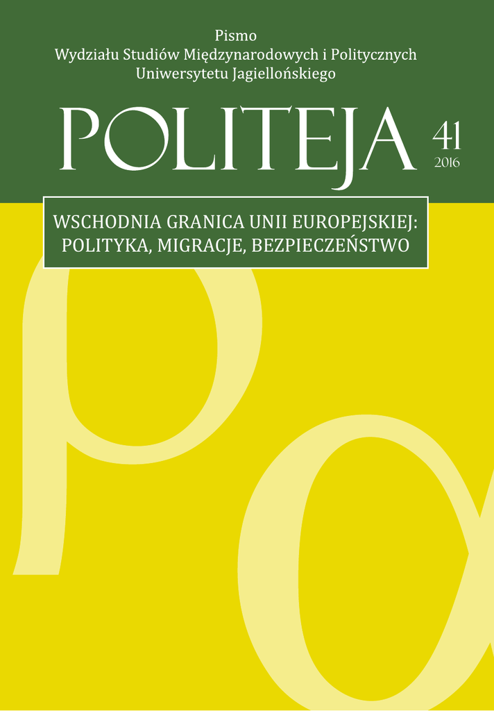 41 2016 WSCHODNIA GRANICA UNII EUROPEJSKIEJ: POLITYKA, MIGRACJE, BEZPIECZEŃSTWO Publikacja dofinansowana przez Ministerstwo Nauki i Szkolnictwa Wyższego oraz Wydział Studiów Międzynarodowych i Politycznych UJ. Publikacja wydana w dwóch wersjach: elektronicznej i drukowanej. Wersją pierwotną jest format elektroniczny Politeja. Pismo Wydziału Studiów Międzynarodowych i Politycznych Uniwersytetu Jagiellońskiego ul. Gołębia 24 31-107 Kraków tel.: 12 663 15 65, fax: 12 664 15 64 [email protected] www.politeja.wsmip.uj.edu.pl Wydawca: Księgarnia Akademicka sp. z o.o. ul. św. Anny 6, 31-008 Kraków tel.: 12 431 27 43 [email protected] www.akademicka.pl ISSN 1733-6716 Redakcja tekstów: Justyna Wójcik Projekt okładki: Łukasz Fyderek Projekt typograficzny: Studio ANATTA Skład i łamanie: Małgorzata Manterys-Rachwał Nakład: 150 egz. Na liście B czasopism punktowanych MNiSzW: 13 pkt Recenzenci Saad Abudayeh ( Jordan University) Artur Adamczyk (Uniwersytet Warszawski) Roman Bäcker (Uniwersytet Mikołaja Kopernika w Toruniu) Janusz Balicki (Uniwersytet Kardynała Stefana Wyszyńskiego) Walenty Baluk (Uniwersytet Marii Curie-Skłodowskiej w Lublinie) Monika Banaś (Uniwersytet Jagielloński) Marek Bankowicz (Uniwersytet Jagielloński) Włodzimierz Bernacki (Uniwersytet Jagielloński) Małgorzata Budyta-Budzyńska (Collegium Civitas) Maksim Bulachtin (Perm University) Maciej Cesarz (Uniwersytet Wrocławski) Joachim Diec (Uniwersytet Jagielloński) Artur Demchuk (Lomonosov Moscow State University) Andrzej Dudek (Uniwersytet Jagielloński) Agnieszka Florczak (Uniwersytet Wrocławski) Henryk Hałupczak (Uniwersytet Marii Curie-Skłodowskiej w Lublinie) Ireneusz Handzlik (Uniwersytet Warszawski) Wojciech Kaute (Uniwersytet Śląski w Katowicach) Małgorzata Klatt (University of Melbourne) Wawrzyniec Konarski (Uniwersytet Jagielloński) Leszek Korporowicz (Uniwersytet Jagielloński) Krzysztof Kościelniak (Uniwersytet Jagielloński) Barbara Krauz-Mozer (Uniwersytet Jagielloński) Paulina Kewes (University of Oxford) Magdalena Lesińska (Uniwersytet Warszawski) Marek Maciejewski (Uniwersytet Wrocławski) Stefan Markowski (UNSW Canberra) Gerhard Meiser (Universität Halle) Włodzimierz Mich (Uniwersytet Marii Curie Skłodowskiej w Lublinie) Dariusz Niedźwiedzki (Uniwersytet Jagielloński) Jakub Olchowski (Uniwersytet Marii Curie-Skłodowskiej w Lublinie) Paweł Olszewski (Polska Akademia Nauk) Anna Pacześniak (Uniwersytet Wrocławski) Patrycja Matusz Protasiewicz (Uniwersytet Wrocławski) Maciej Raś (Uniwersytet Warszawski) Andrea Schmidt (Pecs University) Mieczysław Smoleń (Uniwersytet Jagielloński) Tomasz Stępniewski (Katolicki Uniwersytet Lubelski) Barbara Stoczewska (Uniwersytet Jagielloński) Lucjan Suchanek (Państwowa Wyższa Szkoła Zawodowa w Oświęcimiu) Andrzej Szabaciuk (Katolicki Uniwersytet Lubelski) Krzysztof Szczerski (Uniwersytet Jagielloński) Dariusz Szpoper (Uniwersytet Gdański) Monika Strzęboszewska-Trojanowska (Uniwersytet Kardynała Stefana Wyszyńskiego) Ireneusz Topolski (Uniwersytet Marii Curie-Skłodowskiej w Lublinie) Paweł Turczyński (Uniwersytet Wrocławski) Janusz J. Węc (Uniwersytet Jagielloński) Howard Williams (Aberystwyth University) Ryszard Zięba(Uniwersytet Warszawski) Cezary Żołędowski (Uniwersytet Warszawski) Pismo Wydziału Studiów Międzynarodowych i Politycznych Uniwersytetu Jagiellońskiego POLITEJA Nr 2 (41) Kraków 2016 Wschodnia granica Unii Europejskiej: polityka, migracje, bezpieczeństwo pod redakcją Magdaleny Lesińskiej i Tomasza Stępniewskiego RADA PROGRAMOWA Prof. Jerzy Axer (Uniwersytet Warszawski) Prof. Andrea Ciampani (LUMSA, Roma) Prof. Břetislav Dančak (Masaryk University, Brno) Prof. Rahul Peter Das (Martin-Luther-Universität Halle-Wittenberg) Prof. Taras Finikov (KROK University, Kyiv) Prof. Saleh K. Hamarneh ( Jordan University) Prof. Ferenc Hörcher (Pázmány Péter Catholic University, Budapest) Prof. Alvydas Jokubaitis (Vilnius University) Prof. Wiesław Kozub-Ciembroniewicz (Instytut Nauk Politycznych i Stosunków Międzynarodowych UJ) Prof. Zdzisław Mach (Instytut Europeistyki UJ) Prof. Andrzej Mania (Instytut Nauk Politycznych i Stosunków Międzynarodowych UJ) Prof. Tadeusz Paleczny (Instytut Studiów Międzykulturowych UJ) Prof. Dorota Praszałowicz (Instytut Amerykanistyki i Studiów Polonijnych UJ) Prof. Anna Raźny (Instytut Rosji i Europy Wschodniej UJ) Prof. John Robertson (Cambridge University) Prof. Irena Stawowy-Kawka (Instytut Nauk Politycznych i Stosunków Międzynarodowych UJ) Prof. Noël O’Sullivan (University of Hull) Prof. Adam Walaszek (Instytut Amerykanistyki i Studiów Polonijnych UJ) Prof. Andrey Yuriyevich Shutov (Lomonosov Moscow State University) Prof. Andrzej Zięba (Instytut Nauk Politycznych i Stosunków Międzynarodowych UJ) REDAKTOR NACZELNY CZASOPISMA Prof. Bogdan Szlachta (Instytut Nauk Politycznych i Stosunków Międzynarodowych UJ) SEKRETARZ REDAKCJI CZASOPISMA Dr hab. Dorota Pietrzyk-Reeves (Instytut Nauk Politycznych i Stosunków Międzynarodowych UJ) Dr Arkadiusz Górnisiewicz (Instytut Nauk Politycznych i Stosunków Międzynarodowych UJ) Spis treści 5 Magdalena Lesińska, Tomasz Stępniewski, Specyfika wschodniej granicy Unii Europejskiej z perspektywy bezpieczeństwa i rozwoju Migracje – polityka migracyjna – granice 15 Marta Jaroszewicz, Migracje z Ukrainy do Unii Europejskiej z perspektywy ryzyka 37 Maciej Duszczyk, „Kryzys ukraiński” – czy konieczność redefinicji polskiej polityki imigracyjnej? 57 Piotr Kaźmierkiewicz, Relative Impact of Administrative Measures on Labour Migration Flows from Central Asia 77 Magdalena Lesińska, Polityczna rola diaspory na przykładzie krajów Europy Środkowo-Wschodniej i obszaru postsowieckiego 99 Agnieszka Piekutowska, Mały ruch graniczny – konsekwencje dla regionów przygranicznych 115 Magdalena Perkowska, Zagrożenie przestępczością na wschodniej granicy Polski – struktura i dynamika zjawisk