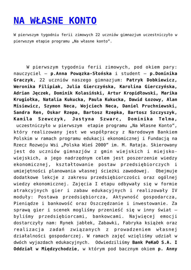 NA WŁASNE KONTO W pierwszym tygodniu ferii zimowych 22 uczniów gimnazjum uczestniczyło w pierwszym etapie programu „Na własne konto”. W pierwszym tygodniu ferii zimowych, pod okiem pary: nauczyciel – p.Anna Powązka-Słońska i student – p.Dominika Graczyk, 22 uczniów naszego gimnazjum: Patryk Dobkiewicz, Weronika Filipiak, Julia Gierczyńska, Karolina Gierczyńska, Adrian Jęczek, Dominik Kolasiński, Artur Kropidłowski, Marika Krugiołka, Natalia Kukucka, Paula Kukucka, Dawid Łozowy, Alan Misiewicz, Szymon Neca, Wojciech Neca, Daniel Pruchniewski, Sandra Ren, Oskar Rzepa, Bartosz Rzepka, Bartosz Szczyszyk, Kamila Szewczyk, Justyna Szwarc, Dominika Telma, uczestniczyło w pierwszym etapie programu „Na Własne Konto”, który realizowany jest we współpracy z Narodowym Bankiem Polskim w ramach programu edukacji ekonomicznej i Fundacją na Rzecz Rozwoju Wsi „Polska Wieś 2000” im. M. Rataja. Skierowany jest do uczniów gimnazjów z gmin wiejskich i miejskowiejskich, a jego nadrzędnym celem jest poszerzenie wiedzy ekonomicznej, kształtowanie postaw przedsiębiorczych i umiejętności planowania własnej ścieżki zawodowej. Obejmuje dodatkowe lekcje z zakresu przedsiębiorczości oraz ogólnej wiedzy ekonomicznej. Zajęcia I etapu odbywały się w formie atrakcyjnych gier i zabaw edukacyjnych i realizowały IV moduły: Postawa przedsiębiorcza, Aktywność gospodarcza, Pieniądze i bankowość oraz Oszczędzanie i inwestowanie. Za sprawą gier i scenek mogliśmy przenieść się w inny świat – byliśmy przedsiębiorcami, bankowcami. Najwięcej emocji dostarczyły nam: Rynek jabłek, Zabawki, Fabryka książek oraz realizacja zadań związanych z prowadzeniem własnej działalności gospodarczej. W ramach zajęć wzięliśmy udział w dwóch wyjazdach edukacyjnych. Odwiedziliśmy Bank PeKaO S.A. I Oddział w Międzychodzie, w którym pod bacznym okiem p. Anny Borowiak i p. Marty Szklennik zgłębialiśmy tajniki wiedzy bankowej oraz międzyrzecką firmę Instalko p. Romana Strzelczyka zajmującą się budownictwem ogólnym i inżynierią lądową. Poznaliśmy zasady funkcjonowania prywatnego przedsiębiorstwa, pasywnego budownictwa mieszkaniowego oraz pod okiem syna właściciela p. Piotra Strzelczyka i kierownika p.Waldemara Gajlewicza odbyliśmy niesamowitą wyprawę po placu budowy w Sulęcinie. Przed nami II etap programu – Biznesplan. Marketing i reklama oraz przygotowanie pracy projektowej: TECZKA SPÓŁDZIELNI UCZNIOWSKIEJ. Ponadto wszyscy uczestnicy projektu, którzy chcą powalczyć o roczne stypendium naukowe zostali zaproszeni do wzięcia udziału w konkursie na najlepszy artykuł ekonomiczny. Dziękujemy p. Mirosławie Furmanek – dyrektorowi naszej szkoły, p. Bartłomiejowi Kucharykowi – wójtowi gminy, p. Justynie Kucharyk – koordynatorowi, p. Czesławowi Maternie – kierowcy oraz p. Annie Powązka-Słońskiej za zorganizowanie wspaniałej przygody z ekonomią i przedsiębiorczością. W imieniu uczestników programu Natalia Kukucka 20150218_113032 20150218_113040 20150218_122051 20150218_122107 20150218_130934 zdjcie-0288 zdjcie-0289 zdjcie-0290 zdjcie-0291 zdjcie-0292 zdjcie-0293 zdjcie-0294 zdjcie-0295 zdjcie-0296 zdjcie-0297 zdjcie-0298 zdjcie-0299 zdjcie-0300 zdjcie-0301 zdjcie-0302 zdjcie-0304 zdjcie-0307 zdjcie-0308 zdjcie-0309 zdjcie-0310 zdjcie-0311 zdjcie-0313 zdjcie-0316 zdjcie-0317 zdjcie-0318 zdjcie-0319 zdjcie-0320 zdjcie-0321 zdjcie-0322 zdjcie-0323 zdjcie-0324 zdjcie-0325 zdjcie-0326 zdjcie-0328 zdjcie-0329 zdjcie-0330 zdjcie-0333 zdjcie-0334 zdjcie-0335 zdjcie-0336 zdjcie-0337 zdjcie-0338 zdjcie-0339