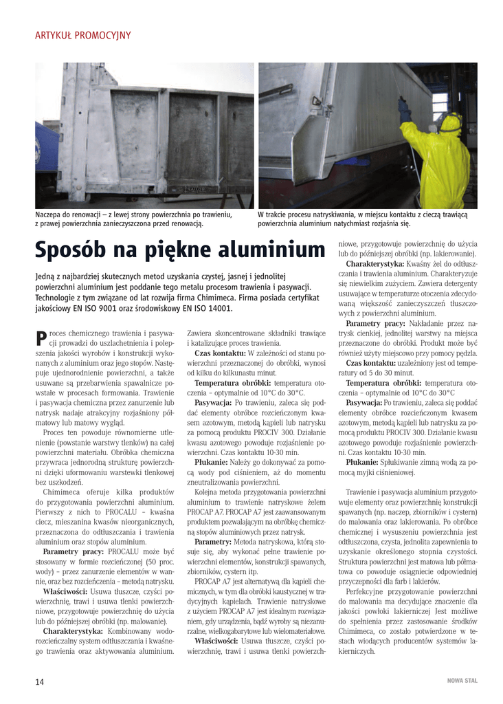 ARTYKUŁ PROMOCYJNY Naczepa do renowacji – z lewej strony powierzchnia po trawieniu, z prawej powierzchnia zanieczyszczona przed renowacją. W trakcie procesu natryskiwania, w miejscu kontaktu z cieczą trawiącą powierzchnia aluminium natychmiast rozjaśnia się. Sposób na piękne aluminium Jedną z najbardziej skutecznych metod uzyskania czystej, jasnej i jednolitej powierzchni aluminium jest poddanie tego metalu procesom trawienia i pasywacji. Technologie z tym związane od lat rozwija firma Chimimeca. Firma posiada certyfikat jakościowy EN ISO 9001 oraz środowiskowy EN ISO 14001. roces chemicznego trawienia i pasywacji prowadzi do uszlachetnienia i polepszenia jakości wyrobów i konstrukcji wykonanych z aluminium oraz jego stopów. Następuje ujednorodnienie powierzchni, a także usuwane są przebarwienia spawalnicze powstałe w procesach formowania. Trawienie i pasywacja chemiczna przez zanurzenie lub natrysk nadaje atrakcyjny rozjaśniony półmatowy lub matowy wygląd. Proces ten powoduje równomierne utlenienie (powstanie warstwy tlenków) na całej powierzchni materiału. Obróbka chemiczna przywraca jednorodną strukturę powierzchni dzięki uformowaniu warstewki tlenkowej bez uszkodzeń. Chimimeca oferuje kilka produktów do przygotowania powierzchni aluminium. Pierwszy z nich to PROCALU – kwaśna ciecz, mieszanina kwasów nieorganicznych, przeznaczona do odtłuszczania i trawienia aluminium oraz stopów aluminium. Parametry pracy: PROCALU może być stosowany w formie rozcieńczonej (50 proc. wody) – przez zanurzenie elementów w wannie, oraz bez rozcieńczenia – metodą natrysku. Właściwości: Usuwa tłuszcze, czyści powierzchnię, trawi i usuwa tlenki powierzchniowe, przygotowuje powierzchnię do użycia lub do późniejszej obróbki (np. malowanie). Charakterystyka: Kombinowany wodorozcieńczalny system odtłuszczania i kwaśnego trawienia oraz aktywowania aluminium. P 14 Zawiera skoncentrowane składniki trawiące i katalizujące proces trawienia. Czas kontaktu: W zależności od stanu powierzchni przeznaczonej do obróbki, wynosi od kilku do kilkunastu minut. Temperatura obróbki: temperatura otoczenia – optymalnie od 10°C do 30°C. Pasywacja: Po trawieniu, zaleca się poddać elementy obróbce rozcieńczonym kwasem azotowym, metodą ̨ kąpieli lub natrysku za pomocą produktu PROCIV 300. Działanie kwasu azotowego powoduje rozjaśnienie powierzchni. Czas kontaktu 10-30 min. Płukanie: Należy go dokonywać za pomocą wody pod ciśnieniem, aż do momentu zneutralizowania powierzchni. Kolejna metoda przygotowania powierzchni aluminium to trawienie natryskowe żelem PROCAP A7. PROCAP A7 jest zaawansowanym produktem pozwalającym na obróbkę chemiczną stopów aluminiowych przez natrysk. Parametry: Metoda natryskowa, którą stosuje się, aby wykonać pełne trawienie powierzchni elementów, konstrukcji spawanych, zbiorników, cystern itp. PROCAP A7 jest alternatywą dla kąpieli chemicznych, w tym dla obróbki kaustycznej w tradycyjnych kąpielach. Trawienie natryskowe z użyciem PROCAP A7 jest idealnym rozwiązaniem, gdy urządzenia, bądź wyroby są niezanurzalne, wielkogabarytowe lub wielomateriałowe. Właściwości: Usuwa tłuszcze, czyści powierzchnię, trawi i usuwa tlenki powierzch- niowe, przygotowuje powierzchnię do użycia lub do późniejszej obróbki (np. lakierowanie). Charakterystyka: Kwaśny żel do odtłuszczania i trawienia aluminium. Charakteryzuje się niewielkim zużyciem. Zawiera detergenty usuwające w temperaturze otoczenia zdecydowaną większość zanieczyszczeń tłuszczowych z powierzchni aluminium. Parametry pracy: Nakładanie przez natrysk cienkiej, jednolitej warstwy na miejsca przeznaczone do obróbki. Produkt może być również użyty miejscowo przy pomocy pędzla. Czas kontaktu: uzależniony jest od temperatury od 5 do 30 minut. Temperatura obróbki: temperatura otoczenia – optymalnie od 10°C do 30°C Pasywacja: Po trawieniu, zaleca się poddać elementy obróbce rozcieńczonym kwasem azotowym, metodą k̨ ąpieli lub natrysku za pomocą produktu PROCIV 300. Działanie kwasu azotowego powoduje rozjaśnienie powierzchni. Czas kontaktu 10-30 min. Płukanie: Spłukiwanie zimną wodą za pomocą myjki ciśnieniowej. Trawienie i pasywacja aluminium przygotowuje elementy oraz powierzchnię konstrukcji spawanych (np. naczep, zbiorników i cystern) do malowania oraz lakierowania. Po obróbce chemicznej i wysuszeniu powierzchnia jest odtłuszczona, czysta, jednolita zapewnienia to uzyskanie określonego stopnia czystości. Struktura powierzchni jest matowa lub półmatowa co powoduje osiągniecie odpowiedniej przyczepności dla farb i lakierów. Perfekcyjne przygotowanie powierzchni do malowania ma decydujące znaczenie dla jakości powłoki lakierniczej Jest możliwe do spełnienia przez zastosowanie środków Chimimeca, co zostało potwierdzone w testach wiodących producentów systemów lakierniczych. NOWA STAL