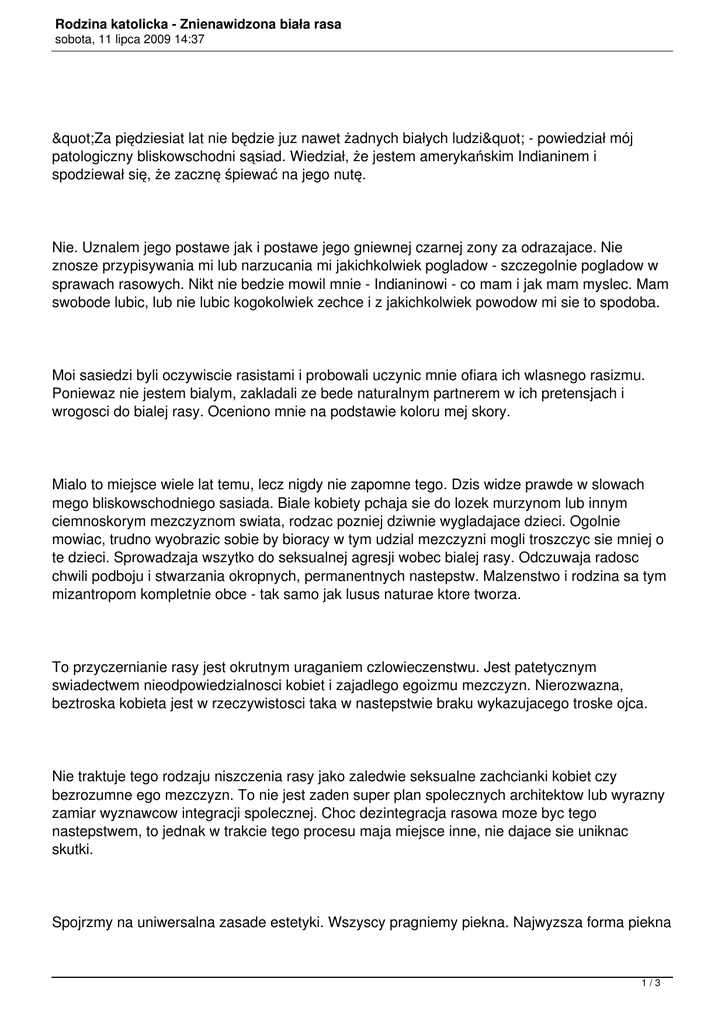 Rodzina katolicka - Znienawidzona biała rasa sobota, 11 lipca 2009 14:37 "Za piędziesiat lat nie będzie juz nawet żadnych białych ludzi" - powiedział mój patologiczny bliskowschodni sąsiad. Wiedział, że jestem amerykańskim Indianinem i spodziewał się, że zacznę śpiewać na jego nutę. Nie. Uznalem jego postawe jak i postawe jego gniewnej czarnej zony za odrazajace. Nie znosze przypisywania mi lub narzucania mi jakichkolwiek pogladow - szczegolnie pogladow w sprawach rasowych. Nikt nie bedzie mowil mnie - Indianinowi - co mam i jak mam myslec. Mam swobode lubic, lub nie lubic kogokolwiek zechce i z jakichkolwiek powodow mi sie to spodoba. Moi sasiedzi byli oczywiscie rasistami i probowali uczynic mnie ofiara ich wlasnego rasizmu. Poniewaz nie jestem bialym, zakladali ze bede naturalnym partnerem w ich pretensjach i wrogosci do bialej rasy. Oceniono mnie na podstawie koloru mej skory. Mialo to miejsce wiele lat temu, lecz nigdy nie zapomne tego. Dzis widze prawde w slowach mego bliskowschodniego sasiada. Biale kobiety pchaja sie do lozek murzynom lub innym ciemnoskorym mezczyznom swiata, rodzac pozniej dziwnie wygladajace dzieci. Ogolnie mowiac, trudno wyobrazic sobie by bioracy w tym udzial mezczyzni mogli troszczyc sie mniej o te dzieci. Sprowadzaja wszytko do seksualnej agresji wobec bialej rasy. Odczuwaja radosc chwili podboju i stwarzania okropnych, permanentnych nastepstw. Malzenstwo i rodzina sa tym mizantropom kompletnie obce - tak samo jak lusus naturae ktore tworza. To przyczernianie rasy jest okrutnym uraganiem czlowieczenstwu. Jest patetycznym swiadectwem nieodpowiedzialnosci kobiet i zajadlego egoizmu mezczyzn. Nierozwazna, beztroska kobieta jest w rzeczywistosci taka w nastepstwie braku wykazujacego troske ojca. Nie traktuje tego rodzaju niszczenia rasy jako zaledwie seksualne zachcianki kobiet czy bezrozumne ego mezczyzn. To nie jest zaden super plan spolecznych architektow lub wyrazny zamiar wyznawcow integracji spolecznej. Choc dezintegracja rasowa moze byc tego nastepstwem, to jednak w trakcie tego procesu maja miejsce inne, nie dajace sie uniknac skutki. Spojrzmy na uniwersalna zasade estetyki. Wszyscy pragniemy piekna. Najwyzsza forma piekna 1/3 Rodzina katolicka - Znienawidzona biała rasa sobota, 11 lipca 2009 14:37 to biala rasa. Jej roznorodnosc kolorow - czerwona rudosc wlosow, zlocistosc blond wlosow, zielen i blekit oczu ... Wszystkie pozostale rasy swiata maja jeden wspolny koloryt - te same czarne wlosy, ciemno-brunatne oczy i skore. Dosyc mdle porownanie, prawda? Ciemnoskorzy na calym swiecie zawsze byli i sa prawdziwie zafascynowani biala rasa, jest jednak oczywitym, ze istnieje tez pewna zawisc, ktora nieuniknienie pojawia sie. Wydaje sie, ze Hitler mial racje piszac o "znienawidzonej bialej rasie." (Mein Kampf, p.325.) Seksualny kontakt ciemnego z bialym, czyni biale ciemnym, a wiekszosc ludzi - szczegolnie bialych ludzi - zapomina o fakcie, ze biala rasa jest mniejszoscia w swiecie. Ciemne rasy maja i zawsze mialy liczebna przewage nad bialymi. Do tego pigmentacja calej bialej rasy jest genetycznie recesywna. Biel jest pierwsza rzecza, ktora zanika. Tak wiec, integracja oznacza stopniowa eliminacje bialej rasy. Tak to po prostu wyglada w swiecie genetyki. To ze biala rasa stala sie najpotezniejsza, dominujaca i panujaca rasa przypisane moze byc bardziej niz czemukolwiek innemu jej kulturowym wartosciom. To wlasnie biala rasa przyjela judeo-chcrzescijanska religie. Struktura spoleczna i psychologiczne hierarchie oparte na tej tradycji stworzyly ludzi bardziej wnikliwych i bystrych pod kazdym wzgledem. 'Mentalne' (jakie by one nie byly) problemy bialej rasy nabyte w rezultacie bycia bardziej potezna niz inne, sa skutkiem niedawnej ewolucji. Bialy czlowiek zbudowal tron jak zaden inny w historii i jesli nawet jego fundament ma cechy kryminalne, to ten zarzut - gatunkowo slaby wynika glownie z zawisci. Do tego jaki sens ma oskarzanie bialego czlowieka o niestosowanie sie do swej bialej moralnosci, przez ciemnoskorego czlowieka, ktory sam tych wlasnie wartosci nie wyznaje? Zarzut hipokryzji jest chybiony i nieudolny. Publiczne samobiczowanie sie bialego czlowieka jest jedyna i ostatnia nadzieja ciemnoskorych. Nie chcialbym doczekac czasow gdy nie bedzie juz bialej rasy. Nie chcialbym widziec na tym swiecie wiecej ludzi takich jak moi sasiedzi - z cala pewnoscia ludzi o ich nastawieniu. Jest jednak rosnaca w swiecie liczba myslacych jak oni osob i nalezy podchodzic do tego z niepokojem. Swiat muzulmanski ma szczegolna tendencje do tworzenia takich nastrojow. Maskowana w moralnych, religijnych, politycznych a nawet genetycznych kategoriach sprawa jest jednak jasna i oczywista: "znienawidzona biala rasa" jest postrzegana jako taka, za jej potege i piekno. 2/3 Rodzina katolicka - Znienawidzona biała rasa sobota, 11 lipca 2009 14:37 David Yeagley Autor jest pra-prawnukiem Bad Eagle - wodza Komanczów. Źródło: Prawica.net 3/3