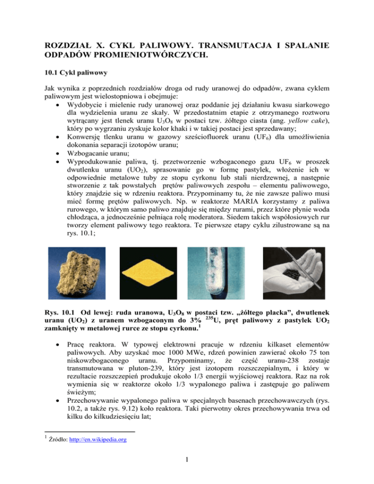 ROZDZIAŁ X. CYKL PALIWOWY. TRANSMUTACJA I SPALANIE ODPADÓW PROMIENIOTWÓRCZYCH. 10.1 Cykl paliwowy Jak wynika z poprzednich rozdziałów droga od rudy uranowej do odpadów, zwana cyklem paliwowym jest wielostopniowa i obejmuje: • Wydobycie i mielenie rudy uranowej oraz poddanie jej działaniu kwasu siarkowego dla wydzielenia uranu ze skały. W przedostatnim etapie z otrzymanego roztworu wytrącany jest tlenek uranu U3O8 w postaci tzw. żółtego ciasta (ang. yellow cake), który po wygrzaniu zyskuje kolor khaki i w takiej postaci jest sprzedawany; • Konwersję tlenku uranu w gazowy sześciofluorek uranu (UF6) dla umożliwienia dokonania separacji izotopów uranu; • Wzbogacanie uranu; • Wyprodukowanie paliwa, tj. przetworzenie wzbogaconego gazu UF6 w proszek dwutlenku uranu (UO2), sprasowanie go w formę pastylek, włożenie ich w odpowiednie metalowe tuby ze stopu cyrkonu lub stali nierdzewnej, a następnie stworzenie z tak powstałych prętów paliwowych zespołu – elementu paliwowego, który znajdzie się w rdzeniu reaktora. Przypominamy tu, że nie zawsze paliwo musi mieć formę prętów paliwowych. Np. w reaktorze MARIA korzystamy z paliwa rurowego, w którym samo paliwo znajduje się między rurami, przez które płynie woda chłodząca, a jednocześnie pełniąca rolę moderatora. Siedem takich współosiowych rur tworzy element paliwowy tego reaktora. Te pierwsze etapy cyklu zilustrowane są na rys. 10.1; Rys. 10.1 Od lewej: ruda uranowa, U3O8 w postaci tzw. „żółtego placka”, dwutlenek uranu (UO2) z uranem wzbogaconym do 3% 235U, pręt paliwowy z pastylek UO2 zamknięty w metalowej rurce ze stopu cyrkonu.1 • • 1 Pracę reaktora. W typowej elektrowni pracuje w rdzeniu kilkaset elementów paliwowych. Aby uzyskać moc 1000 MWe, rdzeń powinien zawierać około 75 ton niskowzbogaconego uranu. Przypominamy, że część uranu-238 zostaje transmutowana w pluton-239, który jest izotopem rozszczepialnym, i który w rezultacie rozszczepień produkuje około 1/3 energii wyjściowej reaktora. Raz na rok wymienia się w reaktorze około 1/3 wypalonego paliwa i zastępuje go paliwem świeżym; Przechowywanie wypalonego paliwa w specjalnych basenach przechowawczych (rys. 10.2, a także rys. 9.12) koło reaktora. Taki pierwotny okres przechowywania trwa od kilku do kilkudziesięciu lat; Źródło: http://en.wikipedia.org 1 Rys. 10.2 Przykład basenu przechowawczego na wypalone paliwo • • • Recyklizację, a więc odzyskiwanie w drodze chemicznej uranu i plutonu. Rozpuszczenie prętów paliwowych w kwasie azotowym stwarza też nadzieję na odseparowanie niektórych aktynowców. Odzyskany uran może być skierowany albo do wytworni paliwa, w której najpierw zostanie on przerobiony na sześciofluorek uranu, a następnie odpowiednio wzbogacony, albo też z mieszaniny tlenków plutonu i uranu wytworzy się tzw. paliwo MOX dla reaktorów. W Europie mamy obecnie trzy przetwórnie wypalonego paliwa (dwie w La Hague we Francji i jedną w Sellafield w Anglii); Witryfikację (zeszklenie) i zapakowanie zeszklonych odpadów do kanistrów ze stali nierdzewnej lub miedzi; Ostateczne składowanie, przy czym terenem na takie składowisko mogą być dawne wyrobiska solne, skała granitowa, czy tuf wulkaniczny. Przechowywanie wypalonego paliwa w basenach przechowawczych ma tę zaletę, że woda umożliwia dobry odbiór ciepła powstającego w wyniku rozpadów promieniotwórczych w wypalonym paliwie, a ponadto w miarę upływu czasu aktywność paliwa spada (około 1000 razy w ciągu pierwszych 40 – 50 lat). Po kilkunastu latach produkcja ciepła jest już na tyle niewielka, że paliwo można przenieść do przechowalników suchych (rys. 10.3); ponadto, dłuższe przechowywanie kaset paliwowych w wodzie grozi rozwinięciem się korozji i rozszczelnieniem kaset. Problemem technicznym suchego przechowalnika, szczególnie jeśli jest on na powierzchni, jest zapewnienie właściwej cyrkulacji powietrza, jako chłodziwa, a z drugiej strony niedopuszczenie do uwalniania się gazów promieniotwórczych na zewnątrz przechowalnika. Planowany okres przechowywania w suchym przechowalniku, to około kilkudziesięciu lat. Na dziś „najprostszym” rozwiązaniem jest składowisko głębinowe, o którym mówiliśmy w poprzednim rozdziale. Niemniej jednak i tu należy mieć na uwadze, że konstrukcja i prace związane z takim składowiskiem obliczone są na lata. Sama faza planistyczna trwa około 30 lat2. Kolejne 30 lat to okres przeznaczony na składowanie odpadów. Szczegółowy monitoring składowiska trwa kolejne ok. 70 lat, po czym przechodzi się do fazy zamknięcia składowiska 2 R.Zajdler, Gospodarka zużytym paliwem jądrowym, Biuletyn miesięczny PSE 3 (2006) 7 2 i faza ta, to także około 20 lat. Jak więc widać te wszystkie procesy są obliczone na pokolenia, co stanowi poważny problem społeczny. Rys. 10.3 Projekt suchego przechowalnika na wypalone paliwo wewnątrz korpusu reaktora EWA w Świerku Opisane tu składowanie ostateczne pociąga za sobą jeszcze jeden problem, a mianowicie bezpowrotnie marnowaną energię drzemiącą w wypalonym paliwie. Dlatego też, niektórzy liczą na opracowanie odpowiednich efektywnych metod wykorzystania dzisiejszych odpadów. Recyklizacja i witryfikacja nie wszędzie są możliwe do wykonania, gdyż dla tych procesów wymagane jest posiadanie odpowiednich fabryk przerobu wypalonego paliwa, a same procesy są bardzo kosztochłonne, nie wspominając o konieczności dysponowania wysoką kulturą technologiczną niezbędną do bezpiecznego i skutecznego prowadzenia obu procesów. Jeśli są one prowadzone, taka sekwencja działań nazywana jest zamkniętym cyklem paliwowym, jeśli nie ma etapu recyklizacji – cyklem otwartym. Rys. 10.4 pokazuje schemat cyklu zamkniętego. Schemat ten pokazuje element, o którym dotąd nie mówiliśmy, a mianowicie „reaktor transmutacji”. Jest to na tyle nowa instalacja, że wymaga oddzielnego omówienia. Pods
