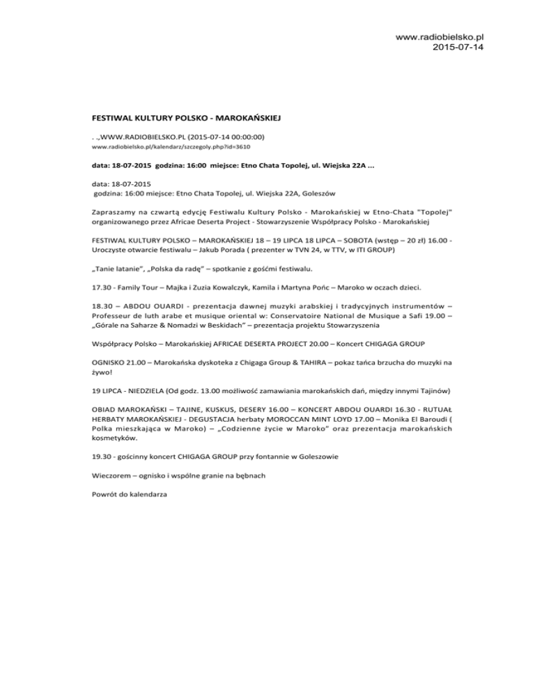 www.radiobielsko.pl 2015-07-14 FESTIWAL KULTURY POLSKO - MAROKAŃSKIEJ . .,WWW.RADIOBIELSKO.PL (2015-07-14 00:00:00) www.radiobielsko.pl/kalendarz/szczegoly.php?id=3610 data: 18-07-2015 godzina: 16:00 miejsce: Etno Chata Topolej, ul. Wiejska 22A ... data: 18-07-2015 godzina: 16:00 miejsce: Etno Chata Topolej, ul. Wiejska 22A, Goleszów Zapraszamy na czwartą edycję Festiwalu Kultury Polsko - Marokańskiej w Etno-Chata "Topolej" organizowanego przez Africae Deserta Project - Stowarzyszenie Współpracy Polsko - Marokańskiej FESTIWAL KULTURY POLSKO – MAROKAŃSKIEJ 18 – 19 LIPCA 18 LIPCA – SOBOTA (wstęp – 20 zł) 16.00 Uroczyste otwarcie festiwalu – Jakub Porada ( prezenter w TVN 24, w TTV, w ITI GROUP) „Tanie latanie”, „Polska da radę” – spotkanie z gośćmi festiwalu. 17.30 - Family Tour – Majka i Zuzia Kowalczyk, Kamila i Martyna Pońc – Maroko w oczach dzieci. 18.30 – ABDOU OUARDI - prezentacja dawnej muzyki arabskiej i tradycyjnych instrumentów – Professeur de luth arabe et musique oriental w: Conservatoire National de Musique a Safi 19.00 – „Górale na Saharze & Nomadzi w Beskidach” – prezentacja projektu Stowarzyszenia Współpracy Polsko – Marokańskiej AFRICAE DESERTA PROJECT 20.00 – Koncert CHIGAGA GROUP OGNISKO 21.00 – Marokańska dyskoteka z Chigaga Group & TAHIRA – pokaz tańca brzucha do muzyki na żywo! 19 LIPCA - NIEDZIELA (Od godz. 13.00 możliwość zamawiania marokańskich dań, między innymi Tajinów) OBIAD MAROKAŃSKI – TAJINE, KUSKUS, DESERY 16.00 – KONCERT ABDOU OUARDI 16.30 - RUTUAŁ HERBATY MAROKAŃSKIEJ - DEGUSTACJA herbaty MOROCCAN MINT LOYD 17.00 – Monika El Baroudi ( Polka mieszkająca w Maroko) – „Codzienne życie w Maroko” oraz prezentacja marokańskich kosmetyków. 19.30 - gościnny koncert CHIGAGA GROUP przy fontannie w Goleszowie Wieczorem – ognisko i wspólne granie na bębnach Powrót do kalendarza