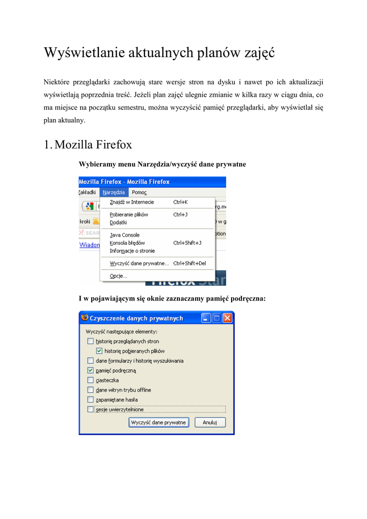 Wyświetlanie aktualnych planów zajęć Niektóre przeglądarki zachowują stare wersje stron na dysku i nawet po ich aktualizacji wyświetlają poprzednia treść. JeŜeli plan zajęć ulegnie zmianie w kilka razy w ciągu dnia, co ma miejsce na początku semestru, moŜna wyczyścić pamięć przeglądarki, aby wyświetlał się plan aktualny. 1. Mozilla Firefox Wybieramy menu Narzędzia/wyczyść dane prywatne I w pojawiającym się oknie zaznaczamy pamięć podręczna: 2. Internet Explorer Menu: Narzędzia/usuń historia przeglądania I w oknie zaznaczamy: Tymczasowe pliki internetowe