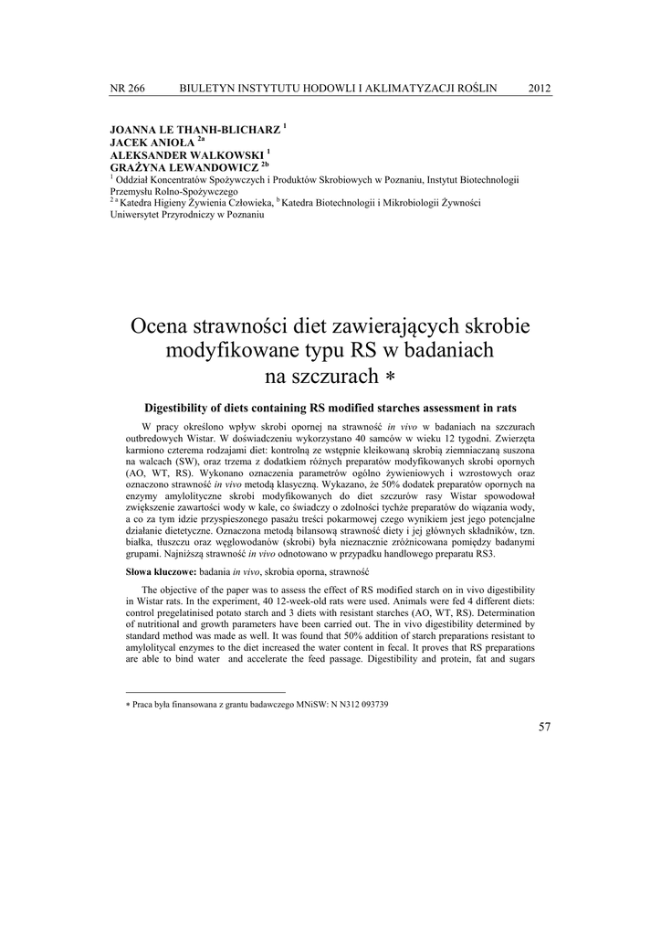 NR 266 BIULETYN INSTYTUTU HODOWLI I AKLIMATYZACJI ROŚLIN 2012 JOANNA LE THANH-BLICHARZ 1 JACEK ANIOŁA 2a ALEKSANDER WALKOWSKI 1 GRAŻYNA LEWANDOWICZ 2b 1 Oddział Koncentratów Spożywczych i Produktów Skrobiowych w Poznaniu, Instytut Biotechnologii Przemysłu Rolno-Spożywczego 2a Katedra Higieny Żywienia Człowieka, b Katedra Biotechnologii i Mikrobiologii Żywności Uniwersytet Przyrodniczy w Poznaniu Ocena strawności diet zawierających skrobie modyfikowane typu RS w badaniach na szczurach ∗ Digestibility of diets containing RS modified starches assessment in rats W pracy określono wpływ skrobi opornej na strawność in vivo w badaniach na szczurach outbredowych Wistar. W doświadczeniu wykorzystano 40 samców w wieku 12 tygodni. Zwierzęta karmiono czterema rodzajami diet: kontrolną ze wstępnie kleikowaną skrobią ziemniaczaną suszona na walcach (SW), oraz trzema z dodatkiem różnych preparatów modyfikowanych skrobi opornych (AO, WT, RS). Wykonano oznaczenia parametrów ogólno żywieniowych i wzrostowych oraz oznaczono strawność in vivo metodą klasyczną. Wykazano, że 50% dodatek preparatów opornych na enzymy amylolityczne skrobi modyfikowanych do diet szczurów rasy Wistar spowodował zwiększenie zawartości wody w kale, co świadczy o zdolności tychże preparatów do wiązania wody, a co za tym idzie przyspieszonego pasażu treści pokarmowej czego wynikiem jest jego potencjalne działanie dietetyczne. Oznaczona metodą bilansową strawność diety i jej głównych składników, tzn. białka, tłuszczu oraz węglowodanów (skrobi) była nieznacznie zróżnicowana pomiędzy badanymi grupami. Najniższą strawność in vivo odnotowano w przypadku handlowego preparatu RS3. Słowa kluczowe: badania in vivo, skrobia oporna, strawność The objective of the paper was to assess the effect of RS modified starch on in vivo digestibility in Wistar rats. In the experiment, 40 12-week-old rats were used. Animals were fed 4 different diets: control pregelatinised potato starch and 3 diets with resistant starches (AO, WT, RS). Determination of nutritional and growth parameters have been carried out. The in vivo digestibility determined by standard method was made as well. It was found that 50% addition of starch preparations resistant to amylolitycal enzymes to the diet increased the water content in fecal. It proves that RS preparations are able to bind water and accelerate the feed passage. Digestibility and protein, fat and sugars ∗ Praca była finansowana z grantu badawczego MNiSW: N N312 093739 57 Joanna Le Thanh-Blicharz ... content measured by balance method were hardly distinguishable between analyzed diets. The preparation marked RS-3 showed the lowest digestibility. Key words: digestibility, in vivo researches, resistant starch WSTĘP Skrobia oporna na enzymy amylolityczne od połowy lat 90. ubiegłego stulecia cieszy się niezmiennie wysokim zainteresowaniem żywieniowców i technologów żywności. Badania nad metodami otrzymywania, strukturą i funkcją biologiczną tego materiału były prowadzone przez szereg ośrodków naukowych (Leszczyński, 2004; Soral-Śmietana i Wronkowska, 2004). Aktualnie na rynku oferowane są preparaty skrobi opornej typu RS3 (retrogradowanej), jednak w ostatnich latach zainteresowanie przesunęło się w kierunku skrobi typu RS4 (modyfikowanej chemicznie). Skrobie te są atrakcyjne dlatego, że nie tylko wykazują obniżoną strawność, ale również ze względu na fakt, iż charakteryzują się często dużą siłą zagęszczającą oraz zdolnością kształtowania tekstury produktów spożywczych (Zięba i in., 2011 a, b). Aczkolwiek powszechnie uważa się, że skrobie oporne wywierają pozytywny wpływ na organizm człowieka, jednak teza ta każdorazowo wymaga udowodnienia w drodze odpowiednio zaprojektowanych badań. W przypadku oceny właściwości prebiotycznych jest to szczególnie trudne, ponieważ wymaga zaangażowania dużych nakładów na badania laboratoryjne, przy czym należy podkreślić, że jak dotąd standardy procedur in vitro nie zostały ustalone. Szczególnie słabo rozpoznanym aspektem tej problematyki jest wpływ modyfikacji chemicznej na fizjologiczne oddziaływanie skrobi. Skrobia oporna typu czwartego (RS4) nie została skomercjalizowana prawdopodobnie głównie ze względu na braki rzetelnych informacji o faktycznym wpływie fizjologicznym tego typu preparatów. Tymczasem tego typu skrobia modyfikowana potencjalnie mogłaby być stosowana przez wszystkie zakłady przetwórstwa spożywczego stosujące preparaty skrobiowe jako zagęstniki, stabilizatory, nośniki itp. Szczególne zainteresowanie powinny wykazywać zakłady mleczarskie produkujące wyroby mleczarskie z dodatkiem żywych kultur bakterii probiotycznych. Zastosowanie w produkcji, zamiast indywidualnej kultury bakteryjnej, całego kompleksu: probiotyk-prebiotyk pozwoliłoby na wytworzenie zupełnie nowej klasy produktów z grupy żywności funkcjonalnej o szczególnie efektywnym oddziaływaniu na organizm człowieka. W świetle wyników dotychczasowych badań in vivo na skrobi o obniżonej strawności uważa się, że spożywanie pokarmów zawierających substancje balastowe prowadzi do ograniczenia pobierania energii z pożywieniem, reguluje perystaltykę jelit, skład i wydalanie kału, działalność mikroflory jelitowej oraz wpływa na wchłanianie i metabolizm lipidów. Wyniki tych badań są jednak niejednoznaczne, często sprzeczne, co w dużej mierze jest związane z różnicami w sposobie otrzymywania nieprzyswajalnych węglowodanów wprowadzonych do diet doświadczalnych (Englyst i in., 1992; Faisant i in., 1995). W badaniach nad wpływem fizjologicznym skrobi typu RS4 dodatkowym problemem jest fakt, iż autorzy nie odnoszą się do rodzaju modyfikacji chemicznej, jaki 58 Joanna Le Thanh-Blicharz ... został przeprowadzony celem obniżenia strawności (Figurska-Ciura i in., 2007; Grajeta i in. 2007; Orzeł i in., 2007). Celem ba
