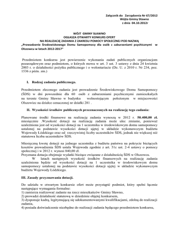 Załącznik do Zarządzenia Nr 67/2012 Wójta Gminy Sławno z dnia 04.10.2012r WÓJT GMINY SŁAWNO OGŁASZA OTWARTY KONKURS OFERT NA REALIZACJĘ ZADANIA Z ZAKRESU POMOCY SPOŁECZNEJ POD NAZWĄ „Prowadzenie Środowiskowego Domu Samopomocy dla osób z zaburzeniami psychicznymi w Olszowcu w latach 2012-2017” Przedmiotem konkursu jest powierzenie wykonania zadań publicznych organizacjom pozarządowym oraz podmiotom, o których mowa w art. 3 ust. 3 ustawy z dnia 24 kwietnia 2003 r. o działalności pożytku publicznego i o wolontariacie (Dz. U. z 2010 r. Nr 234, poz. 1536 z późn. zm.) I. Rodzaj zadania publicznego. Przedmiotem zleconego zadania jest prowadzenie Środowiskowego Domu Samopomocy (ŚDS) w dni powszednie dla 60 osób z zaburzeniami psychicznymi zamieszkałych na terenie Gminy Sławno w budynku wolnostojącym położonym w miejscowości Olszowiec na działce oznaczonej nr działki 281 . II. Wysokości środków publicznych przeznaczonych na realizację tego zadania: Planowane środki finansowe na realizację zadania wynoszą w 2012 r. 50.400,00 zł. miesięcznie .Wysokość dotacji na realizację zadania może ulec zmianie, ponieważ uzależniona jest od wysokości dotacji na 1 uczestnika w środowiskowym domu samopomocy ustalonej na podstawie wysokości dotacji ujętej w układzie wykonawczym budżetu Wojewody Łódzkiego oraz od rzeczywistej liczby uczestników ŚDS, jednak nie większej niż statutowa liczba uczestników ŚDS. Miesięczną kwotę dotacji na jednego uczestnika z budżetu państwa na pokrycie bieżących kosztów prowadzenia ŚDS ustala Wojewoda zgodnie z art. 51c ust. 2-4 ustawy o pomocy społecznej i w 2012 r. wynosi 840,00 zł. Przyznana dotacja obejmuje wydatki bieżące związane z działalnością ŚDS w Olszowcu. W latach następnych wysokość środków finansowych na realizację zadania uzależniona będzie od wysokości dotacji na 1 uczestnika w środowiskowym domu samopomocy ustalonej na podstawie wysokości dotacji ujętej w układzie wykonawczym budżetu Wojewody Łódzkiego. III. Zasady przyznawania dotacji. Do udziału w otwartym konkursie ofert może przystąpić podmiot, który spełni łącznie następujące wymagania formalne: 1) zamierza realizować zadanie na rzecz mieszkańców Gminy Sławno, 2) prowadzi działalność statutową w dziedzinie objętej konkursem, 3) dysponuje kadrą, legitymującą się udokumentowanymi kwalifikacjami, zdolną do realizacji zadania, 4) posiada doświadczenie niezbędne do realizacji zadania będącego przedmiotem konkursu, 5) złoży w terminie prawidłowo ofertę wraz z wszystkimi załącznikami wymienionymi w szczegółowych warunkach konkursu, zgodnie z treścią ogłoszenia o konkursie oraz szczegółowymi warunkami konkursu, Warunkiem rozpatrzenia oferty jest złożenie przez podmiot następujących dokumentów: 1. oferty podmiotu o przyznanie dotacji, zgodnie ze wzorem oferty podmiotu uprawnionego stanowiącym załącznik do rozporządzenia Ministra Polityki Społecznej z dnia 15 grudnia 2010 r. w sprawie wzoru oferty i ramowego wzoru umowy dotyczących realizacji zadania publicznego oraz wzoru sprawozdania z wykonania tego zadania ( Dz. U. z 2011r. Nr 6 , poz. 25) wraz z kompletem wymaganych załączników. 2. sprawozdania merytorycznego i finansowego z działalności podmiotu za ostatni rok lub w przypadku dotychczasowej krótszej działalności za okres tej działalności, 3. aktualnego odpisu potwierdzającego wpis do właściwej ewidencji lub rejestru dotyczącego statusu prawnego podmiotu i prowadzonej przez niego działalności, 4. statutu podmiotu uprawnionego oraz regulaminu organizacyjnego prowadzonej działalności, 5. pełnomocnictwa do składania oświadczeń woli i zawierania umów, o ile nie wynika z innych dokumentów załączonych przez podmiot, 6. programu działalności domu i planów pracy z uczestnikami, 7. opinii banku prowadzącego rachunek oferenta, potwierdzającej brak zajęcia środków z jakiegokolwiek tytułu egzekucyjnego( wystawione nie wcześniej niż 3 miesiące przed upływem terminu składania ofert), 8. listy osób realizujących zadanie wraz z opisem ich kwalifikacji. Oferta oraz wszystkie wymagane dokumenty muszą być podpisane przez osoby, uprawnione do reprezentowania danego oferenta i składania oświadczeń woli w jego imieniu, zgodnie z wyciągiem z Krajowego Rejestru Sądowego lub odpowiednio innego dokumentu . W przypadku istnienia upoważnień do podpisywania dokumentów (lub określonych rodzajów dokumentów) upoważnienia winny być dołączone do oferty. Jeżeli osoby uprawnione nie dysponują pieczątkami imiennymi obok podpisów należy dopisać czytelnie imię i nazwisko wraz z podaniem pełnionych przez nich funkcji. Do oferty mogą być załączone dodatkowe rekomendacje lub opinie o oferencie lub o przedkładanym projekcie. Wzoru oferty nie można modyfikować. Oferta złożona na innym niż wymieniony w załączniku nr 1 druku, niekompletna, nieprawidłowo wypełniona lub złożona po terminie, zostanie odrzucona z przyczyn formalnych. Niezbędne do złożenia oferty druki, a także wzór umowy i sprawozdania z wykonania zadania publicznego można otrzymać w Urzędzie Gminy w Sławnie pok. Nr 7 od poniedziałku do piątku, w godzinach od 7.30 – 15.30. Oferent ponosi wszelkie koszty związane z przygotowaniem i złożeniem oferty. Szczegółowe warunki przyznania dotacji na realizację zadania, tryb płatności, sposób rozliczenia udzielonej dotacji, zostaną określone w umowie zawartej na podstawie art. 15 ust. 4 i art. 16 ust. 1 – 6 ustawy z dnia 24 kwietnia 2003r. o działalności pożytku publicznego i o wolontariacie( Dz.U. z 2010.r Nr 234 poz. 1536 z późn. zm.) oraz w rozporządzeniu Ministra Pracy i Polityki Społecznej z dnia 15 grudnia 2010 r. w sprawie wzoru oferty realizacji zadania publicznego, ramowego wzoru umowy o wykonanie zadania publicznego i wzoru sprawozdania z wykonania tego zadania (Dz. U. z 2011r. Nr 6 poz. 25